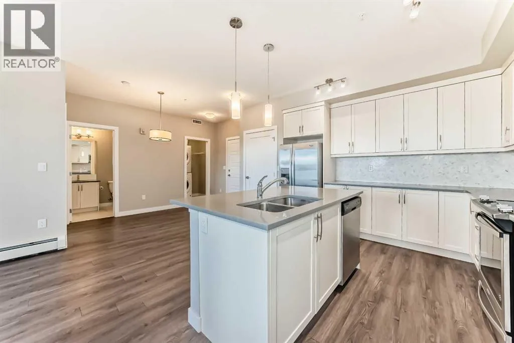 Welcome to this stunning and impeccably designed 2-bedroom, 2-bathroom condo in the heart of Auburn Bay â where modern elegance meets effortless comfort. Offering 832 sq. ft. of beautifully crafted living space, this sun-filled home features an open-concept layout with large windows and a west-facing balcony capturing breathtaking Rocky Mountain views. The gourmet kitchen boasts sleek quartz countertops, contemporary cabinetry, and abundant storage, perfect for the inspired home chef. The spacious primary suite includes a luxurious walk-in closet with built-in organizers and a private ensuite, while the second bedroom offers versatility for guests or a stylish home office. Enjoy the convenience of in-suite laundry, year-round comfort with air conditioning, and secure titled underground parking. As part of the vibrant Auburn Bay community, residents enjoy exclusive lake access with year-round activities such as swimming, paddleboarding, fishing, and skating, plus first-class amenities including recreation centres, tennis courts, a fitness facility, and more. Ideally located close to premier shopping, dining, schools, and parks â this extraordinary home offers the perfect blend of lifestyle, luxury, and location. (id:27476)