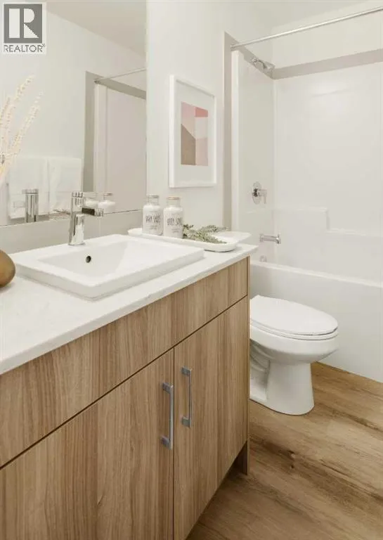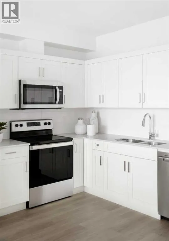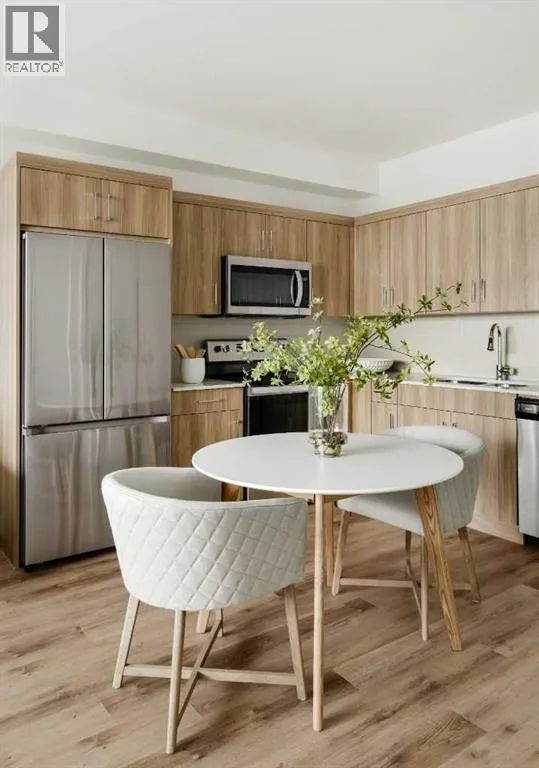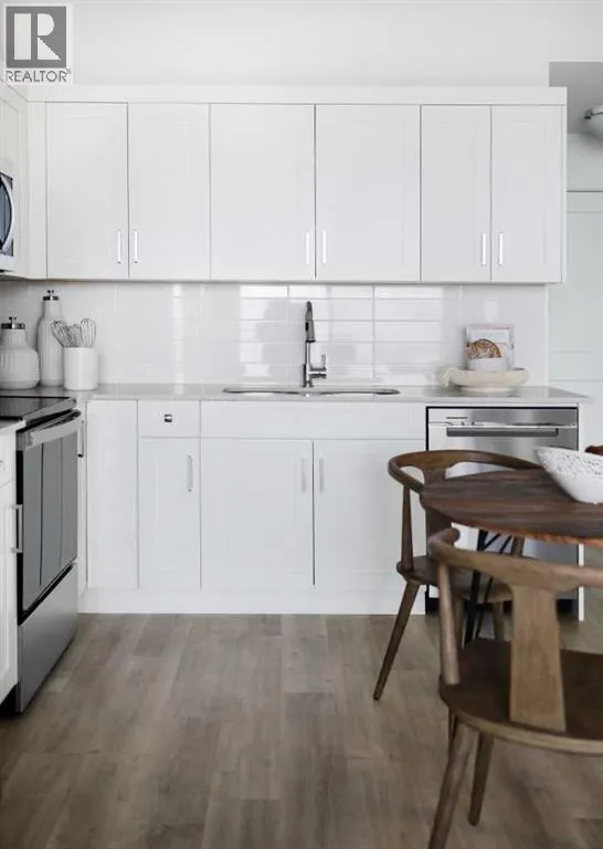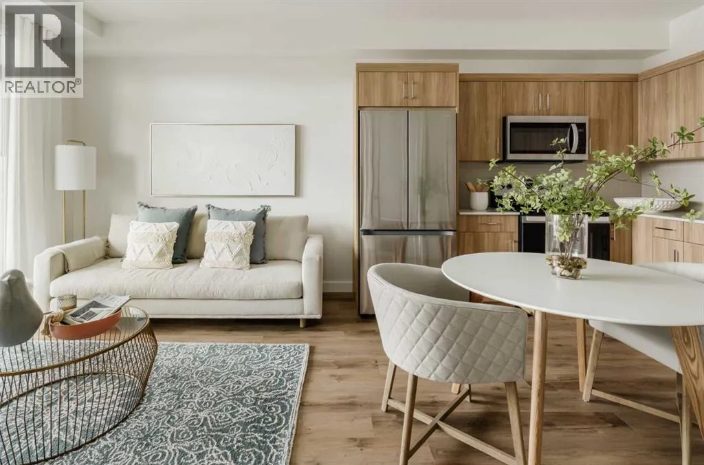 Welcome to the Curnoe 2 by Logel Homesâa well-designed unit featuring full-height cabinet fronts, quartz countertops, luxury vinyl plank flooring throughout, and tile in the bathroom. The upgraded kitchen includes a modern backsplash, a premium sink and faucet, and comes with stainless steel appliances. Enjoy year-round comfort with air conditioning, plus the convenience of an in-suite washer and dryer. Nine-foot ceilings and large windows provide plenty of natural light. This home includes a titled parking stall and is backed by the Alberta New Home Warranty. Located close to shopping, public transit, and major routes like Deerfoot and Stoney Trail, it offers easy access across the city. With affordable condominium fees, this is a great opportunity to own a well-appointed home in a convenient location. (id:27476)