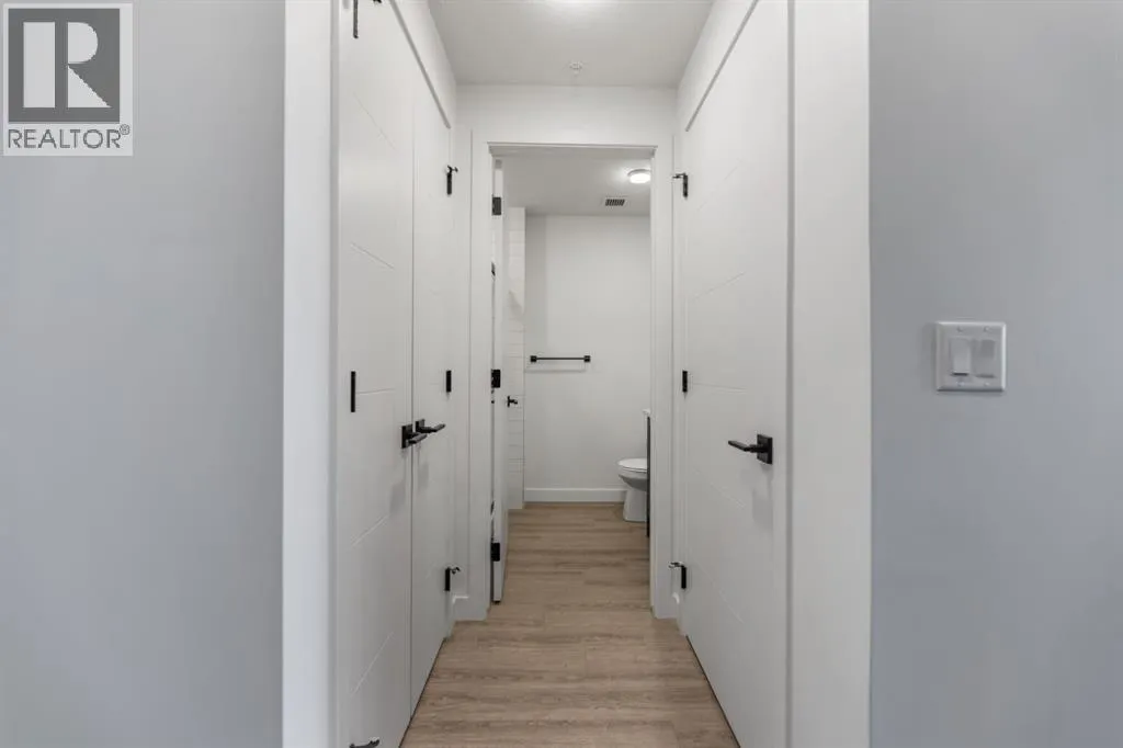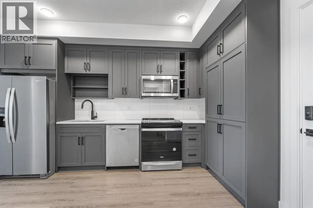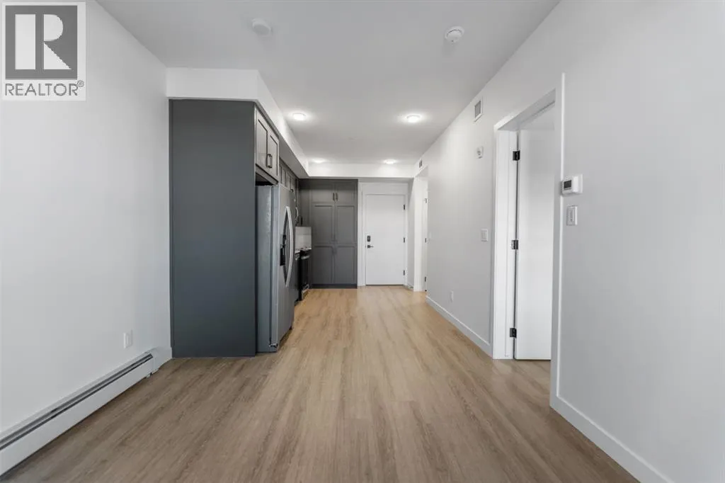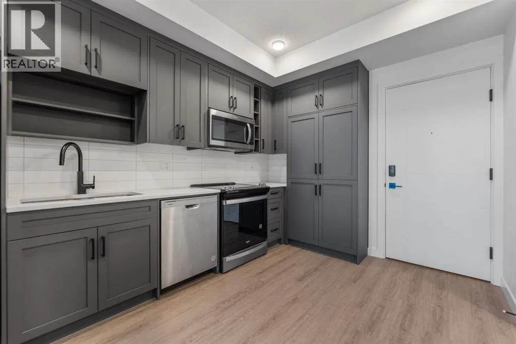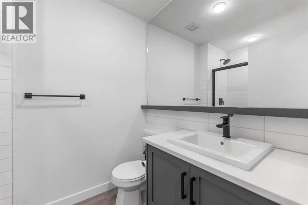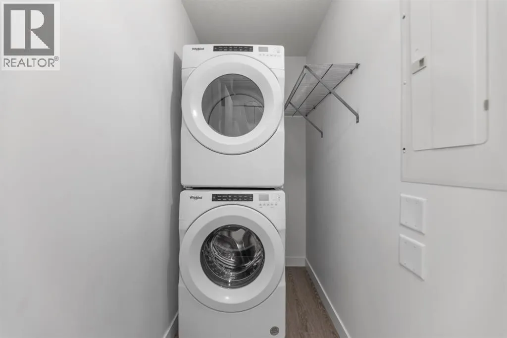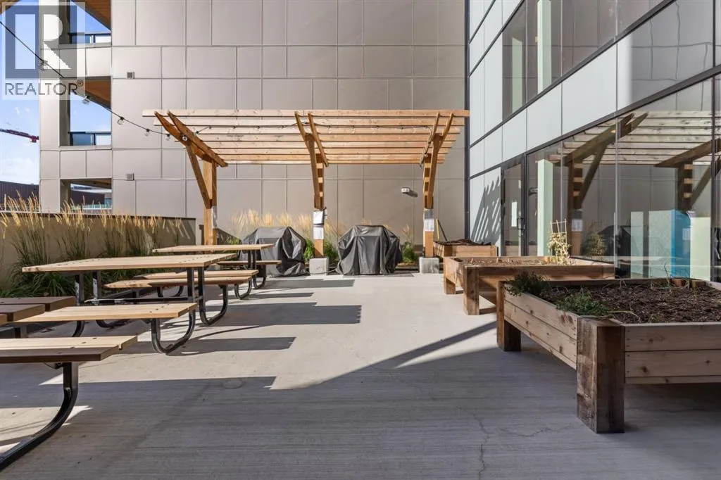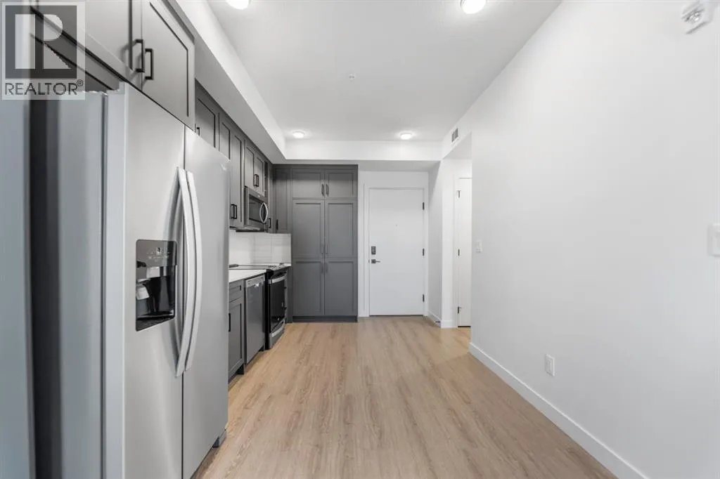 This bright and modern 1 bedroom 1 bathroom condo is located in the heart of Calgaryâs University District. It features an open layout with 9â ceilings, vinyl plank flooring, quartz countertops, stainless steel appliances and a spacious in-suite laundry area. The kitchen has beautiful shaker-style cabinets with soft-close drawers while the bathroom offers a glass-enclosed shower with a built-in bench. The bedroom includes a walk-in closet and the private balcony is perfect for relaxing or BBQs with a gas line already hooked up. Youâll also find great extra touches like AC rough-in, roller shades and sleek LED lighting throughout.The building includes amazing amenities such as a fully equipped gym, ownersâ lounge, party room, meeting space, outdoor terrace and a community garden.Youâre steps from great restaurants, grocery stores and theatres plus walking distance to the University of Calgary and just minutes from the Childrenâs Hospital, Foothills Hospital and Market Mall shopping centre.A perfect spot if youâre looking for something modern, low maintenance and close to everything in one of Calgaryâs best newer communities. (id:27476)