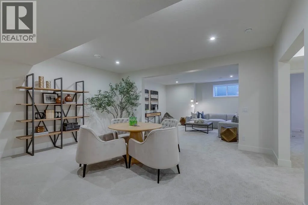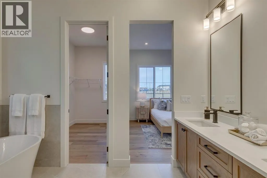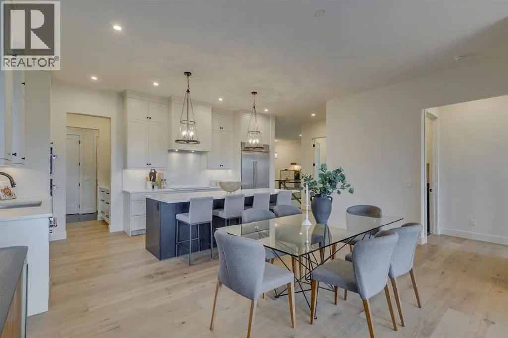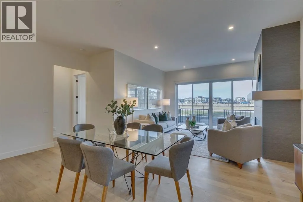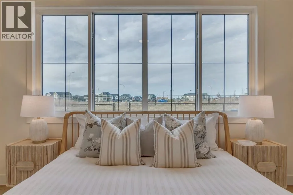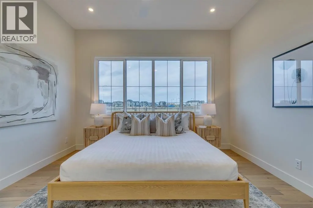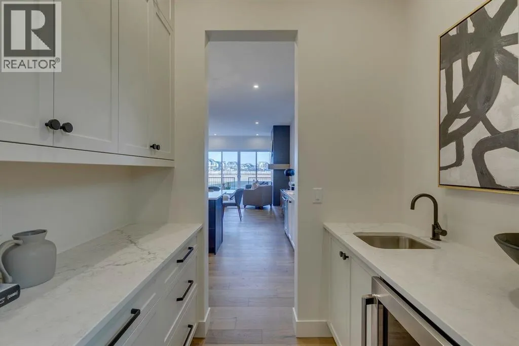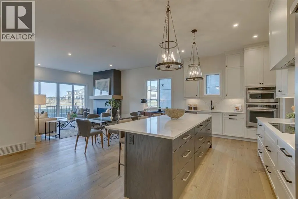 OPEN HOUSE THIS SUNDAY, NOVEMBER 16th FROM 1:00 - 4:00 PM........Nestled in the heart of Calgary's prestigious Mahogany Estates, this brand-new custom-built, 3,200 sq ft bungalow by Baywest Homes redefines lakeside living. With exclusive access to a semi-private dock and beach, this home offers an unparalleled lifestyle in one of the city's most sought-after lake communities. The main level, spanning nearly 1,700 square feet, boasts soaring nine-foot ceilings and wide plank luxury hardwood flooring in natural wood tones, creating a warm and inviting ambiance. The open-concept design seamlessly integrates the living, dining, and kitchen areas, making it perfect for both entertaining and everyday living. The kitchen is a chef's dream, featuring full-height white cabinetry, a striking oversized dark island, and a high-end appliance package that includes a high-end Kitchen Aid fridge-freezer and built-in oven with a convention microwave. Quartz countertops extend as a sleek backsplash, complemented by designer lighting and a butlerâs pantry equipped with a bar sink and beverage fridge. The living room, with its elegant feature fireplace, opens onto a north-facing deck overlooking serene green space, complete with a gas line for effortless outdoor grilling. The master suite is a private retreat, offering a spa-like en-suite with heated tile floors, an oversized shower, a freestanding soaker tub, dual vanities, and a private water closet. A spacious walk-in closet and adjacent laundry room add to the convenience and luxury of this space. The main floor also includes a private office with glass French doors, a well-appointed mudroom, and a walk-in closet. Descending to the fully finished basement, you'll find a large recreation room, a family room, two generously sized bedrooms, and a full bathroom with heated floors. The home is thoughtfully designed with ample storage and numerous upgrades, including tankless hot water and triple-paned windows. The attached triple garage , with its 14-foot ceilings, offers ample space for a car lift and is equipped with 220V for a vehicle charging station. This property is a masterpiece of design and functionality, offering the perfect blend of luxury, comfort, and convenience. With its prime location and exclusive amenities, lakeside living in Mahogany has never been more enticing. (id:27476)