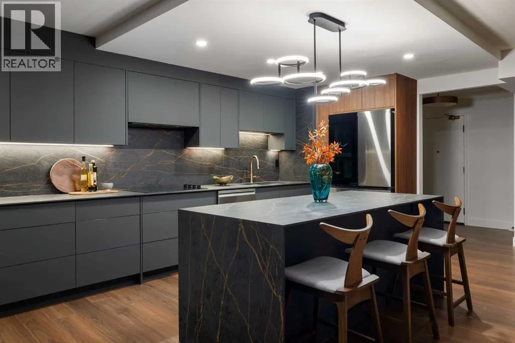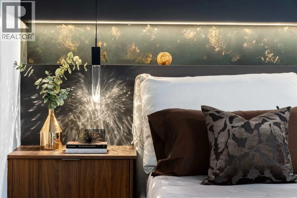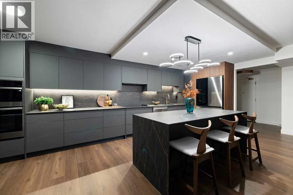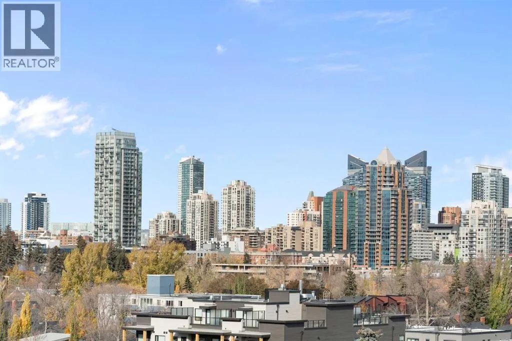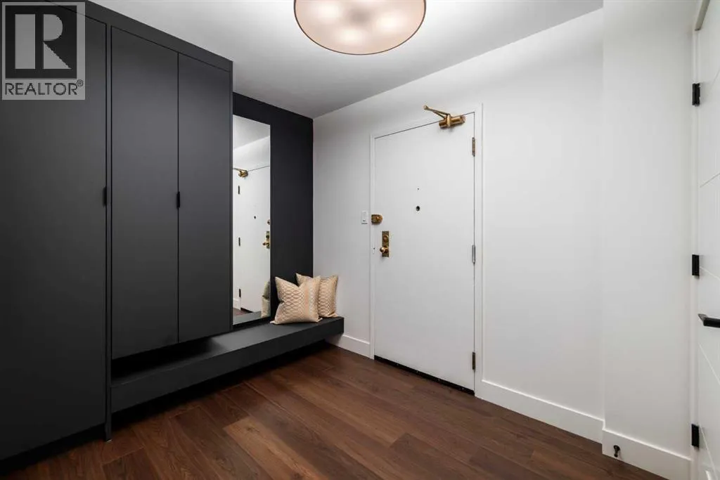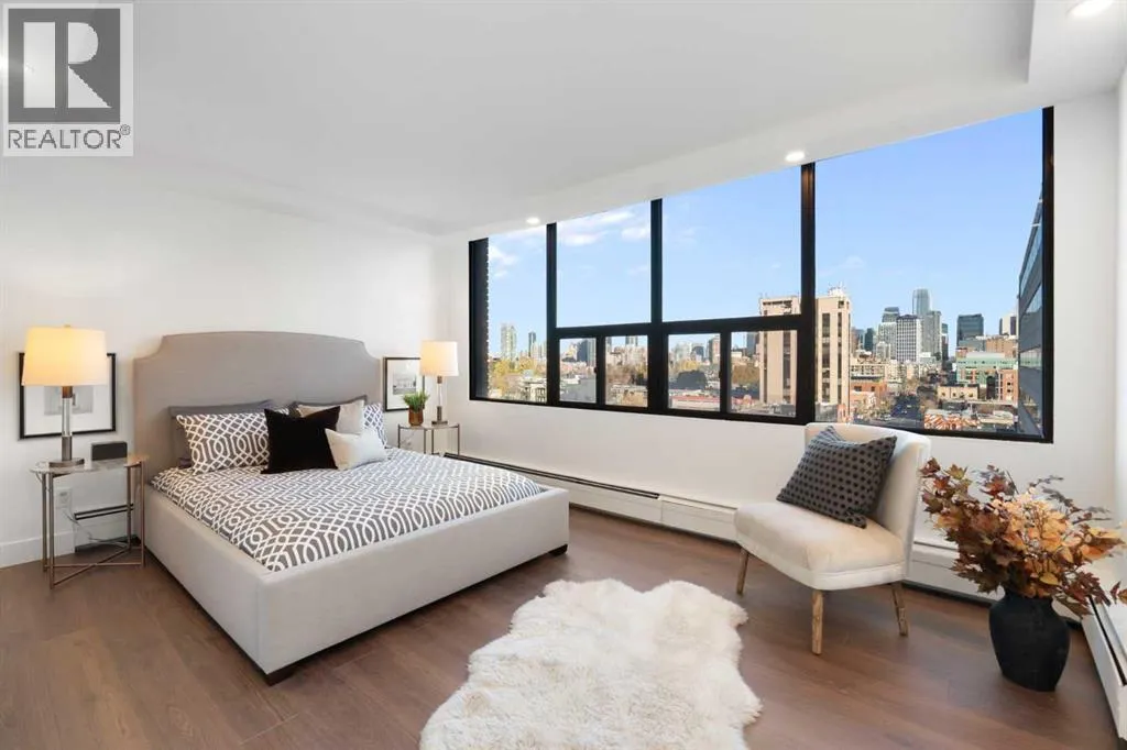 If youâre seeking elevated urban living in Calgary, this stunningly updated corner suite at Roxboro House in Calgary's MIssion district delivers sophistication, style, and sweeping city and river views.Beautifully reimagined with a modern open-concept design, this home is ideal for both daily living and entertaining. The showstopping kitchenfeatures custom-built cabinetry crafted from premium materials, including Dekton countertops with a waterfall island, a stylish appliance package with wall oven, and a Zephyr wine cooler. The layout easily accommodates both a formal dining area and a welcoming living room, each framed by breathtaking downtown vistas.The den offers an inspiring setting to work from home by day and a cozy retreat by night, softly illuminated by the glow of city lights. A luxurious three-piece bathroom showcases striking 2x4 tilework and refined fixtures. A sleek laundry closet is discreetly tucked away for convenience. The principal bedroom comfortably fits a king-sized bed and features an artist hand-painted feature wall with gold accents, adding a touch of bespoke elegance to the serene atmosphere. Enjoy tranquil river and mountain views complimented by the vibrancy of the city. A walk-in closet and beautiful four-piece ensuite complete this restful retreat. The second bedroom is equally impressive, offering a dramatic downtown skyline view. Step onto the private deck from the living or dining area and take in the ever-changing cityscape. Design details throughout include Delta faucets, statement lighting furnished by Cartwright Lighting, and luxury Coretec vinyl plank flooring, blending comfort and high design seamlessly.Roxboro House remains one of Calgaryâs most distinguished addresses, offering 24-hour concierge and security, premium amenities including a pool, fitness centre, and social spaces, and an unbeatable riverfront location in the heart of Mission. This residence includes ample in-suite storage, a secure locker, and convenient pa rking, all accessible by two elevators.Enjoy effortless walkability to parks, pathways, groceries, and Calgaryâs finest dining and boutique shopping. Every detail of this exceptional home has been curated to offer refined comfort, style, and distinctionâthe ultimate expression of urban chic living (id:27476)