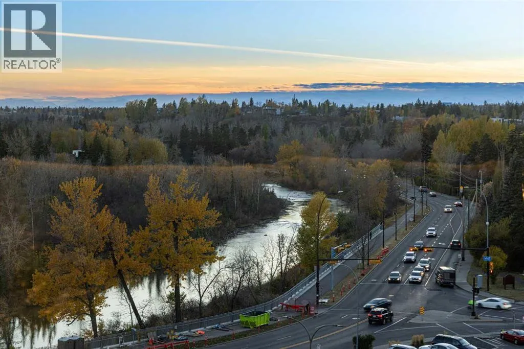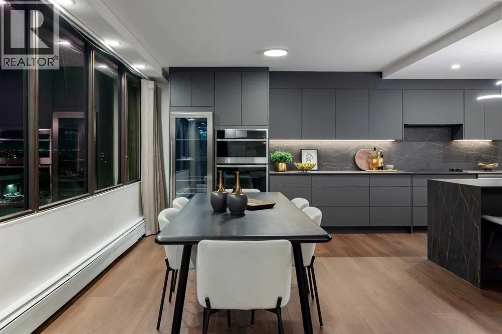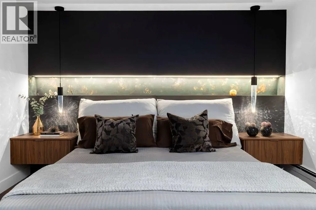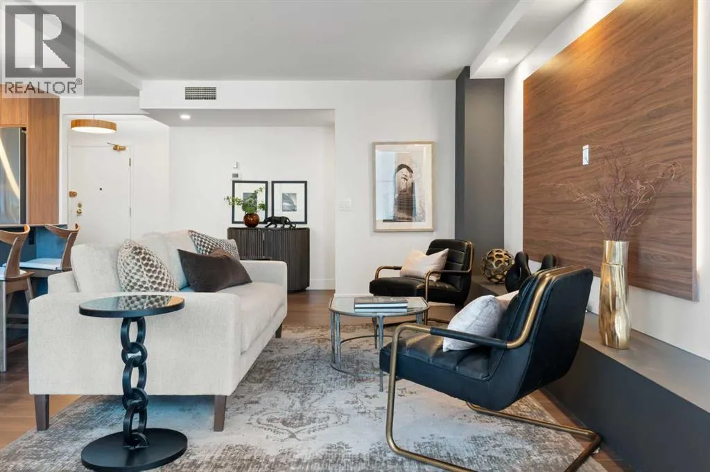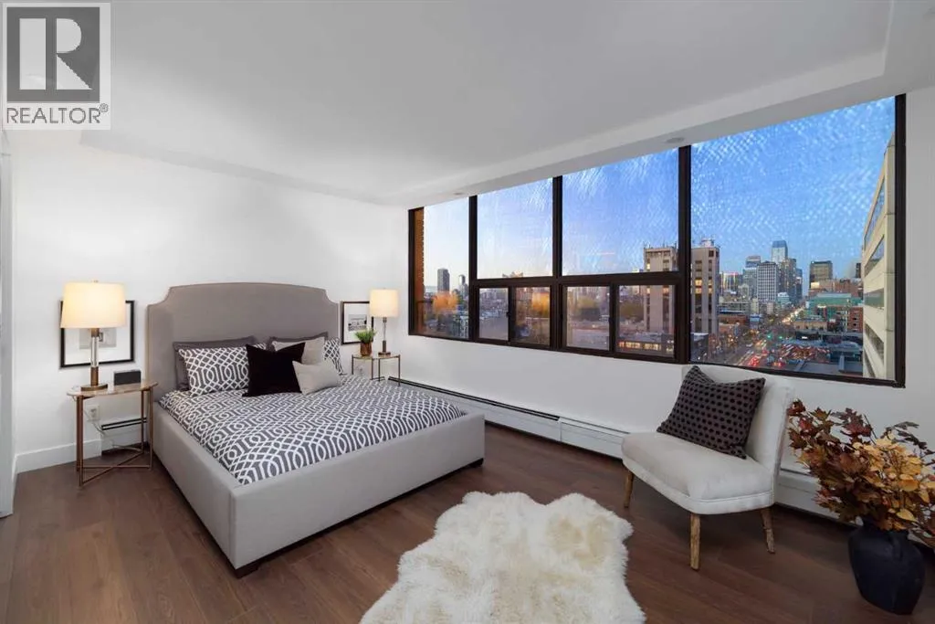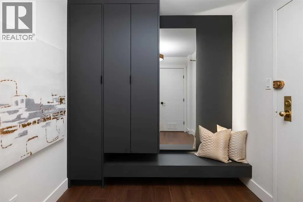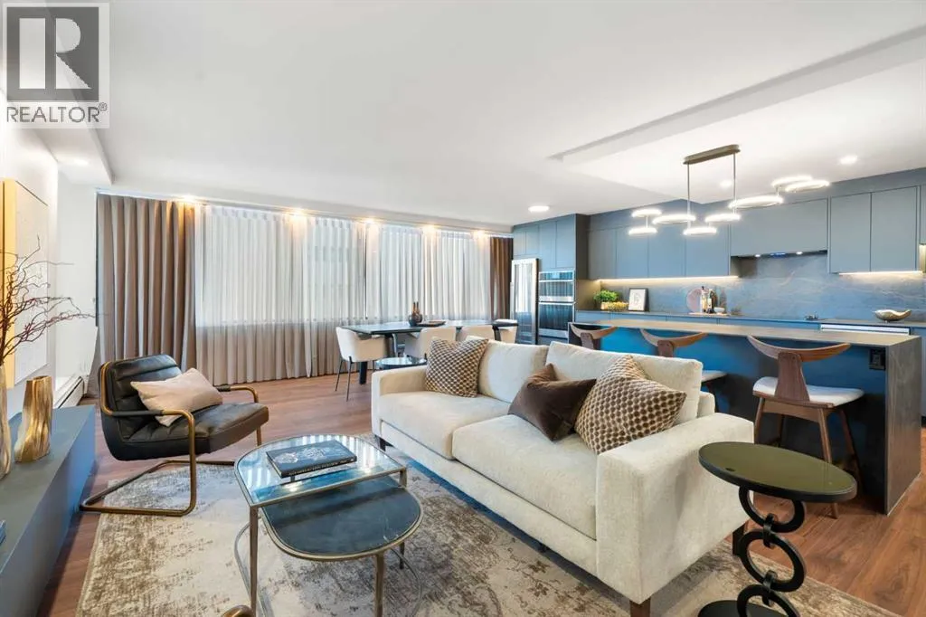 If youâre seeking elevated urban living in Calgary, this stunningly updated corner suite at Roxboro House in Calgary's MIssion district delivers sophistication, style, and sweeping city and river views.Beautifully reimagined with a modern open-concept design, this home is ideal for both daily living and entertaining. The showstopping kitchenfeatures custom-built cabinetry crafted from premium materials, including Dekton countertops with a waterfall island, a stylish appliance package with wall oven, and a Zephyr wine cooler. The layout easily accommodates both a formal dining area and a welcoming living room, each framed by breathtaking downtown vistas.The den offers an inspiring setting to work from home by day and a cozy retreat by night, softly illuminated by the glow of city lights. A luxurious three-piece bathroom showcases striking 2x4 tilework and refined fixtures. A sleek laundry closet is discreetly tucked away for convenience. The principal bedroom comfortably fits a king-sized bed and features an artist hand-painted feature wall with gold accents, adding a touch of bespoke elegance to the serene atmosphere. Enjoy tranquil river and mountain views complimented by the vibrancy of the city. A walk-in closet and beautiful four-piece ensuite complete this restful retreat. The second bedroom is equally impressive, offering a dramatic downtown skyline view. Step onto the private deck from the living or dining area and take in the ever-changing cityscape. Design details throughout include Delta faucets, statement lighting furnished by Cartwright Lighting, and luxury Coretec vinyl plank flooring, blending comfort and high design seamlessly.Roxboro House remains one of Calgaryâs most distinguished addresses, offering 24-hour concierge and security, premium amenities including a pool, fitness centre, and social spaces, and an unbeatable riverfront location in the heart of Mission. This residence includes ample in-suite storage, a secure locker, and convenient pa rking, all accessible by two elevators.Enjoy effortless walkability to parks, pathways, groceries, and Calgaryâs finest dining and boutique shopping. Every detail of this exceptional home has been curated to offer refined comfort, style, and distinctionâthe ultimate expression of urban chic living (id:27476)