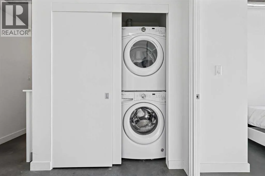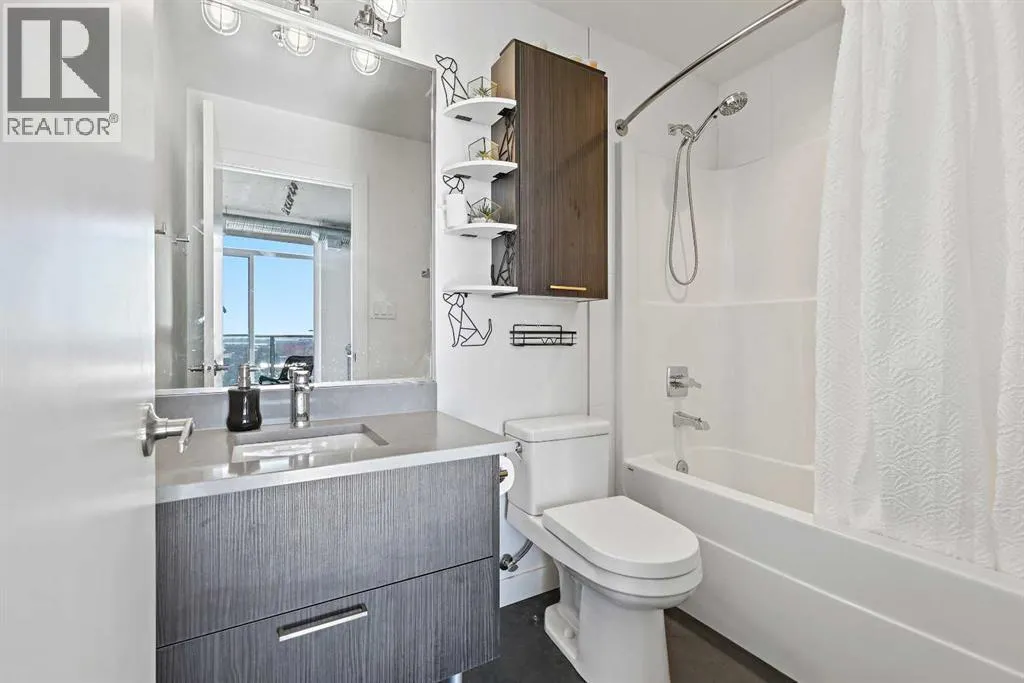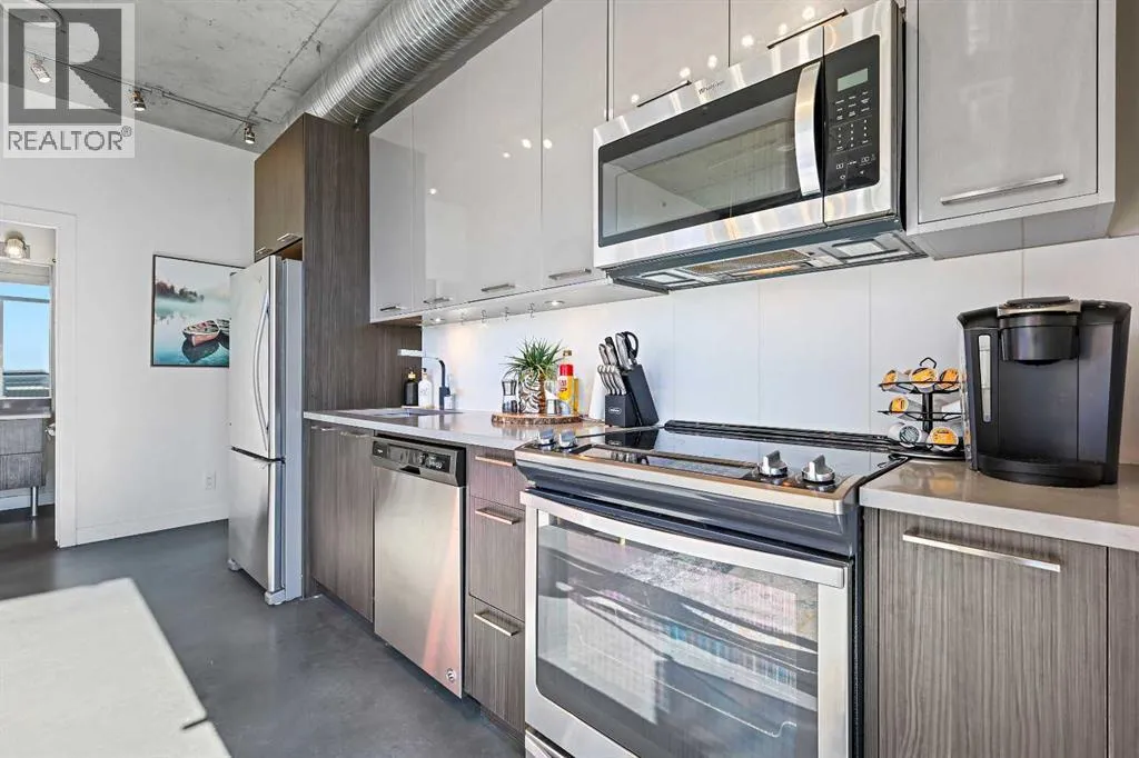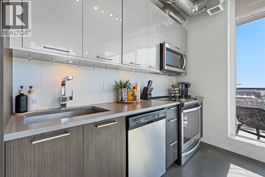 Experience modern city living at its best in this stylish 2-bedroom, 1-bath corner unit at INK by Battistella, perfectly positioned in Calgaryâs vibrant East Village. Whether youâre a first-time buyer, a savvy investor, or a downsizer, this home delivers the perfect blend of bold design, intelligent functionality and unbeatable location. Perched on the 11th floor and quietly set at the end of the hall, this pet-friendly, short-term rental approved condo showcases an industrial-chic aesthetic with polished concrete floors, exposed ductwork, and soaring 9.5â windows that fill the space with natural light. The sleek kitchen features quartz countertops, high-gloss cabinetry, and stainless-steel appliances, opening seamlessly into a bright, open living area thatâs perfect for entertaining or relaxing. Two well-separated bedrooms offer versatility for a roommate setup, guest room, or home office, while the modern 4-piece bath adds a touch of everyday luxury. Step out onto your wrap-around balcony to take in breathtaking south-facing views of the Calgary Tower, Stampede Grounds, and downtown skylineâan ideal backdrop for morning coffee, evening sunsets, and Stampede fireworks. Additional perks include in-suite laundry, titled underground parking, storage locker, and impressive building amenities such as a rooftop patio, penthouse recreation room, bike storage, visitor parking, and a pet wash station. From your doorstep, enjoy easy access to the C-Train, Studio Bell, Superstore, cafés, parks, the Saddledome, and the Bow River pathways. This is your opportunity to live or invest in one of Calgaryâs most dynamic and walkable urban communities. (id:27476)
