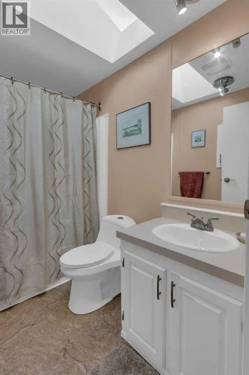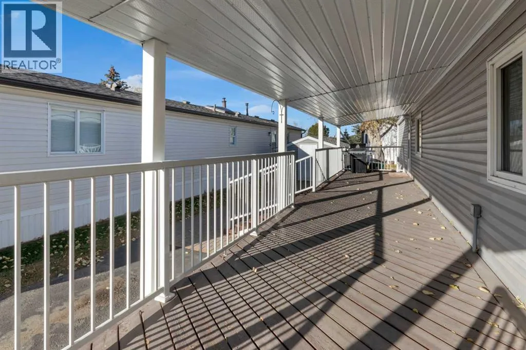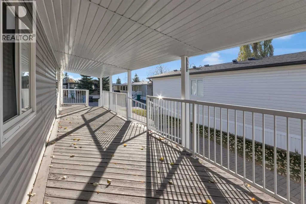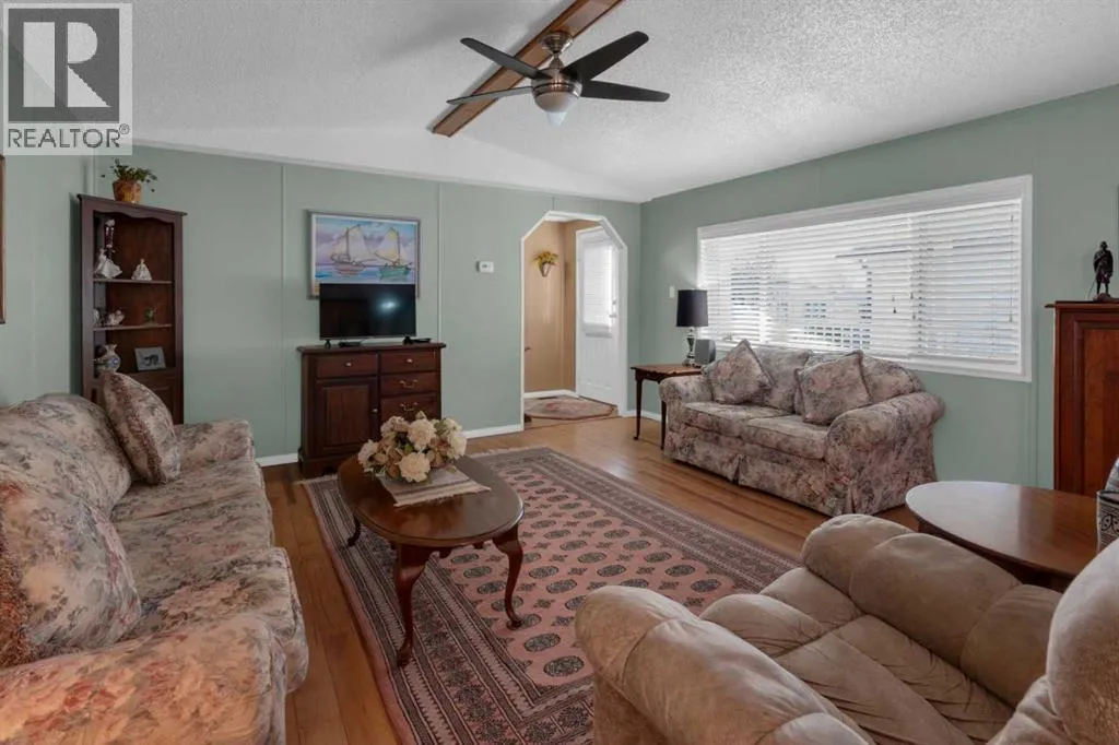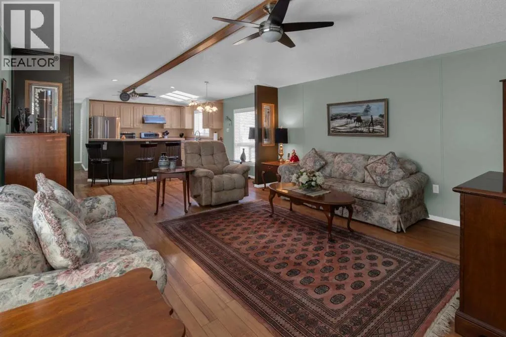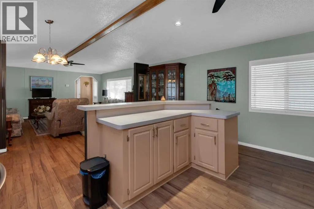 Welcome to this great mobile home in Watergrove, the premiere 45+ mobile home park in Calgary, boasting a fabulous clubhouse, outdoor pool, sauna, recreation room/party room, pool tables, and enough activities to keep you busy every single day! This 3 bed, 2 bath home with central A/C has been lovingly cared for and it shows. The spacious kitchen has a large breakfast bar, a generous amount of cabinetry, stainless appliances, a large dining area, and a skylight to bring in the sunshine. The living room easily accommodates a variety of furniture options and is accented by a vaulted beamed ceiling. This open floorplan offers two bedrooms and a full bath at this end of the home, with the large primary bedroom at the opposite end. The primary bedroom has a 4 pce ensuite and a large walk-in closet. This home has had many upgrades throughout the years as follows: 2016 hot water tank, new chimney replacement, 2017 new siding, skirting, asphalt application on the driveway and relevelled, 2018 Removal of Poly B to Pex waterlines, and a brick pathway to the shed. 2019 roof upgrade (repair and replace new shingles as required), skylights, deck expansion with roof addition. This home has modern touches with wide-plank laminate flooring, a spacious foyer, and a large living room window to bring in natural light, giving a bright, spacious feel. Located in a great location, with lovely curb appeal, close to the greenspace, and in an amenity filled community â this home is just waiting for its new owner. Nearby Crowfoot Centre provides every amenity you can imagine. Immediate possession available. Lot fee of $860 includes water/sewer, garbage pickup and recycling. Lease and pet approval is required. (id:27476)