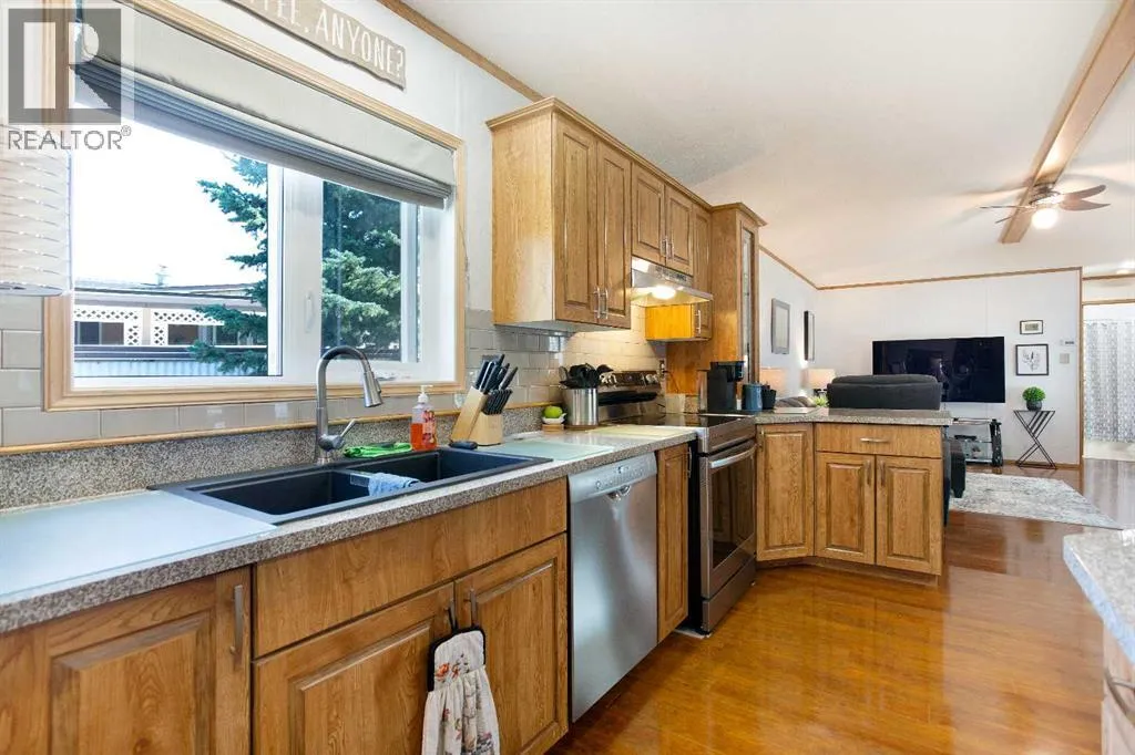 Don't miss this home it is priced to sell. Pride of ownership is very evident in this home. Pride of ownership is very evident in this home. Regent Mobile Home ( 16 x 66) in the Watergrove Mobile Home Park. The monthly lot rent of $860. Situated in a quiet Area of the Park. Home has been very well maintained. This home is move in ready. 2 Large bedrooms, 4 pc main bath. Large Master bedroom with a 4 pc ensuite bathroom and walk in close (6'5" x 5'2"), Large Kitchen. comes with Stove , Fridge, Water Softener, Dishwasher, Washer and Dryer. and lots of cabinets, Good sized Dining Room, Large Living Room, Laundry Room off Kitchen. Windows were replaced in June 2021 with Triple Pane windows. Furnace replaced in 2016, 50 gallon Hot water tank replaced in 2020, Fridge, Stove, Bosch Dishwasher, Hood Fan replaced in 2021. Comes with upgraded blinds , Laminate flooring . Covered Carport , Shed (14' x 10'). Deck is 17' x 7' with porch , Covered carport with 2 skylights. Good size yard . Close to the Park facilities. This mobile home is situated in Watergrove Mobile Home Park in Arbour Lake. This park is a 45+ park. Pets need approval from Park and must be 15 inches to the hip or less. Close to all amenities. includes water, sewer, recycling, garbage pickup, plus all clubhouse amenities. These amenities include outdoor heated seasonal swimming pool, indoor hot tub, sauna, billiards/games room, library and much much more! Easy access to the Arbour Lake LRT, many Crowfoot businesses, clinics, restaurants, grocery stores, and much much more! Easy access to Stoney Trail. Realtor lives in the Park so easy to show (id:27476)