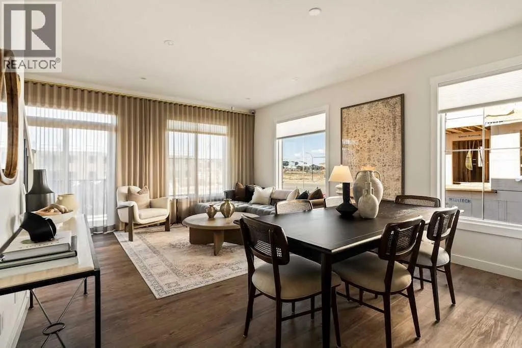 The brand new âHolidayâ model by Brookfield Residential is now available in the vibrant community of Livingston! This brand-new END-UNIT townhome blends contemporary design with everyday functionality, offering over 1,400 sqft, 3 bedrooms, 2.5 bathrooms, a ground-floor flex/office space, and a private double attached garage - all in one of north Calgaryâs most desirable master-planned neighbourhoods. The open-concept main floor showcases a timeless kitchen featuring full-height cabinetry, elegant quartz countertops, a built-in hood fan and microwave, and a premium stainless-steel appliance package. The oversized island with pendant lighting provides the perfect place for casual dining or entertaining. The kitchen flows seamlessly into the bright living and dining areas, highlighted by a wall of windows that flood the space with natural light. Enjoy extra windows and additional natural light - a perk of owning the end-unit townhome! Step out onto your private West-facing balcony - ideal for summer BBQs or a morning coffee while providing optimal sunshine all year long. A large laundry room with additional storage and a convenient 2-piece powder room complete the main level. The upper level features a spacious ~11â x 12â primary suite which includes a walk-in closet and a private ensuite with walk-in shower, offering a relaxing retreat at the end of the day. Two additional bedrooms and a full bathroom complete the upper floor, providing plenty of room for family, guests, or a home office. On the lower level, a versatile den off the entryway and private double attached garage offers endless flexibility - the perfect space for a home office, gym, or creative space. The private double attached garage keeps your vehicles warm and secure all year long. This home includes numerous upgrades such as central A/C rough-in, a BBQ gas line + gas line to the kitchen range, 42â upper cabinets, and an enhanced interior selections package. Backed by both Brookfieldâs comprehensive bu ilder warranty and Alberta New Home Warranty, this property offers complete peace of mind. Set in Livingston, a dynamic north Calgary community known for its impressive Homeowners Association, state-of-the-art Hub facility, parks, playgrounds, and convenient access to major routes - this is the perfect place to call home. If youâre looking for a low-maintenance townhome that combines style, functionality, and quality craftsmanship - welcome to the Holiday by Brookfield Residential in Livingston. *Please note: Photos are for representation purposes only and exact finishes may vary. (id:27476)