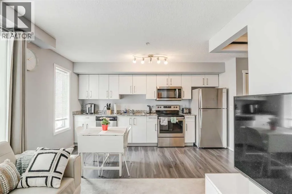Welcome to this well maintained, single-level apartment in the highly desirable Skyview community! This inviting unit features a spacious primary bedroom, perfect for relaxation, and a versatile second bedroom/den with sliding doorsâideal for a home office or guest room. The south facing modern kitchen comes fully equipped with updated appliances and abundant cabinet space, seamlessly flowing into the combined dining and living areaâan excellent setting for both entertaining and everyday comfort. Step out onto your private balcony to enjoy morning coffee, unwind in the evening, or simply take in the fresh air. For your convenience, this unit includes a titled underground parking stall(#415), ensuring your vehicle's safety and security. Additional amenities include in-suite laundry, access to a well-equipped gym, and a party room for gatherings. Located close to major routes, public transit, schools, and various amenities, this home offers an unmatched lifestyle of ease and comfort. Donât miss the chance to make this charming retreat yoursâcontact your favorite realtor today! (id:27476)