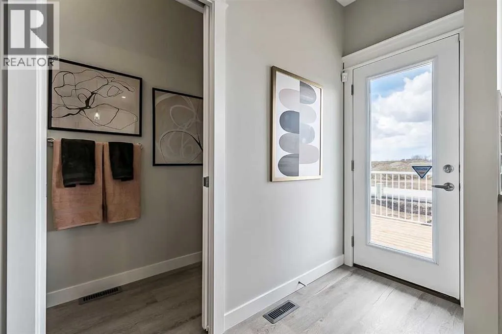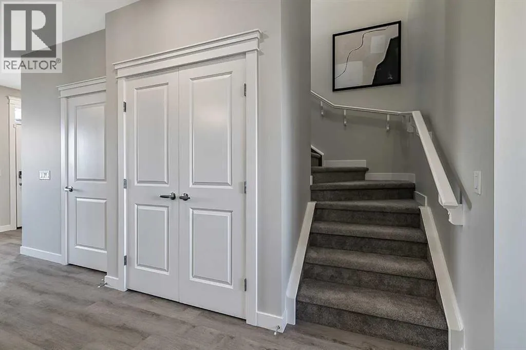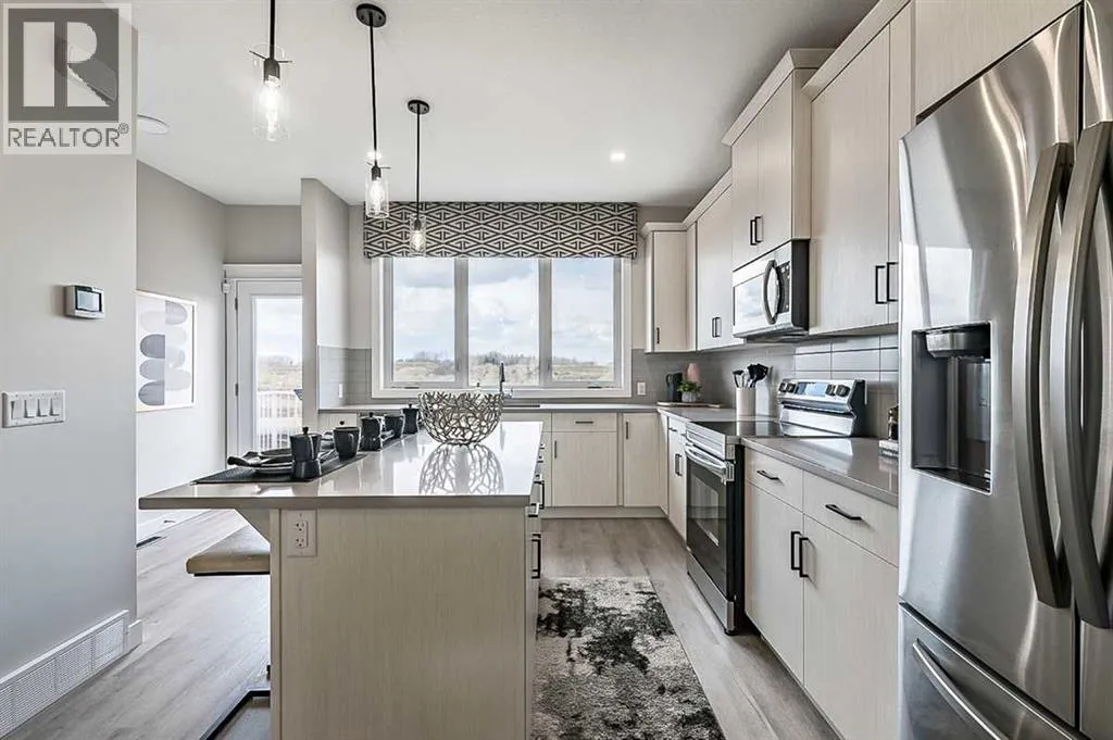 This 1,700 sq ft townhome in Vermilion Hill offers a balanced combination of space, function, and location. Designed with modern finishes and a double detached garage, the home features an open-concept main floor with high ceilings and large windows for natural light. The entryway includes built-in storage and connects to a kitchen equipped with stainless steel appliances, quartz countertops, and a central island. The upper level includes a primary bedroom with a walk-in closet and ensuite, two additional bedrooms, and a loft providing flexible living options. The property is situated approximately 20 minutes from downtown Calgary and within minutes of major amenities such as Costco. Mountain and downtown views contribute to the appeal of the area, which is known for its accessibility and new community design. Renderings and photos are representative. (id:27476)