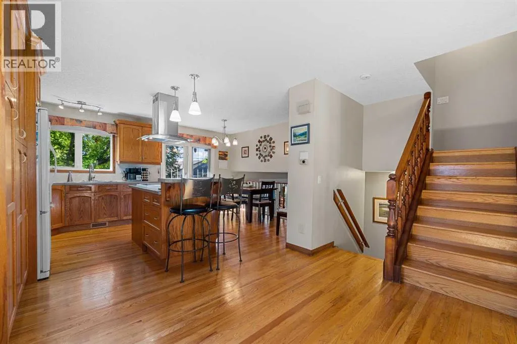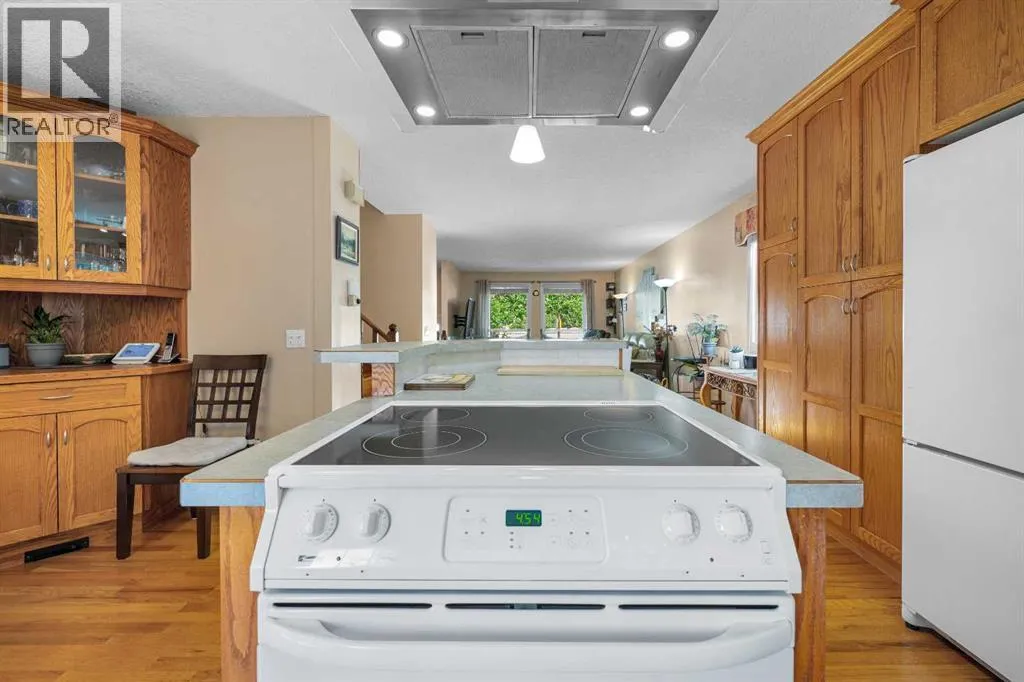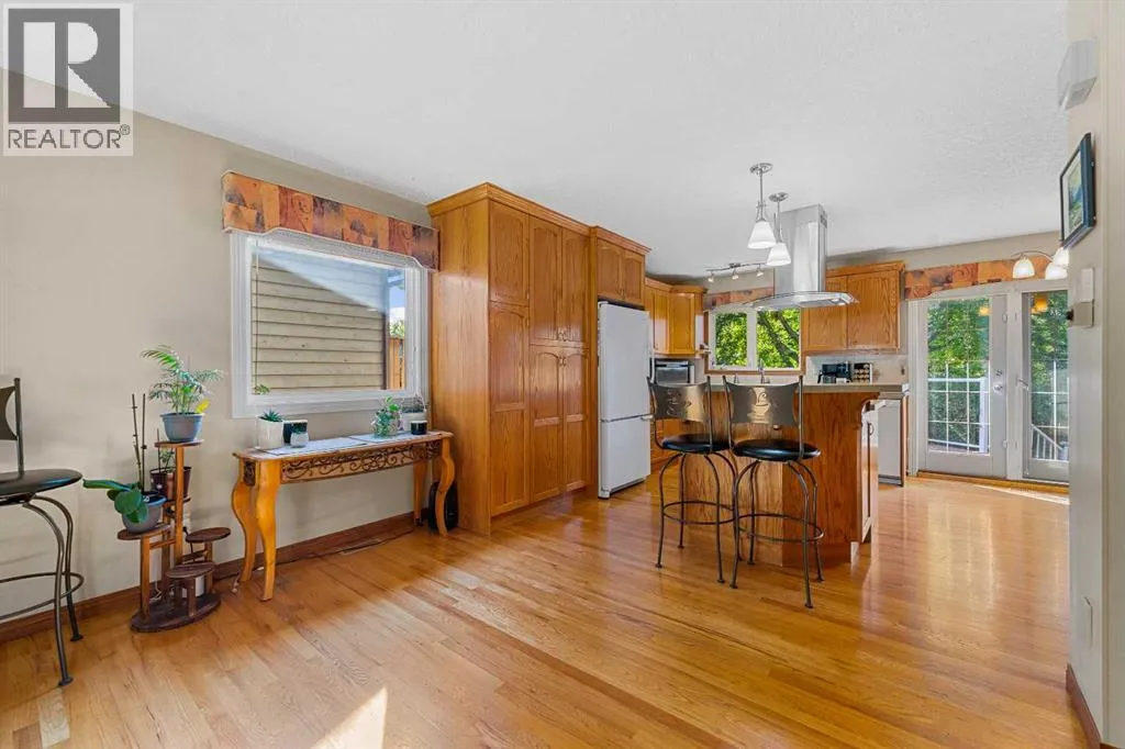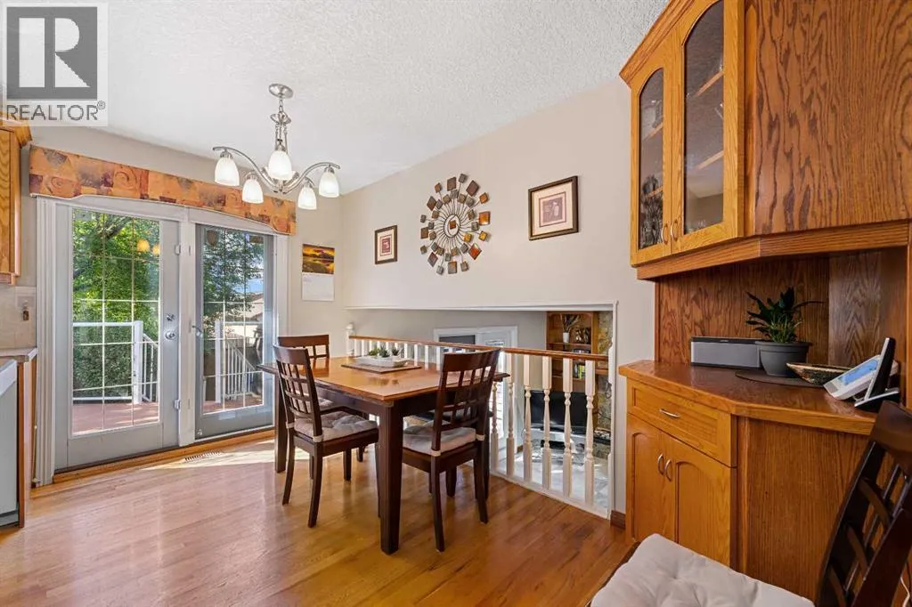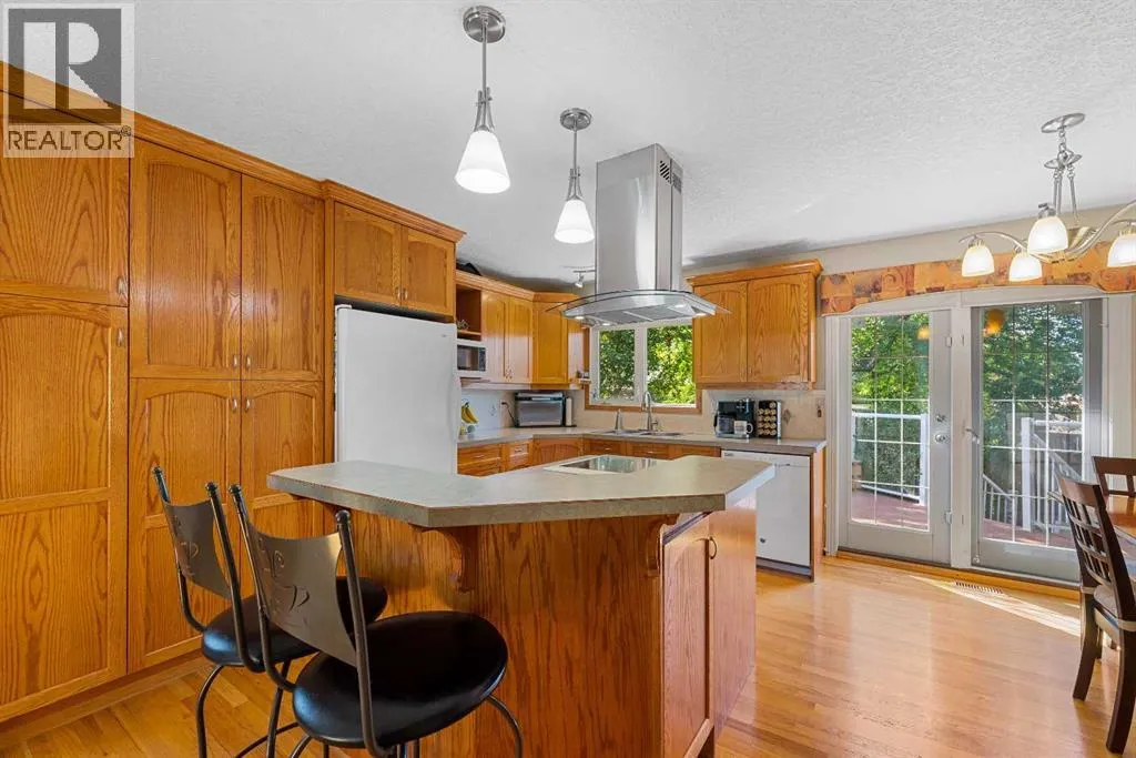 OPEN HOUSE SATURDAY NOVEMBER 15, 1:30 - 4 PM. Step inside this bright and beautifully reconfigured 4-level split, where thoughtful updates and inviting living spaces create the perfect blend of comfort and style. Youâll love the real hardwood floors, updated lighting, and newer windows that fill every room with natural light. Elegant French doors add a touch of sophistication and seamless flow throughout the home.The open-concept oak kitchen is an entertainerâs dream, featuring a center island with eating bar, ample cabinetry with built-in pot drawers, a pantry, and a charming corner china cabinet that enhances the adjacent dining area.Retreat to the spacious primary suite, complete with double closets and a beautifully updated ensuite showcasing a large tiled stand-up shower and stone countertopsâyour own private spa experience.The walkout level, open to the dining area above, offers a cozy family space with a built-in feature wall and wood-burning fireplace, plus direct access to the attached garage.Step through the French doors to your west-facing backyard oasisâprivate, treed, and professionally landscaped. Enjoy outdoor living on the two-level Dura Deck, accessible from both the dining and family roomsâperfect for morning coffee or evening gatherings.A large shed with alley access features an oversized garage-style door, ideal for storing outdoor equipment, quads, or snowmobiles. The parking pad easily accommodates up to a 22-foot trailer, and both the house and shed feature new asphalt shingles for peace of mind.Downstairs, the spacious recreation room offers plenty of storage, including a crawl space, plus a laundry area with updated appliances and custom shelving. The flexible layout provides excellent potential for a future secondary suite (legal or illegal, subject to local bylaws).This home truly combines thoughtful design, functionality, and outdoor enjoymentâready for you to move in and make it your own. (id:27476)