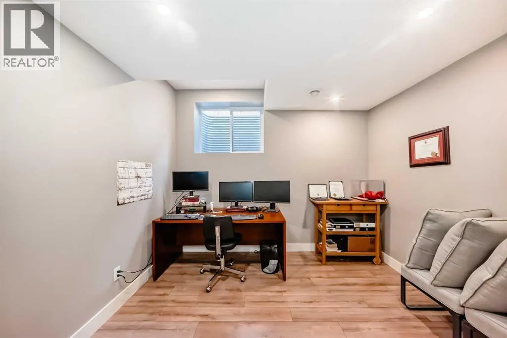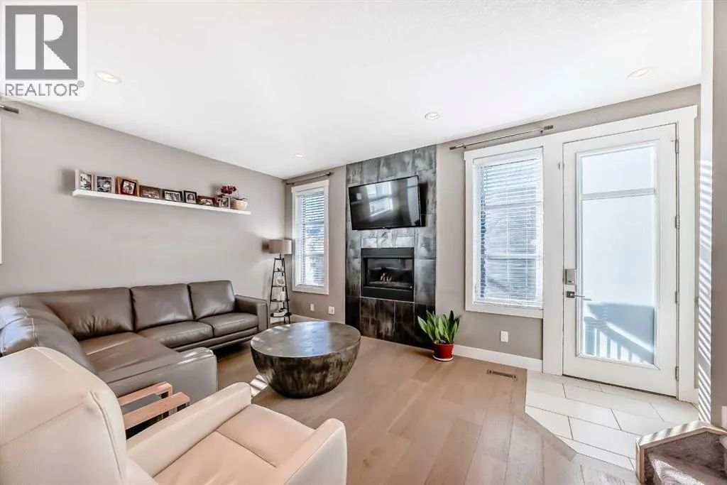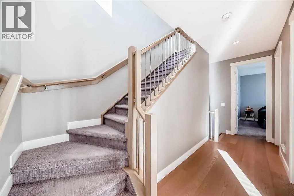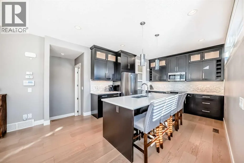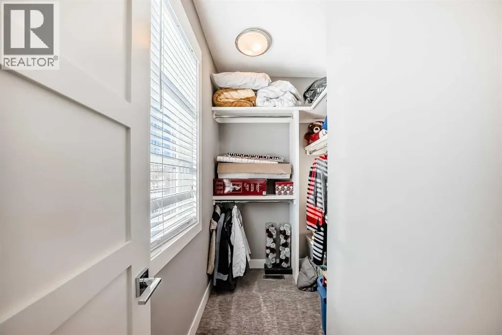 Incredible 3 storey corner townhouse in Winston Hts. If you are looking for a quality built home with loads of sq ft this is the one for you. The main floor is wide open with 9 foot ceilings, recessed lighting, gleaming laminate flooring and loads of oversized windows. The kitchen is wide open to the living area and has full height kitchen cabinets with builtin lighting, upgraded backsplash lit up with under mounting lights, beautiful white quartz countertops throughout & upgraded SS appliances. There is a huge centre island with a breakfast bar, dual undermount sinks, extra storage cabinets plus the dishwasher. There is also a large corner walkin pantry with tons of storage. Off the kitchen is a good sized dining area which overlooks the living room. The living room has a central gas fireplace with tiled surround and a mounted TV. There is a walkout to a back deck/BBQ area plus access to your parking space in the detached garage. This unit uses the far right side (when looking from the alley) parking spot. The 2nd level boasts two massive bedrooms each with their own oversized walkin closets. Between them you will find a full 5 pce main bathroom with tiled floors, his n her sinks sharing a huge vanity with extra cabinets and drawers. There is a water closet that has the tub/shower plus the toilet as well. The laundry is on the 2nd level as well and has a full sized washer/dryer with builtin cabinets. You will love the size of the bedrooms, the walkin closets and the 8 foot high doors throughout. The 3rd level is a huge Primary Bedroom with recessed lights, knockdown ceilings, a ceiling fan and a walkout to a large balcony that overlooks the City~ beautiful unobstructed views! The balcony has glass railing & loads of space for your patio furniture. The ensuite is luxurious with deep soaker tub, oversized stand up shower, tiled floors, his n her vanities plus a massive walkin closet with builtin custom made shelving. The fully finished basement has a good sized rec r oom with recessed lights, knock down ceilings, laminate floors & two windows. There is a storage room which has the freezer, a handy 2 pce bathroom and the massive 4th bedroom! The utility room has a high efficient furnace, Central AC, Builtin VacuFlo and an oversized Hot Water tank. (id:27476)