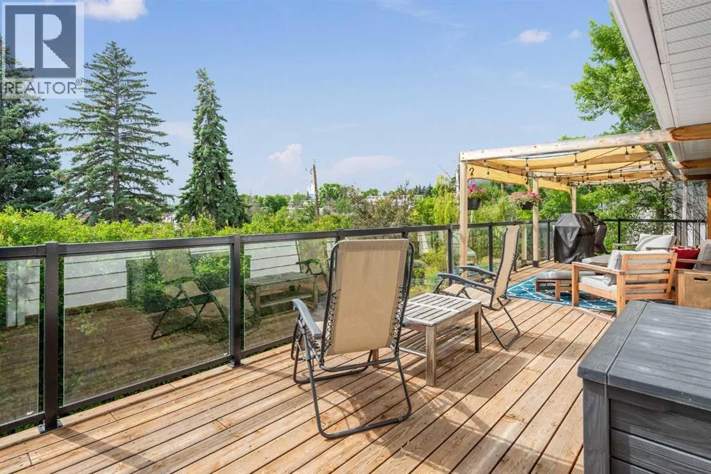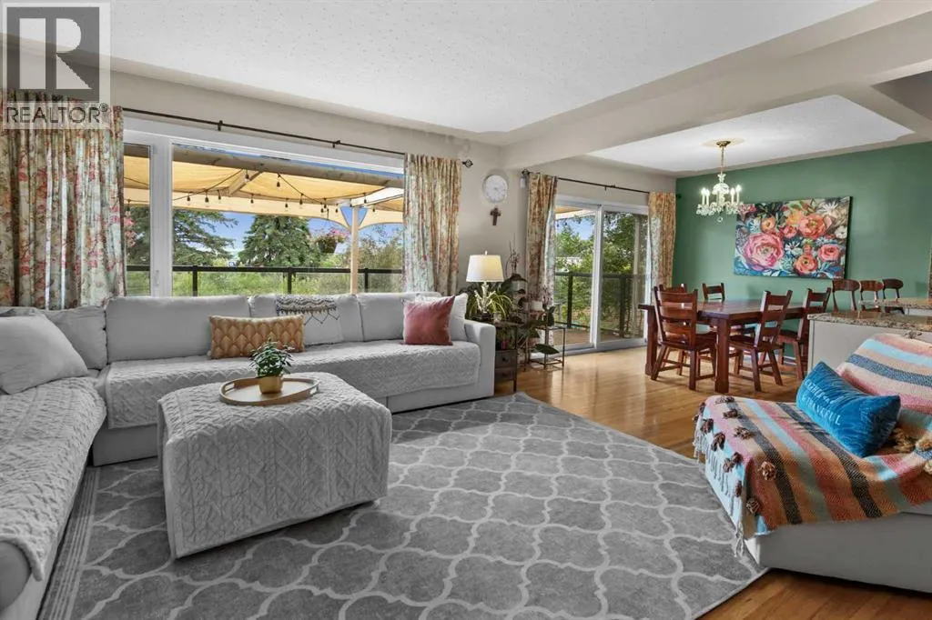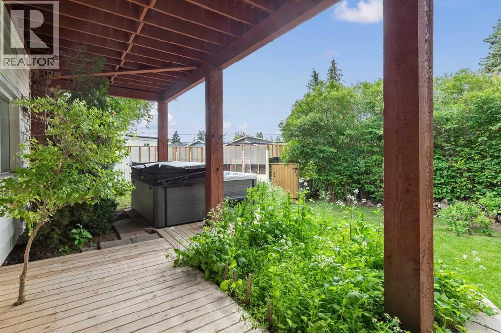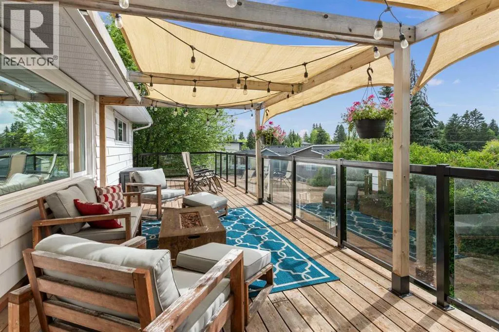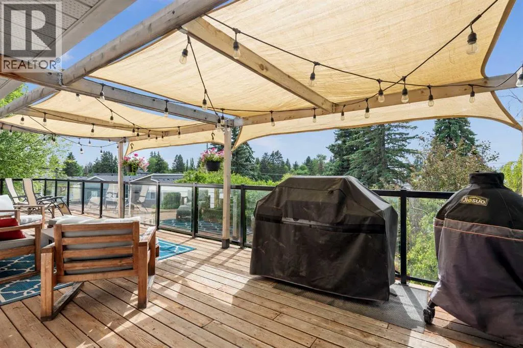 WE'RE BACK AND BETTER THAN EVER!!! NEW RETAINING WALL & SANITARY LINE!!! Tucked away on a massive, secluded pie-shaped lot, this remarkable home offers tranquility, space, and unforgettable outdoor living. The newly updated yard is both peaceful and private, while the upper deck takes full advantage of the lotâs unique elevation, offering sweeping panoramic views through sleek glass railings and covered by a timber pergola with awning. Inside, the open-concept main level has rich hardwood and cork flooring, and features a spacious living room with a corner wood-burning fireplace (with gas log lighter) and elegant decorative ceilings. The large walk-through kitchen boasts granite counters, stainless steel appliances, a coffee/wine bar, and breakfast barâflowing seamlessly into the dining room and out to the upper deck. The lower level impresses with soaring 10' ceilings, easy maintenance tile flooring, and flexible recreation and family room areas. With six bedrooms, this home offers incredible versatility for families, guests, or work/school from home. Entertain or relax on the walk-out patio complete with built-in swing set and terraced gardens. The outdoor living continues on the rooftop patio above the oversized double detached garage (24'x24')âperfect for a greenhouse, lounge, or play area. A second, extra-deep single garage (14'x24') is attached at the front of the home. With countless thoughtful upgrades and a perfect blend of character and modern function, this one-of-a-kind property is ready to impress. (id:27476)