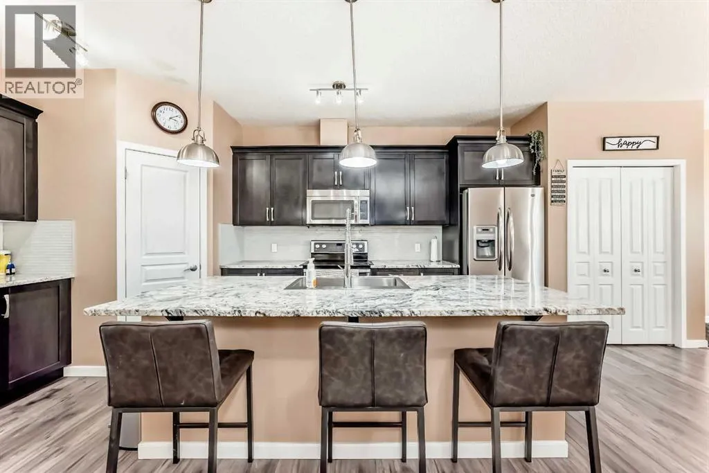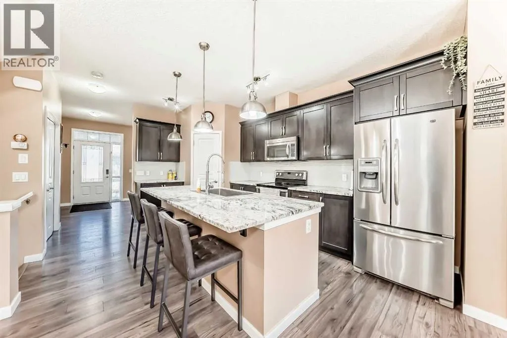 Price REDUCED!! **BRIGHT, BEAUTIFUL, WELL MAINTAINED HOME (5-Bedrooms + 3.5 Bath) with FULLY DEVELOPED BASEMENT w/ 2 BEDROOMS and OVERSIZED DOUBLE DETACHED GARAGE in the LAKE COMMUNITY OF AUBURN BAY** Welcome to this STUNNING home with over 2,445Sqft of living space - this highly sought-after floor plan is bursting with upgrades. Just few steps away from Auburn Bay lake, parks, walking paths, school and playgrounds. Main level consists of living room, separate den, dining area, powder room and a great size kitchen w/ walk-in-Pantry. The modern L-shaped kitchen offers a built-in microwave, large island with breakfast bar, stainless steel appliances and high ceiling. Take the staircase upstairs to find 3 large bedrooms with plenty of natural light + BONUS Room! The primary bedroom has a private balcony, 4 piece ensuite, and walk-in closet. Two more bedrooms, a full 3-pc bathroom and laundry room complete the upper level. Additional features include LVP FLOORING THROUGHOUT THE HOME including basement, upgraded lighting throughout, and granite countertops, NEW DISHWASHER (2025), NEW SAMSUNG WASHER/DRYER (2025) in a single unit, and among many others. This stunning home comes with a FULLY FINISHED basement with a good size recreation/family room with wet BAR, 2 bedrooms, a 3-piece bathroom, and an extra storage room. The West-facing Backyard is fully fenced, with a large deck and a private gazebo. This home is conveniently located just minutes away from lots of amenities including grocery stores, restaurants/pubs, shopping, schools and more. With quick access to 52nd Street, Stoney Trail, and Deerfoot â Making commuting a breeze. Donât miss this opportunity to own a stunning home in a vibrant community! Call to book your showing today! *Some Photos are virtually staged. (id:27476)