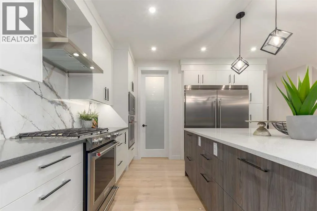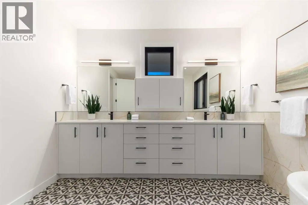 This custom built luxury family residence by Truman Homes is ideally located at the end of a quiet cul-de-sac in the prestigious community of West Springs. Thoughtfully designed for modern family living, this brand-new six-bedroom home combines timeless architecture, refined comfort, and exceptional craftsmanship throughout over 4000 SF of developed living space and three beautifully finished levels. A grand staircase welcomes you into the open foyer, where Southwest light fills the living areas, creating warmth and elegance with engineered hardwood throughout the main and upper levels. The chef-inspired kitchen showcases a large granite island, a 5-burner dual-fuel gas range with a second built-in oven, under-cabinet lighting, and a walk-in pantry with abundant space for spices, small appliances, and culinary essentials. Elegant cabinetry, deep island drawers, and intelligent corner design add both beauty and function. The open concept living and dining areas are centered around a gas fireplace with built-ins, while a built-in bar with wine fridge enhances entertaining. From the main level, walk out to a South-facing deck with a hot tub connection, overlooking a large backyard ready for your dream landscaping or family retreat. A two-desk office, tucked away from the main living areas, offers privacy and natural light, with a powder room conveniently located near the kitchen. The mudroom, connecting directly to the attached four-car garage, provides built-in storage for seasonal and everyday items. Upstairs, the primary suite is a serene retreat featuring heated floors in the ensuite, dual custom vanity, a glass-framed shower, a large walk-in closet, and a private patio for morning coffee or evening relaxation while you soak in mountain views. The upper level includes four bedrooms, ideal for growing families, and three full bathrooms, each with heated floors, plus a bright laundry room with a window, sink, washer, dryer, and ample storage. The fully developed lowe r-level features roughed-in in-floor radiant heat, two bedrooms, a four-piece bathroom, a theatre room, flex space for fitness, and a second kitchen area with a fridge and dishwasher, perfect for guests or multi-generational living. The oversized four-car attached garage impresses with soaring ceiling heights, roughed in radiant in-floor heating, floor drains, and two EV chargers. Mechanical highlights include two high-efficiency furnaces zoned controlled, rough-in for air conditioning, CAD-6 wiring, zoned speakers roughed-in throughout the home including the garage, a radon mitigation system, and roughed-in security. Located just 20 minutes from downtown Calgary, West Springs offers top restaurants, cafés, fitness facilities, boutique shopping, and excellent schools, all within walking distance. This home was thoughtfully designed and custom built with too many upgrades to name. Make sure to review the property brochure to get a full list of the upgrades that went into this superb family home! (id:27476)