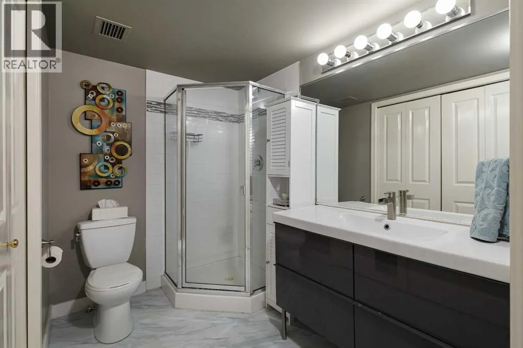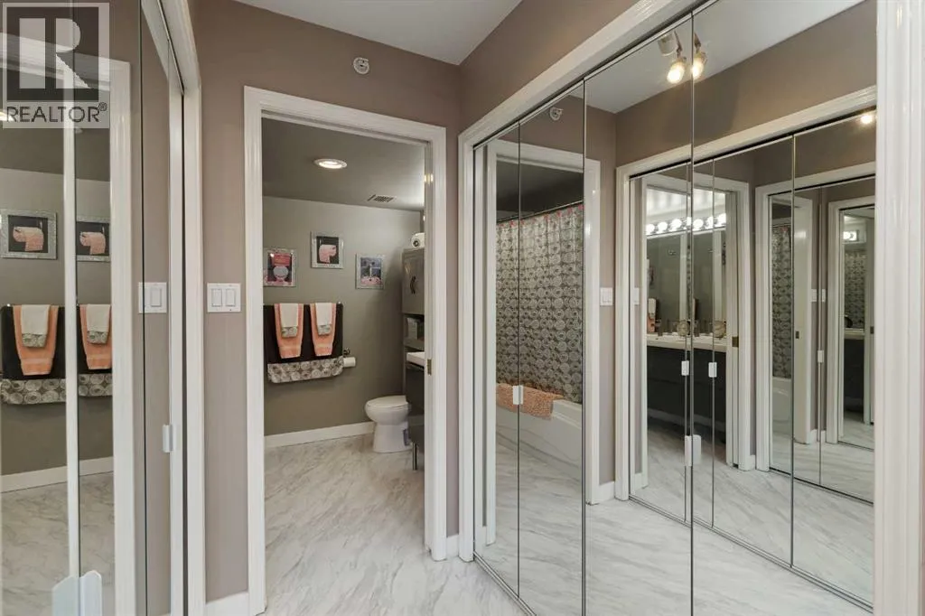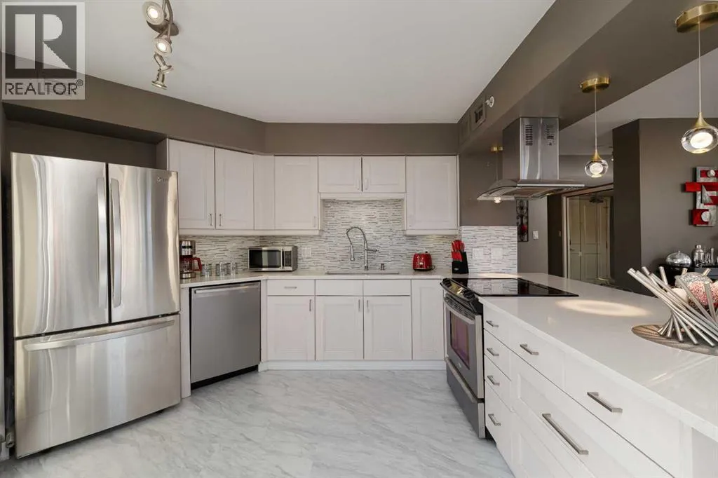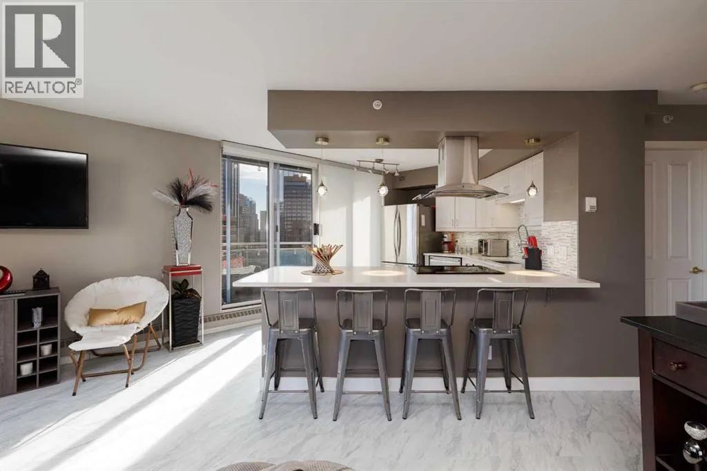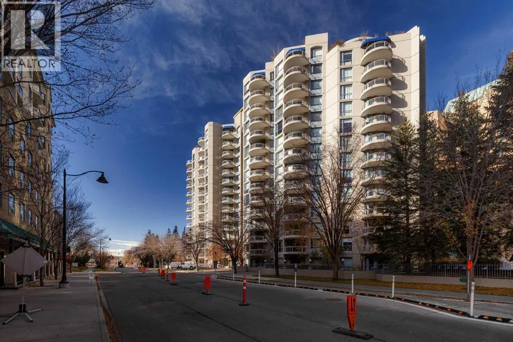 Welcome to an unparalleled urban lifestyle in the heart of the dynamic riverfront community of Eau Claire. Living here means being steps away from Princeâs Island Park, the Bow River Pathway system, trendy cafés and restaurants, all just a short walk to the business district. Situated in the Liberte building, this sophisticated, beautifully appointed 2 bedroom, 2 bathroom suite has incredible natural light from expansive, floor-to-ceiling windows, and offers captivating cityscape views. The open concept living space has a modern, bright aesthetic and was designed for comfort and effortless entertaining. The spacious living room features a corner gas fireplace and ample room for the most generous seating arrangements. The gourmet kitchen boasts pristine white cabinetry, stainless steel appliances, and a large central island that anchors the room and provides the perfect spot for casual dining and conversations. The adjacent den allows for a great home office space, or alternatively, an additional dining area. The living area is extended by two large balconies, where one can enjoy their morning coffee or evening cocktails while taking in the panoramic views of the downtown skyline. The layout of the home provides separation and privacy between the living areas and the two bedrooms, each designed as a comfortable retreat. The spacious primary suite easily holds a king bed and additional furniture pieces, and has double closets lining the hall to the ensuite bathroom. The second bedroom is equally well sized, and has a second full bathroom (including laundry closet) located just outside the door. The building offers extensive amenities, including a fitness centre, tennis court, party room, and heated underground parking. This turn key residence is more than just a home, itâs an opportunity for amenity and activity rich living. Walk out your door to the Bow River Pathway for a run or bike ride, stroll across to Prince's Island Park for a festival, or walk just minutes t o the fantastic restaurants and shops, and for professionals working downtown, the commute canât be beat! Book your private showing today. (id:27476)