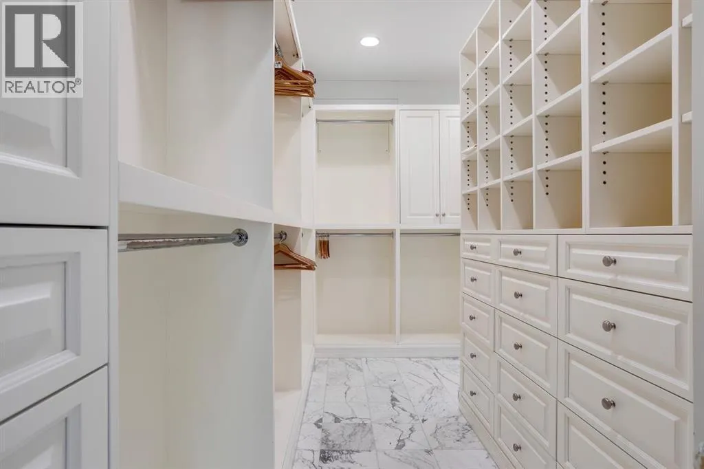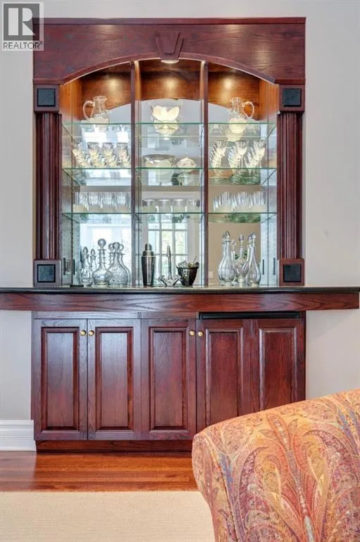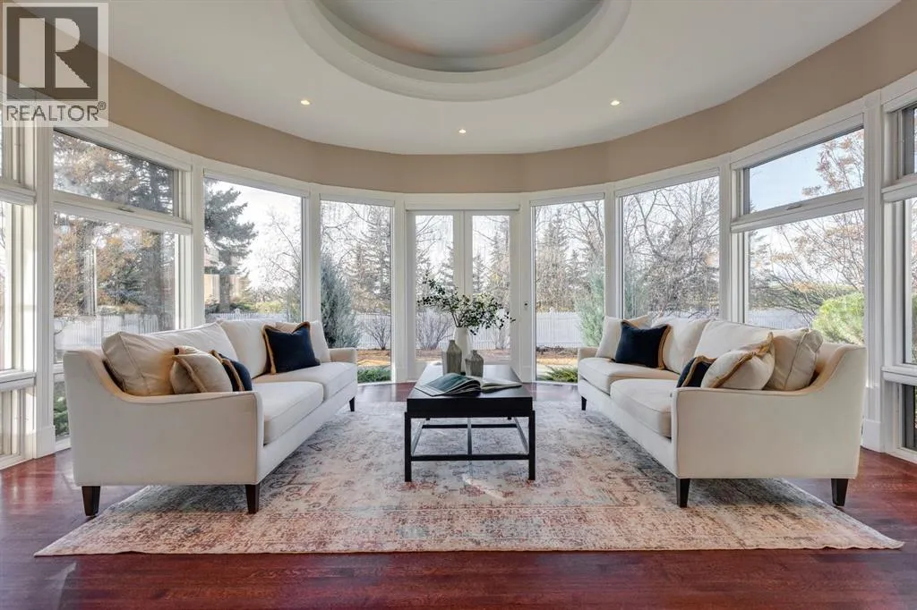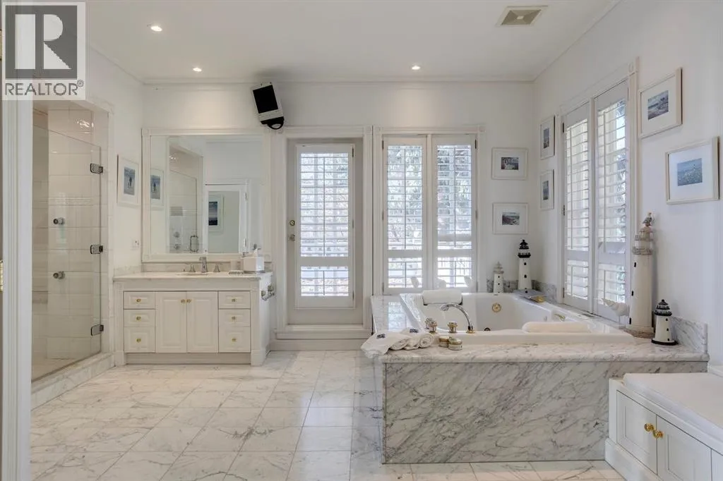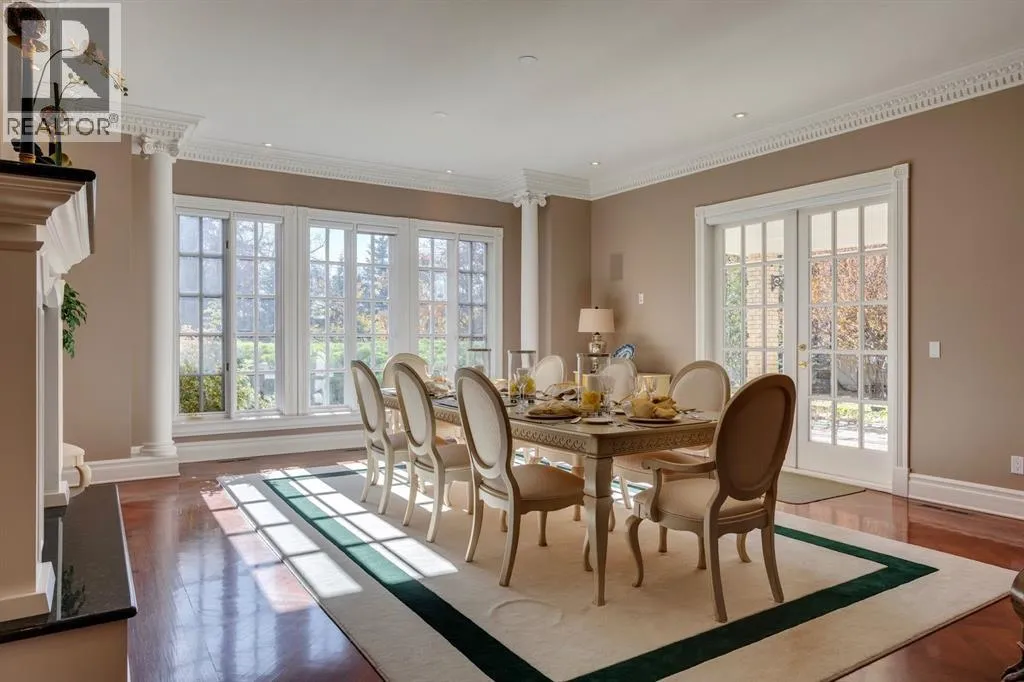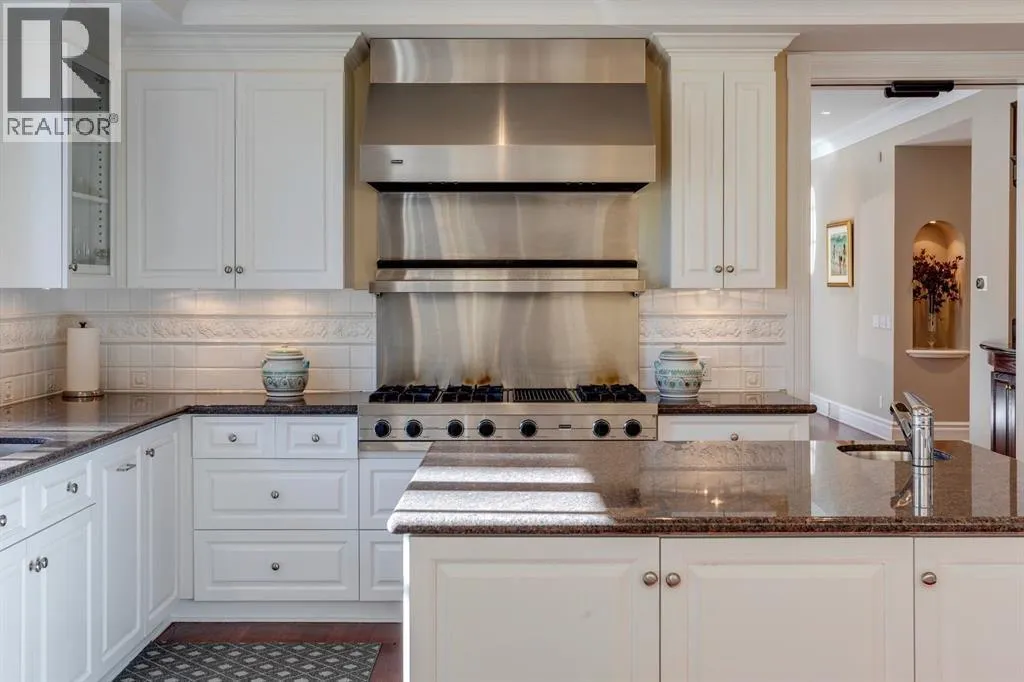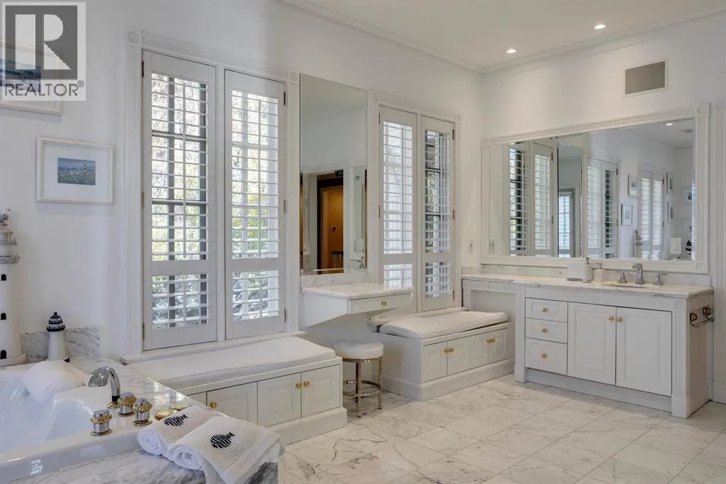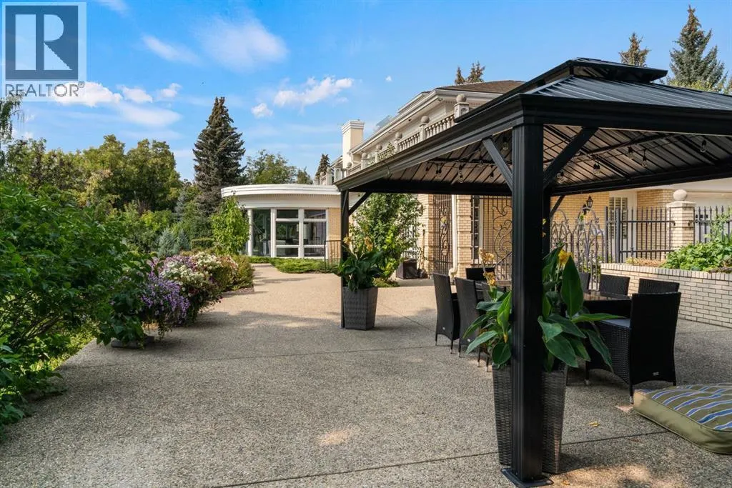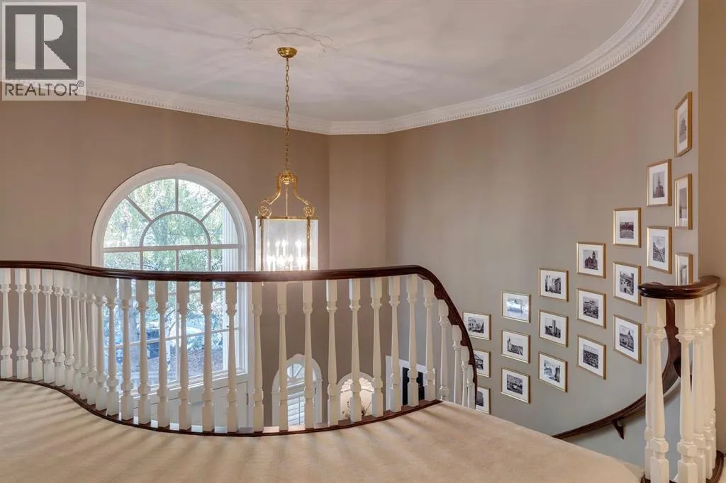 Timeless in design and uncompromising in craftsmanship, this bespoke neoclassical estate ranks among the city's most distinguished residences. Nestled in a fully treed, meticulously landscaped setting ensuring complete privacy, it delivers an unforgettable first impression. The brick façade features columns, concrete balustrades, and wrought-iron gates to assert its stately presence. A gated, heated driveway leads to a triple garage and an exceptional underground parkade accommodating eight more vehicles, complete with car wash and workshop. Inside, a dramatic curved staircase anchors the grand foyer, introducing the artistry throughout. The main floor excels in entertaining, ideal for galas, business dinners, or family celebrations with generous gathering spaces, a cloak room, two elegant powder rooms, expansive corridors, and multiple French doors opening to terraces and gardens. A refined formal living room with limestone-trimmed fireplace, display cabinet and graceful chandelier has ample room for a grand piano. The spacious dining room with fireplace and butlerâs pantry is ready for formal dining. An inviting library boasts wood bookcases and a lounge for quiet reflection. The family room provides multiple sitting areas, a wet bar, and access to the south-facing circular sunroom overlooking the private grounds. Adjacent is a classic kitchen with commercial-grade appliances including a six-burner cooktop, double wall ovens, and warming drawers. A casual dining area suits morning coffee or weeknight meals while the walk-in pantry contains an extra freezer and water dispenser. Upstairs, the primary suite is a private sanctuary with a serene sitting room and fireplace, plus doors out to the south-facing rooftop patio and multiple walk-in closets. A marble clad ensuite indulges with dual vanities, multi-head shower, and generous tub. The second and third bedrooms each have ensuites, while the third-floor guest suite/office features balcony views of the reservoir and mountains, plus a three-piece bath. Downstairs, the lower level focuses on leisure: a home theatre with tiered seating, a snack bar with candy display, a Tuscan-inspired wine cellar with barrel-vaulted ceiling and wrought-iron gates, gym/recreation room, and steam room. Private staff quarters include a secondary kitchen, fifth bedroom/hobby room, laundry with double washer/dryers, and separate entry. Located in a prestigious, tightly held enclave backing protected parkland, this property ensures privacy and security. Created for the connoisseur of living well, this home seamlessly blends spaces for health, leisure and passion. Every detail, from the classical proportions to the enduring materials reflects a home crafted for how discerning families truly live: entertaining beautifully, living comfortably, and enjoying privacy without compromise. A residence that embodies grace, strength and refined living, an iconic estate in every sense. (id:27476)