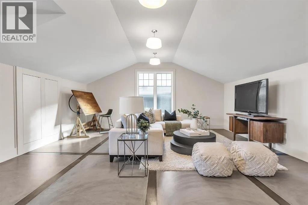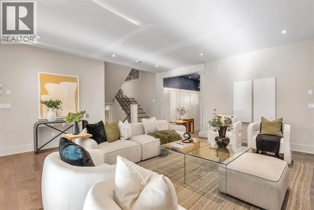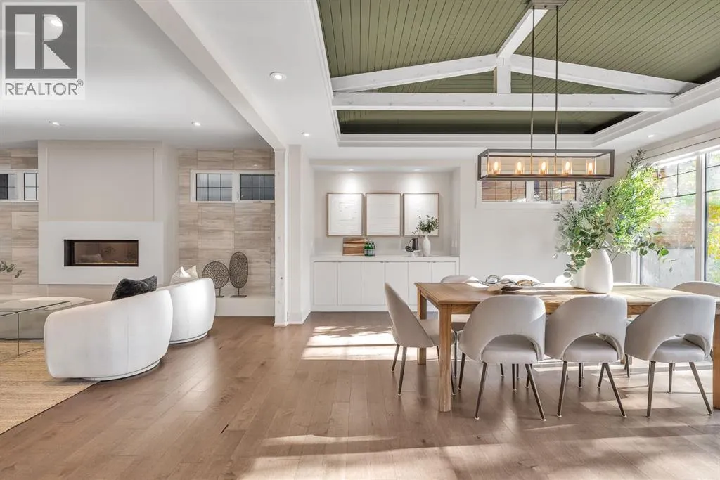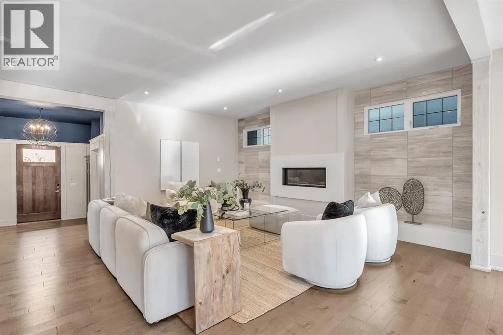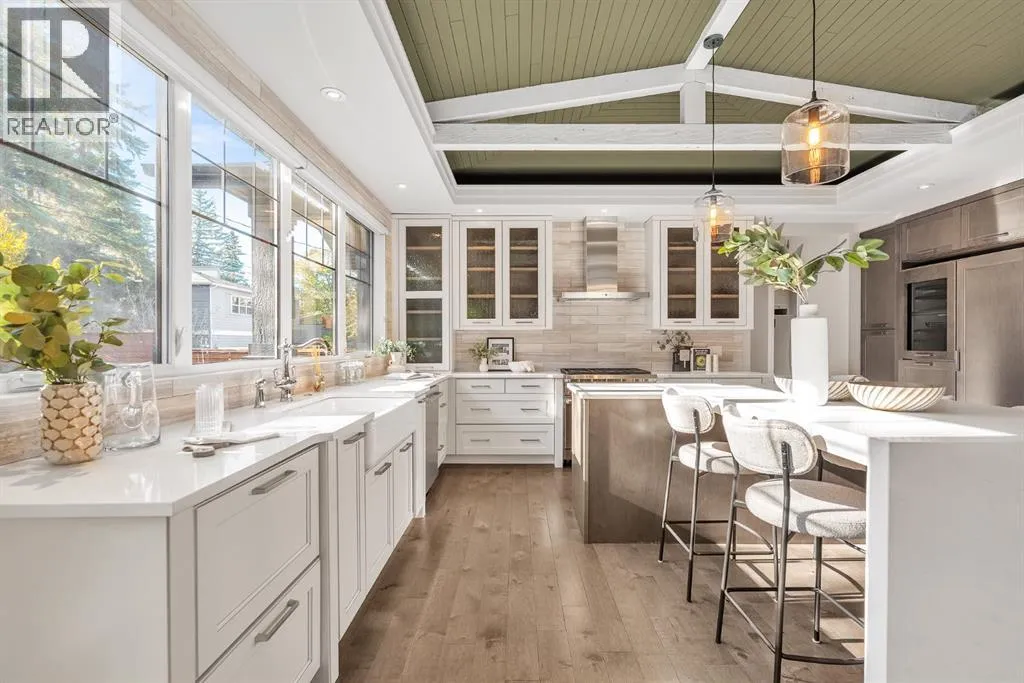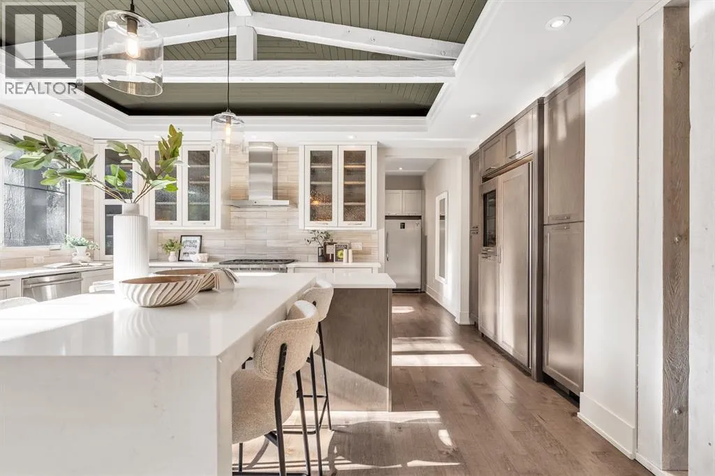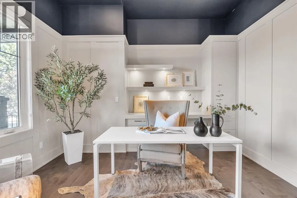 A rare offering on Britannia Drive, this exquisite estate captures the essence of modern luxury with over 4,600 square feet above grade of thoughtfully designed living space. Every element has been curated with precisionâfrom its statement steel entry door to the seamless flow of sun-filled interiors overlooking the south backyard.The main level blends warmth and sophistication through its open design and natural textures. Expansive windows flood the home with light, highlighting brushed cashmere hardwood floors, exposed timber accents, and rich custom millwork. The kitchen is a showpiece in both style and function, featuring professional-grade appliances, Caesarstone countertops, an oversized island, and a butlerâs pantry with stand-up freezer. The adjoining dining and great room, framed by a gas fireplace, invite effortless entertaining and relaxed everyday living. A well-appointed main-floor office with built-ins provides privacy and focus.The second level is dedicated to rest and retreat. The primary suite features dual walk-in closets, a spa-inspired ensuite with steam shower and freestanding tub, and a private balcony that welcomes morning light. Two additional bedroomsâeach with ensuite baths and custom walk-in closetsâoffer comfort and independence. A bonus room with a gas fireplace opens to a front balcony with downtown views, while an additional flex space adapts perfectly to a home office, playroom, or study nook.The third floor is an adaptable hideaway ideal for guests, teens, or a media lounge, complete with a built-in bar and Murphy bed desk.The fully developed lower level enhances the homeâs entertaining appeal, offering heated concrete floors, a glass-enclosed wine cellar, a wet bar, and an expansive recreation area. A private living quarters with kitchen, laundry, and full bath provides private accommodation for a nanny, extended family, or guests.Outdoors, the south-facing backyard is designed for easy enjoyment with multi-level decks and newl y added turfâperfect for low-maintenance living.Car enthusiasts will appreciate the heated, oversized triple garage with capacity for up to five vehicles when equipped with lifts, offering ample space for storage and collection.Additional features include three fireplaces, concrete stair treads, 9- and 10-ft ceilings, a hidden loft above the laundry room, and exceptional built-ins throughout.Perfectly positioned near the Elbow River pathways, The Glencoe Club, Calgary Golf & Country Club, top schools, and downtownâs finest amenities, this Britannia Drive residence offers an extraordinary lifestyle in one of Calgaryâs most distinguished settings. (id:27476)