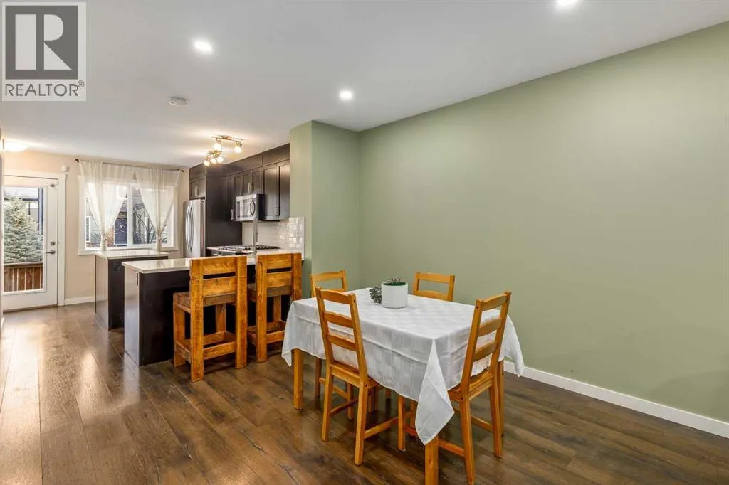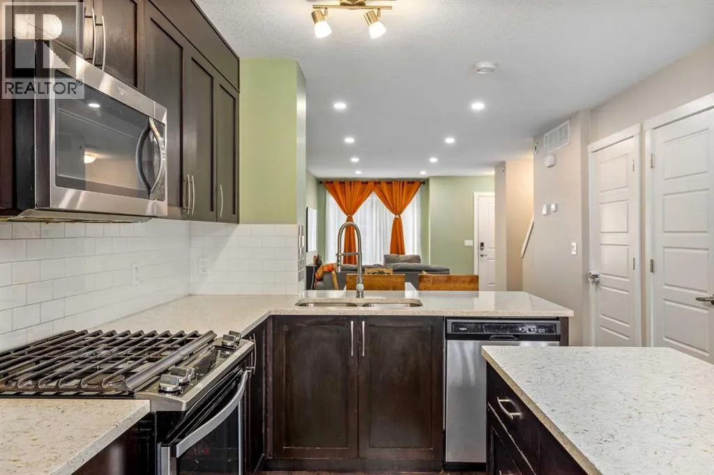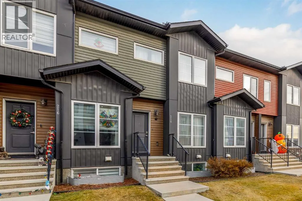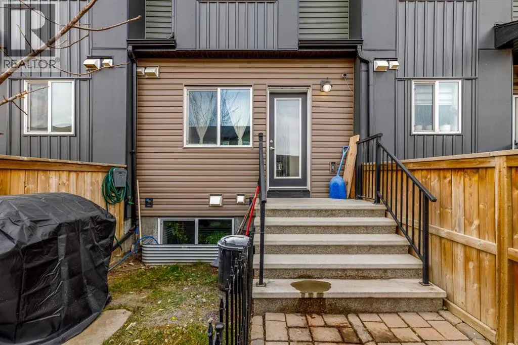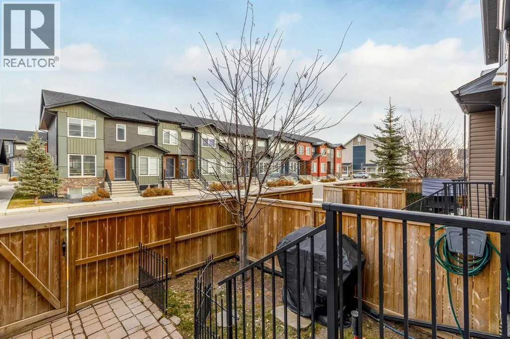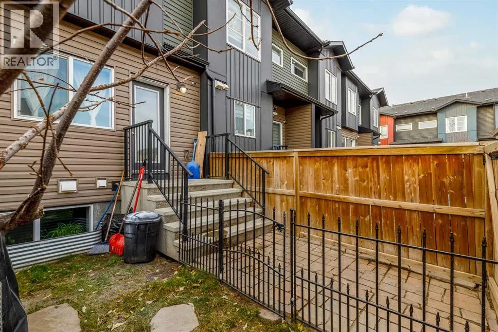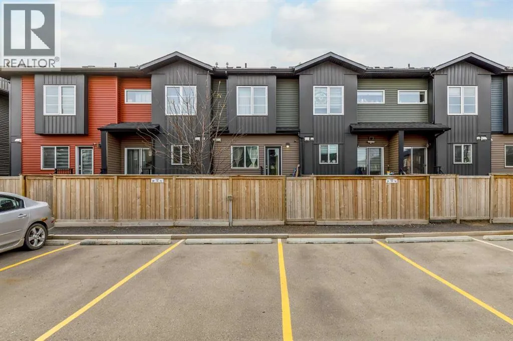 Welcome to this stylish townhome in Redstone offering over 1,600 sq. ft. of finished living space and everyday convenienceâincluding two parking stalls located directly outside your private, fenced yard (a rare find in this complex). Plus, youâre right across the street from shops and moments to parks, pathways, transit, and Stoney Trail. Inside, the main floor is bright and functional with dark laminate flooring throughout. A welcoming front family room features a decent-sized picture window for natural light. The staircase is set along the side of the home beside the central dining area, creating a smooth flow to the back of the house. The rear kitchen is well-designed with dark-stained cabinetry, quartz counters with subtle black and gold veins, subway tile backsplash, stainless steel appliances, a gas stove, an island, and a pantry-style closet. A 2-piece bath is conveniently located across from the kitchen, and the back door leads to your private, fenced yardâperfect for BBQs and easy outdoor livingâwith those two parking stalls just beyond the gate. Upstairs, laminate continues through the entire upper level (carpet only on the stairs). The primary bedroom includes dual closets and a large nook with a custom built-in for TV and storage, plus a 3-piece ensuite with a corner shower. The second bedroom is generously sized and has access to a full 4-piece bathroom located just outside the doorâideal for guests, kids, or a roommate. The basement is fully finished and adds terrific bonus space: a cozy recreation room with a good-sized window, a 4-piece bathroom, and a rear bedroom with a closet and a bump-out perfect for a TV or desk area. Laundry is downstairs in a dedicated closet, with the mechanical room across. Outside, enjoy the private, fenced yard, and the everyday ease of two assigned stalls right out backâa standout advantage compared to most units with only one. Redstone offers a welcoming, family-friendly vibe with parks, playgrounds, and scenic pathways , plus quick access to shopping, transit, and major routes. Whether youâre a first-time buyer, downsizer, or investor, this home checks all the boxes for space, style, and value. Book your private showing today and experience the best of Redstone living. (id:27476)