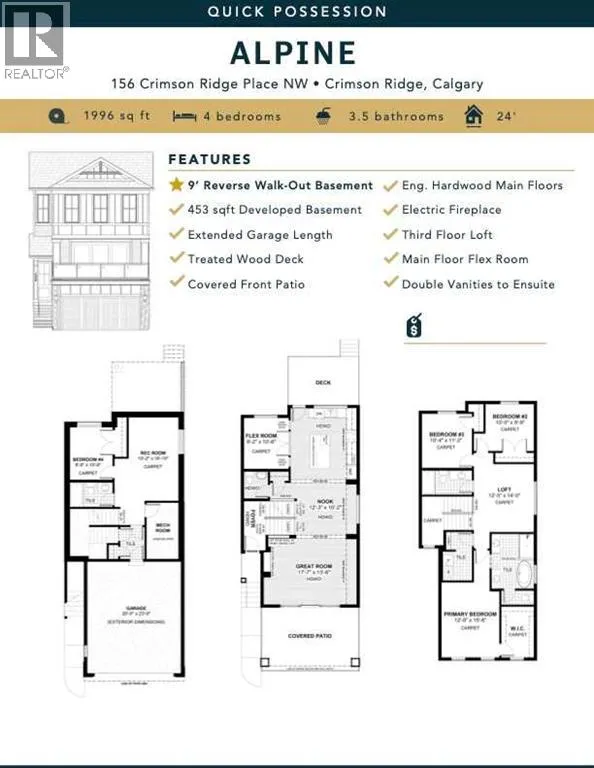 Discover The Alpine by Master Builder Douglas Homes. A beautifully crafted home, perfectly situated in the highly sought-after community of Crimson Ridge. This brand-new build combines luxury, comfort, and the serenity of natureâbacking onto picturesque walking paths and the prestigious Lynx Ridge Golf Course for breathtaking views and a true sense of tranquility. Offering over 2,450 sq. ft. of developed living space, this open-concept home showcases exceptional craftsmanship, modern finishes, and timeless design. The main floor features stunning hardwood flooring that flows seamlessly throughout the open living area, which includes a cozy great room with fireplace, an inviting dining area, and a chef-inspired kitchen complete with an oversized island, quartz countertops, elegant cabinetry, and five stainless steel appliancesâincluding a gas stove. A walk-in pantry adds convenience, while the flex room serves perfectly as a home office or den. Upstairs, youâll find three spacious bedrooms, a loft-style bonus room, and a dedicated laundry room. The primary suite offers a true retreat with a luxurious 5-piece ensuite featuring a soaker tub, stand alone shower, double vanities, and a generous walk-in closet. Step outside to the expansive 20' x 10' covered patio in the front and 10x10 rear deck both ideal for entertaining or relaxing in your peaceful natural surroundings.The fully finished basement adds even more living space with a large recreation room, an additional bedroom, and a full bathroomâperfect for guests or family gatherings.With 9 ft. ceilings, 8 ft. doors, on the main level, and meticulous attention to detail throughout, this home balances sophistication and functionality.Surrounded by nature yet just minutes from every amenity, this is a rare opportunity to own a Douglas Home in one of the areaâs most desirable location. Under construction Photo's taken from another home and may not be a true representation of this home. (id:27476)