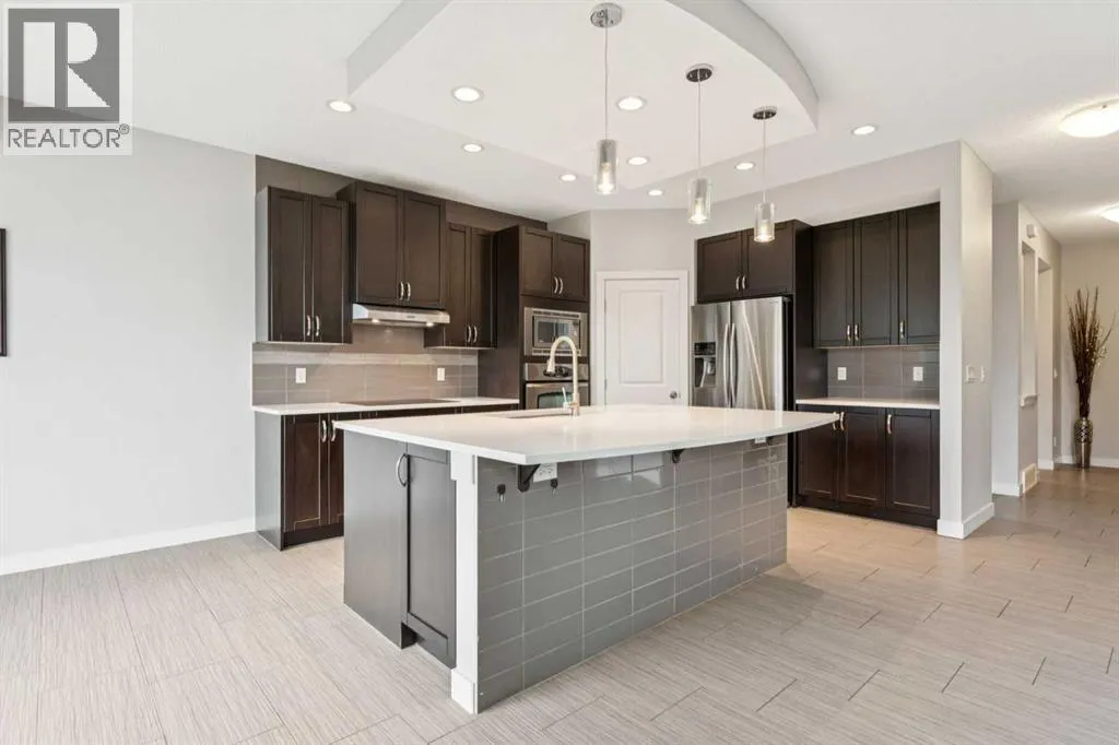 This Shane Homes âLeeraâ former show home in Sherwood backs directly onto a quiet ravine with pathway access and offers a rare combination of location, quality, and thoughtful upgrades. Lovingly maintained by the original owners, it features 2,352 sq. ft. RMS above grade and approximately 3,280 sq. ft. of developed living space, including a fully finished, permitted basement.The main floor is bright and open with 9-foot ceilings, oversized windows, and a kitchen designed for cooking and gathering â quartz counters, an induction cooktop, premium stainless-steel appliances, and extra cabinetry. A front office with French doors and a double-sided fireplace provides a comfortable private workspace.Upstairs, a spacious bonus room with built-in media cabinetry and a wet bar sits alongside a convenient laundry room. The primary suite includes a walk-in closet, a five-piece ensuite, and blackout blinds in all bedrooms.The basement adds flexible space for a gym, theatre, or playroom, plus extra built-in storage. The south-facing backyard has been professionally landscaped and includes a stone patio, deck, remote-controlled awning, and upgraded lighting.The insulated double garage is drywalled with built-in ceiling storage and is EV-ready. Additional highlights include LED lighting throughout, a tankless hot-water system, a high-efficiency furnace, a roughed-in central vac, and a wired-in security system. Roof and siding were replaced in July 2025.Minutes to Beacon Hill Shopping Centre (Costco, Home Depot, GoodLife Fitness) and Sage Hill Crossing (T&T Supermarket, Walmart), with easy access to parks, transit, and designated to Sir Winston Churchill High School. (id:27476)