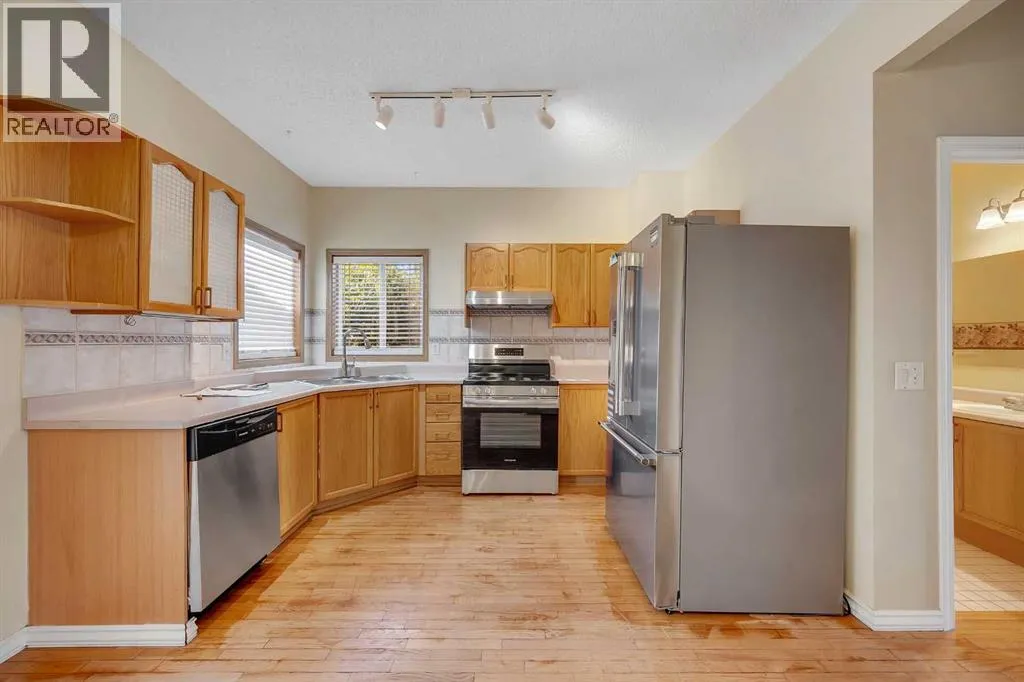 Exceptional value! Fully finished 2-storey home with a heated double detached garage, located on a quiet cul-de-sac in the community of Monterey Park. This property offers a convenient location close to schools, parks, public transportation, the Monterey Park Wetlands, Rotary Mattamy Greenway walking paths, and a variety of amenities.Recent updates include a newer asphalt shingle roof (2023), central air conditioning, and newer modern stainless steel kitchen appliance package. The main floor features 9-foot ceilings, large windows, and a cozy living room with a central gas fireplace. The kitchen is fitted with oak cabinetry and flows into a bright dining nook with patio doors that lead to a west-facing, fully fenced, and landscaped backyardâideal for outdoor enjoyment. Upstairs, the primary bedroom includes a walk-in closet and a 3-piece ensuite. A second spacious bedroom and a 4-piece main bathroom complete the upper level. The fully finished basement offers a large family/games room with a second gas fireplace, an additional bedroom or den, and generous storage space. The oversized double detached garage is fully insulated and heated with its own gas furnace, providing excellent utility year-round. Additional features include a central vacuum system and a natural gas BBQ hookup. This home offers great potential in a family-friendly neighborhood. (id:27476)