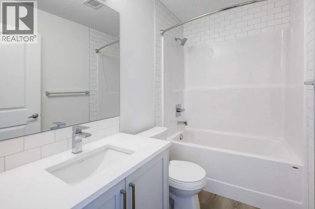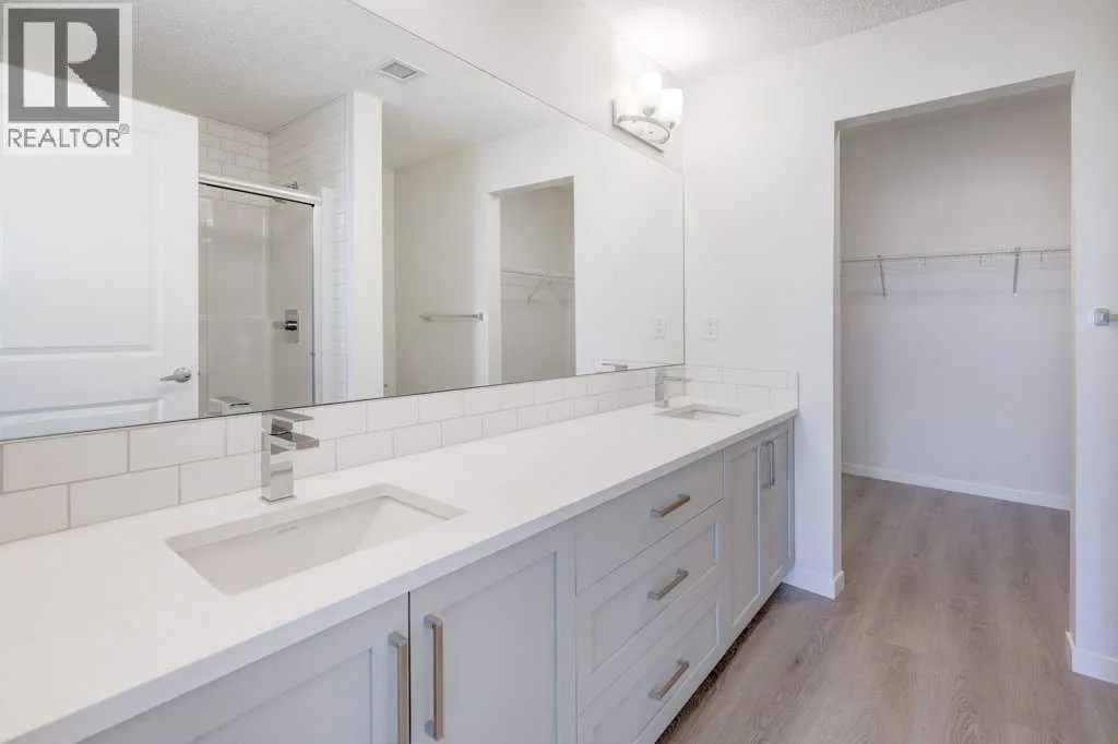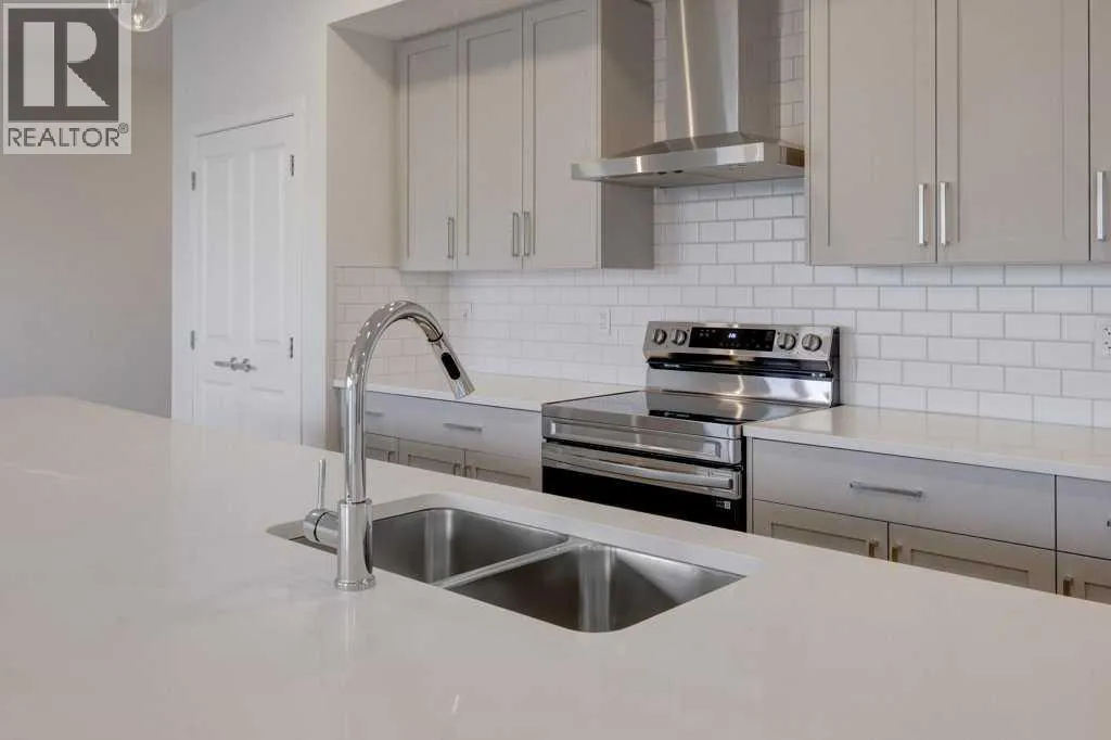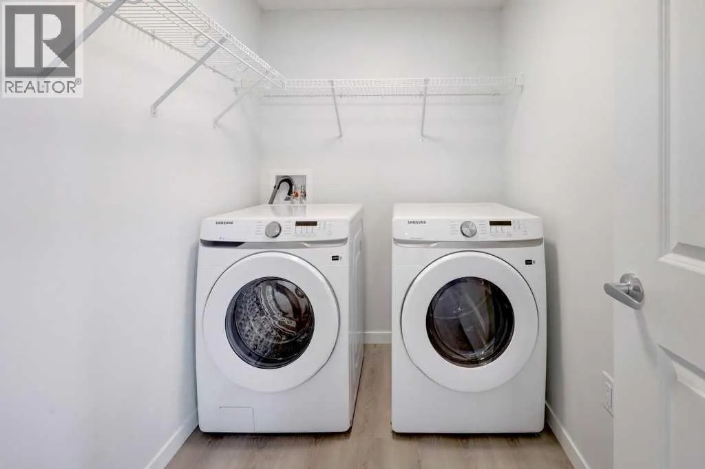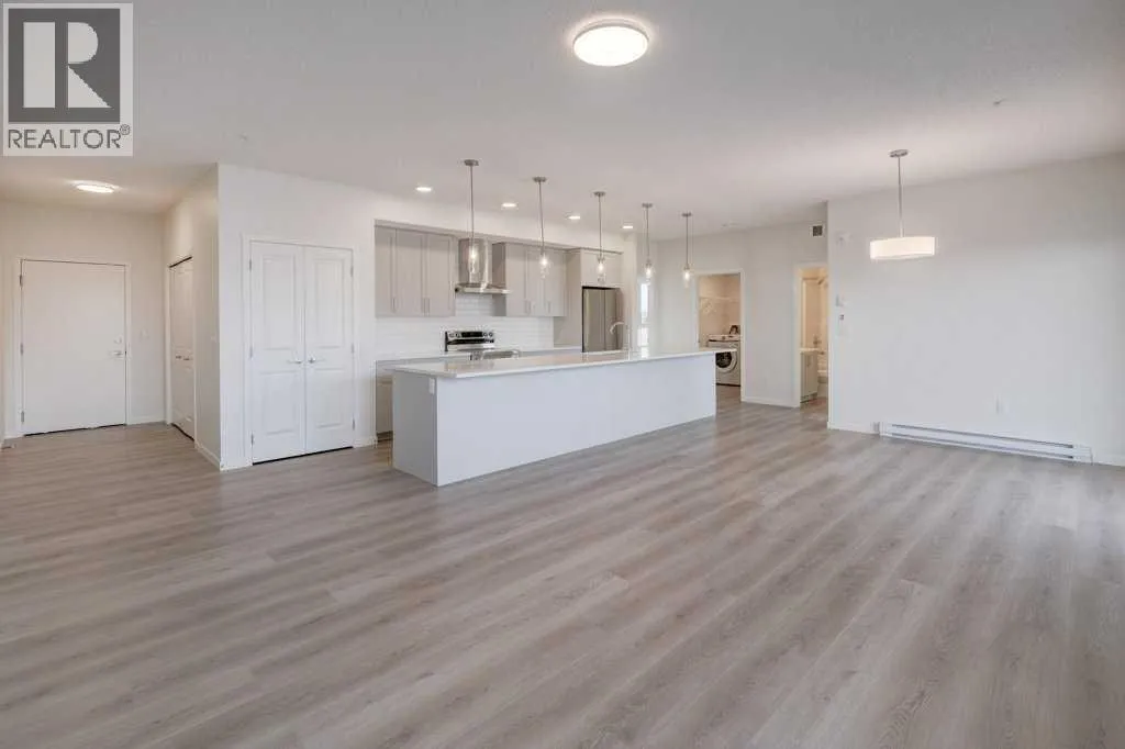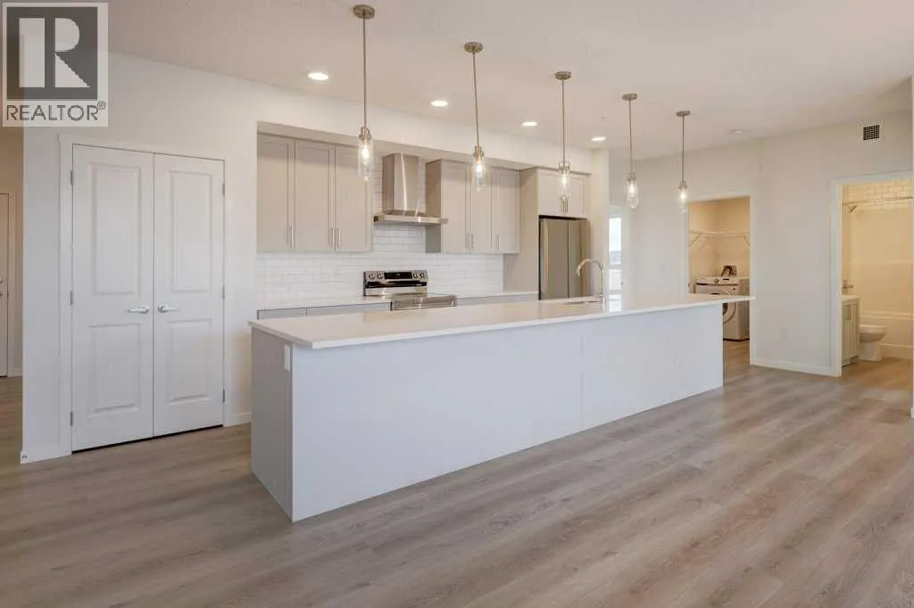 Introducing BELMONT PLAZA, a highly sought-after development in BELMONT, Calgary. BUILT BY CEDARGLEN LIVING, WINNER OF THE CustomerInsight BUILDER OF CHOICE AWARD, 5 YEARS RUNNING! BRAND NEW CORNER UNIT, "L4" floor plan with high-spec features. You will feel right at home in this well thought-out 1090.45 RMS sq.ft. (1165 sq.ft. builder size) 2 bed, 2 bath home with open plan, 9' ceilings, LVP flooring through-out (upgraded, no carpet), Low E triple glazed windows, electric baseboard heating, BBQ gas line on the patio, A/C Rough in, and Fresh Air System (ERV). The kitchen is spectacular with full height TWO TONE cabinets, extended island upgrade, quartz counters, undermount sink, S/S appliances, including chimney hood fan, built in microwave, and pantry. The extended island is stunning and transitions into the spacious living & dining area, perfect for entertaining. The spacious primary bedroom has a large bright window, sizeable walk-in closet and 4 pc ensuite with extra bank of drawers & full height tile upgrade. 1 additional bedroom located across the unit for noise reduction/privacy and 4pc bathroom (also with upgraded full height tile) located nearby. Laundry & storage closet is thoughtfully planned, definitely a must see (washer/dryer included). Highlights include: upgraded lighting package, sound reducing membrane to reduce sound transmission between floors, clear glass railing to balconies and 1 titled underground parking stall included. Steps away from shopping, restaurants and so much more. Belmont offers a vibrant neighbourhood thatâs extremely well-connected through Calgaryâs major arteries. Community living with inspired design. PET & RENTAL FRIENDLY COMPLEX. (id:27476)