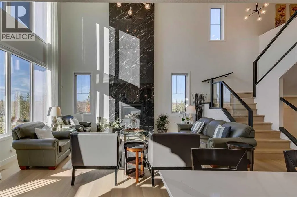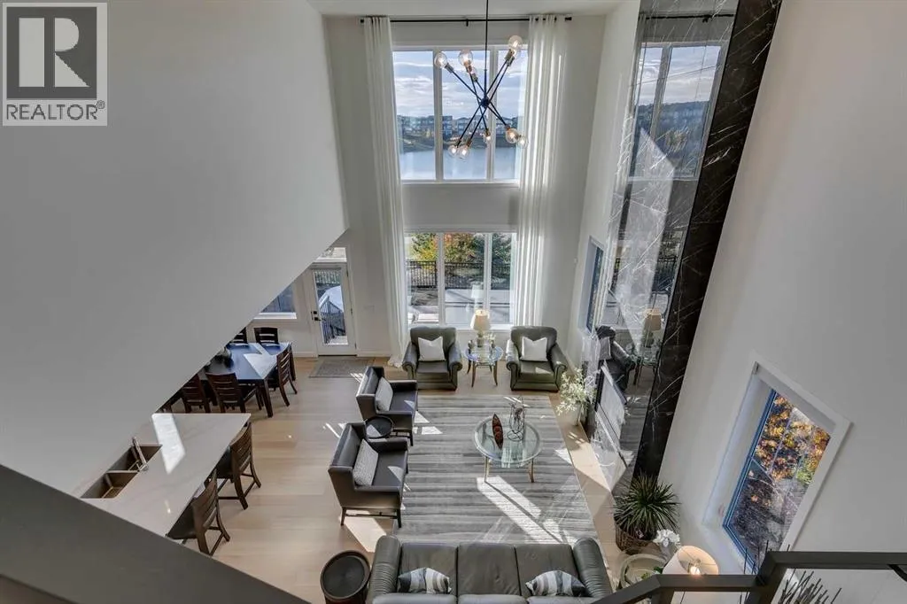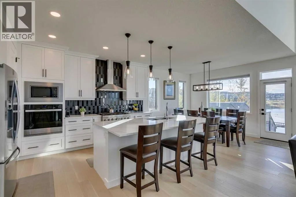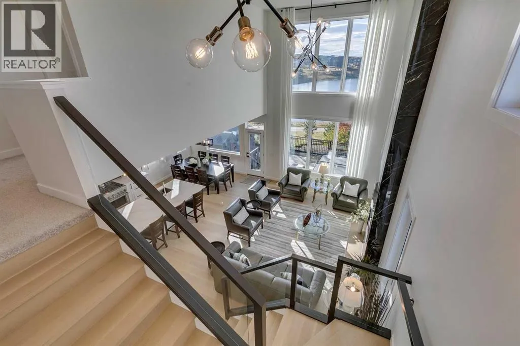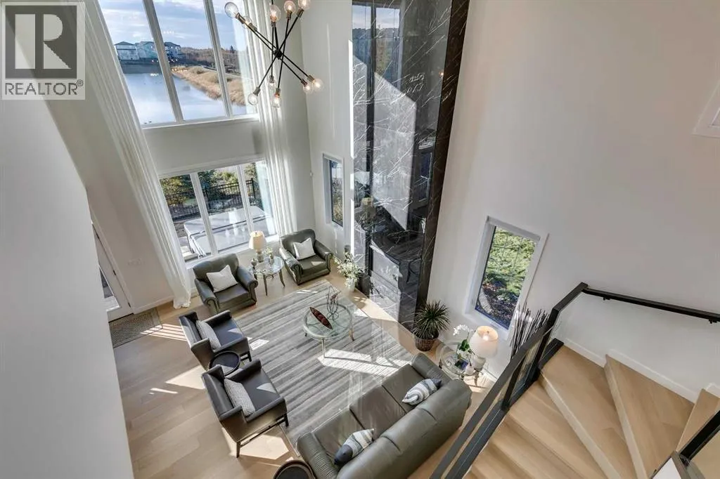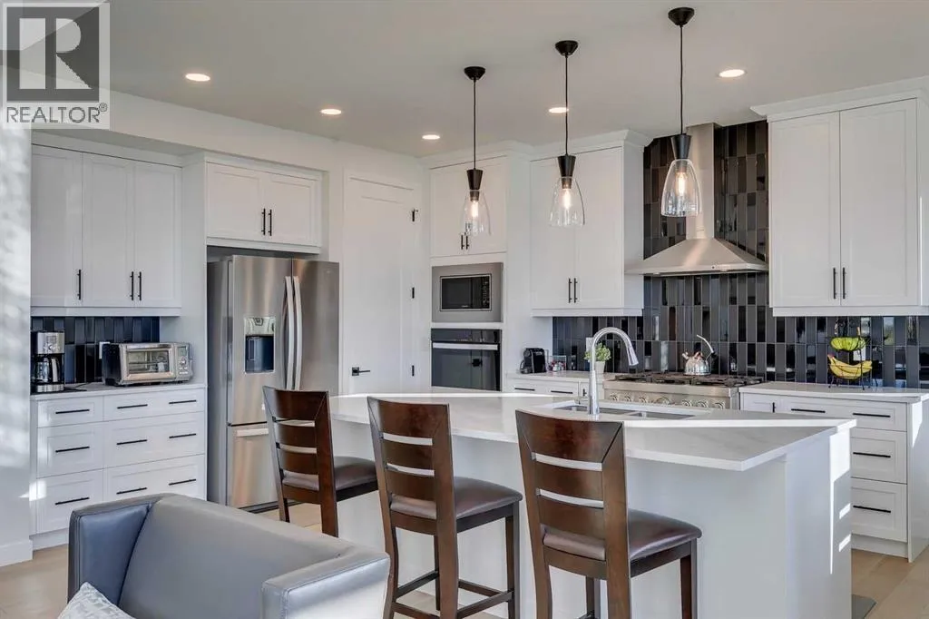 In like-new condition, this spectacular custom-built and extensively upgraded 2,430 sq. ft. 5-bedroom, four full-bath home will take your breath away. Located in Alpine Park, one of southwest Calgary's premier new home communities, this home backs west onto a community pond and a lush green space with sweeping views. Two-storey ceilings and windows with a full-height two-storey fireplace grace the sundrenched great room. Upgraded 8' island chef's kitchen features full-height shaker-style cabinets, soft-close doors and drawers, quartz countertops, Whirlpool stainless-steel appliances with a 6-burner commercial-quality gas stove, and an air fryer microwave. Tempered 10-mil glass railings lead to the upper level, featuring 3 large bedrooms, 2 full baths, and a large bonus/family room. The decadent primary bedroom has stunning mountain and pond views, a luxurious ensuite with a soaker tub, tile floors, quartz countertops with undermount sinks, and a king-size walk-in closet. The main floor offers a den/bedroom and is supported by a full bath to supply an "age in place" concept, with laundry on both the main floor and in the basement. Engineered hardwood floors, a substantial upgrade from vinyl plank, grace the main floor, the staircase to the upper bedrooms and the primary bedroom. The professionally developed basement features a family room/media space, a games area (billiards), a 5th bedroom, a full bath, and RI for a future bar/kitchen. Professional landscaping offers patios and expanded decks to maximize the pond and forest views. The garage has an epoxy floor, is drywalled to home-finishing standards, features custom shelving, and has a 12-ft. ceiling for loft storage or a car hoist. Exposed aggregate steps and patio, composite decking used on the front porch, A/C, triple pane windows, custom window coverings, side door for future suite (subject to civic approvals), full height tile in all baths, 9' ceilings through all levels, knock down stipple, upgraded lighting and plumbing, 8' interior doors, romantic electric fireplace in the primary bedroom, 200 amp service, RI for hot tub, water softener, high-end finishes, quality design throughout and views, views, and views! (id:27476)
