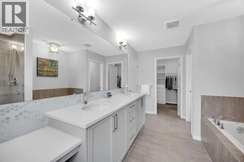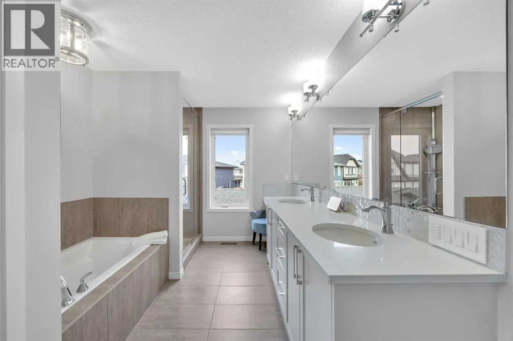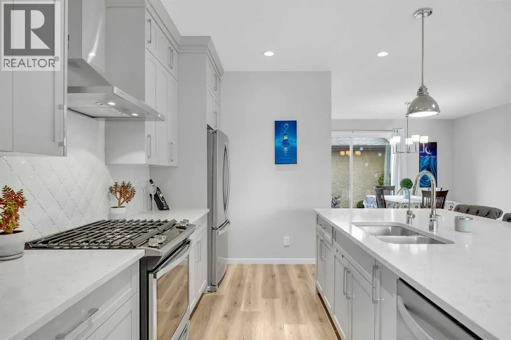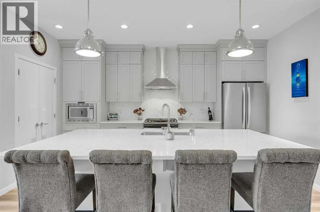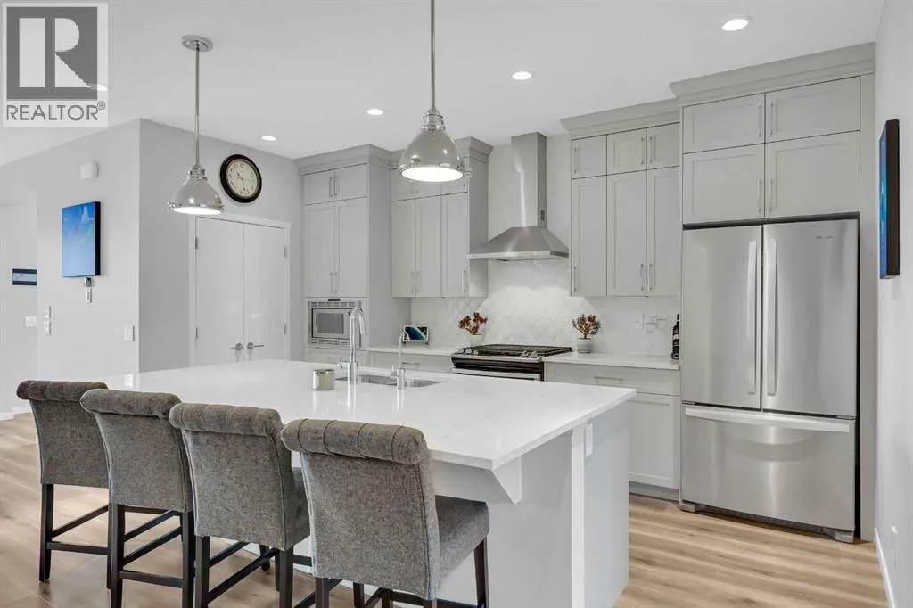 This executive paired home in Mahogany offers 1,888 sq. ft. of living space, a double detached garage, and incredible lake views.The main floor is bright and inviting, featuring oversized triple-pane windows, 9 ft. ceilings, and luxury vinyl plank flooring throughout. The stunning kitchen sits at the heart of the home and showcases extended Pewter cabinetry with soft-close doors and drawers, stainless steel appliances (including a built-in microwave and chimney hood fan), quartz countertops, and a large center island perfect for gathering with family and friends. A BBQ gas line adds convenience for outdoor entertaining.The living room takes full advantage of the lake views and includes a cozy gas fireplace, ideal for winter evenings. The spacious dining area easily accommodates a large table and provides access to the backyard patio through sliding doors. The home also features central air conditioning for year-round comfort.Upstairs youâll find two bedrooms and a convenient laundry room complete with a front-load washer and dryer. The ownerâs suite is a bright and relaxing retreat featuring a massive walk-in closet and a spa-inspired 5-piece ensuite with a soaker tub, separate shower, and private water closet.Located in an amazing estate area, just steps from the lake and beach, this home perfectly combines luxury, comfort, and the beauty of Mahoganyâs lakefront lifestyle. (id:27476)