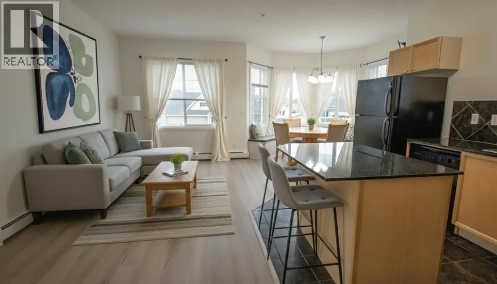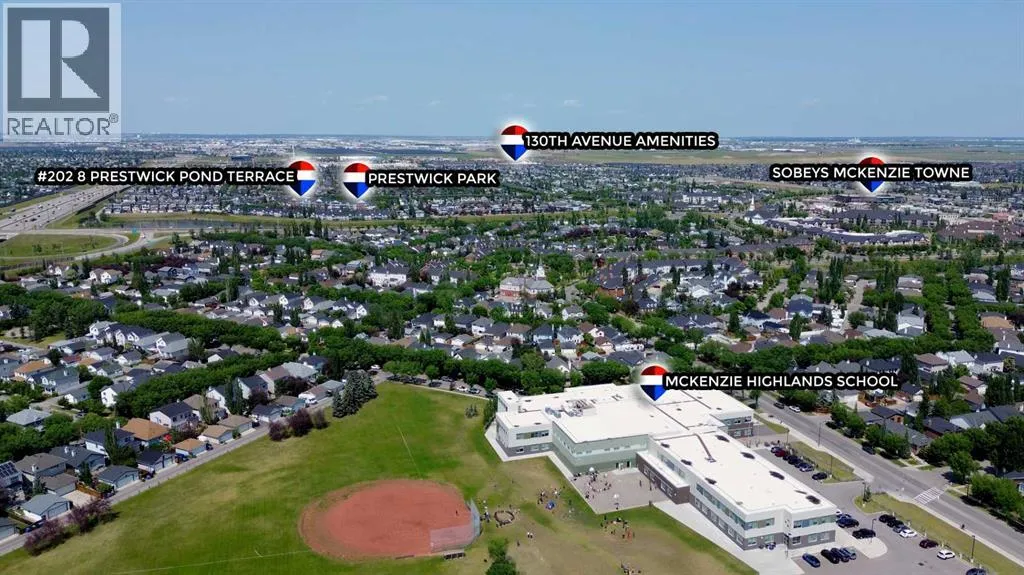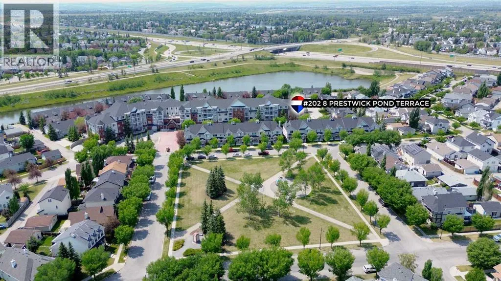Stunning 2 bed 2 bath CORNER unit in beautiful McKenzie Towne â Welcome home to 202 - 8 Prestwick Pond Terrace. This unit has been impeccably maintained in the sought-after Caledonia on the Waterfront complex. The open-concept living space welcomes with plenty of natural light and neutral colors. The well-designed kitchen features granite countertops, maple cabinetry & center island with seating overlooking the spacious living area and new luxury vinyl plank flooring. The adjacent dining area is framed by bay windows & offers access to the private outdoor balcony. The primary bedroom is generously sized, featuring a 4-piece ensuite bathroom and a walk-in closet with new carpet. A second bedroom, 3-piece bathroom with walk-in shower, and enclosed laundry complete the space. Additional building amenities include a quiet, pet-friendly complex, secure underground parking, and common living/dining/kitchen/library â perfect for gathering with family & friends. This prime location means you can walk to incredible dining & shopping, minutes to 130th Ave amenities, and easy access throughout the city on nearby Deerfoot & Stoney Trail. Enjoy the beautiful pond right outside, as well as walking and biking on local pathways. Book your viewing today! (id:27476)