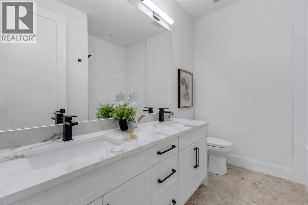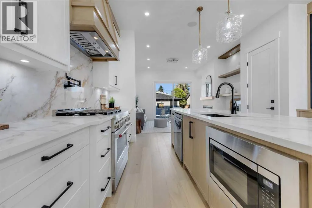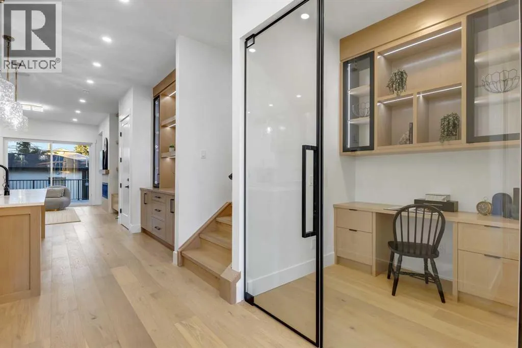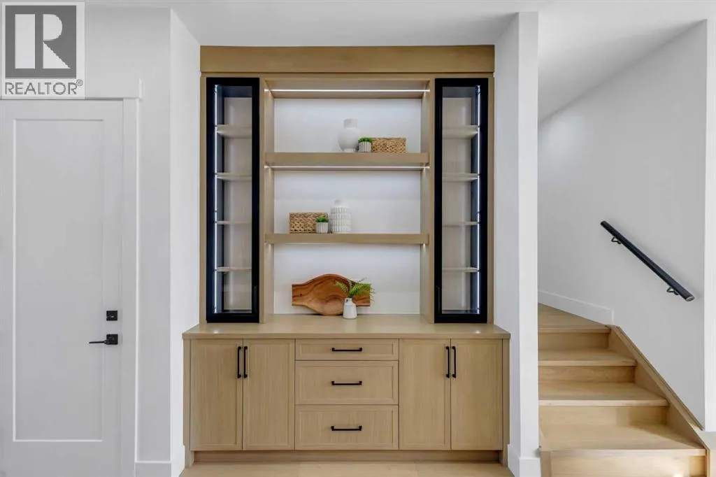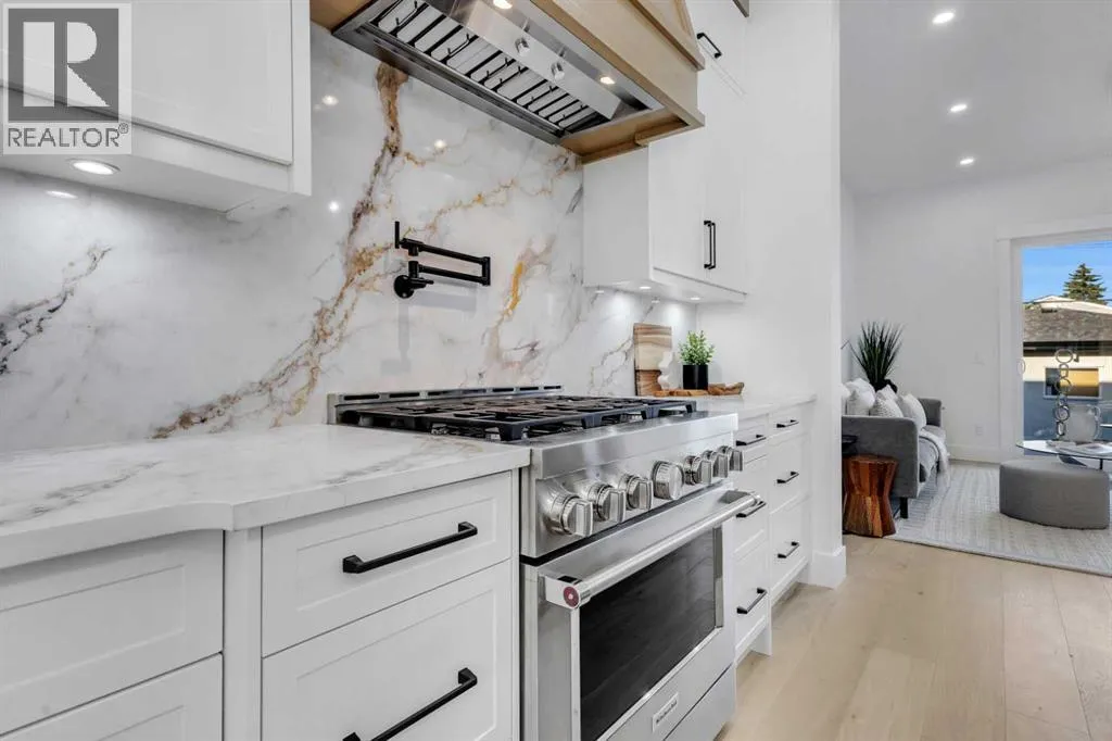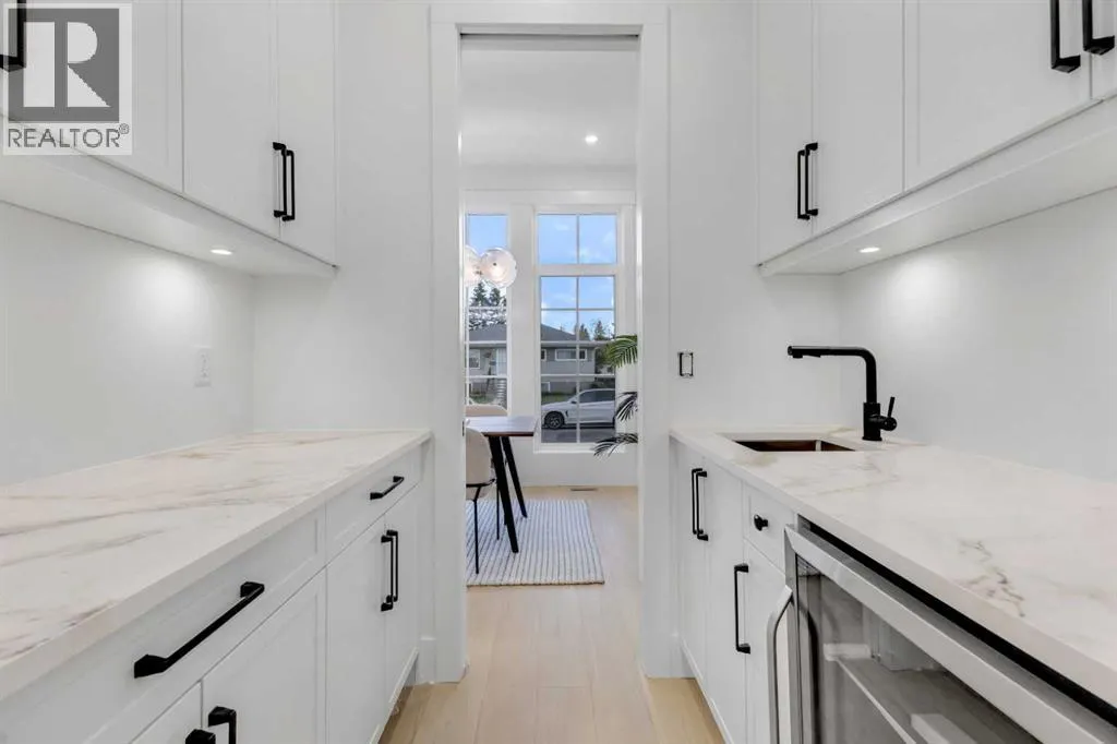 Donât miss this stunning modern infill in the heart of ROSSCARROCK, designed with HIGH-END FINISHES, a WALKTHROUGH BUTLERâS PANTRY, and a RARE 3-BED, 2-BATH LEGAL LOWER SUITE (approved by the city). With a functional open-concept layout, upscale details, and a prime inner-city location, this home delivers a perfect blend of style and practicality. The spacious foyer welcomes you inside with direct access to the formal dining area, bathed in natural light from oversized windows, making it an ideal space for hosting gatherings or enjoying everyday meals. A walkthrough butlerâs pantry seamlessly connects the dining room to the chefâs kitchen, offering custom cabinetry, a beverage fridge, a sink, and additional storageâperfect for entertaining and meal prep. The kitchen itself is a showstopper, featuring ceiling-height cabinetry, quartz counters, a full-height backsplash, and a large central island with bar seating. A stainless-steel appliance package includes a French door fridge, gas cooktop, wall oven, microwave, and dishwasher, ensuring both function and style. More storage is offered by the eye-catching coffee station or wine area, enhanced with LED lighting and glass displays. A main floor home office off the kitchen adds even more convenience for a work-from-home set up. The bright and open living room is designed for comfort and elegance, featuring an inset gas fireplace with a full-height tile surround with built-in cabinetry, and sliding patio doors taking you out to the rear deck. The rear mudroom helps keep daily essentials organized, and an upscale powder room completes the main level. Upstairs, the primary suite is a true retreat with vaulted ceilings, expansive windows, and a spacious walk-in closet. The spa-like 5-pc ensuite is designed for relaxation, featuring heated tile floors, dual sinks, a freestanding soaker tub, and a walk-in shower with full-height tile surround. Two additional secondary bedrooms share a well-appointed 4-pc bath, while a nook on the landing provides the perfect study space and a full laundry room with extra storage ensures everyday convenience. The legal lower suite (approved by the city) is a standout feature, offering a private side entrance and modern finishes as the rest of the home. With 9-ft ceilings, engineered hardwood floors, 2 FULL BATHS AND 3 FULL BEDS, this suite is ideal for tenants, extended family, or additional living space! The 4-pc baths feature tub/shower combos with full-height tile surrounds. The open-concept kitchen and living area include quartz counters, custom cabinetry, a full-size fridge, electric range, and separate laundry. Rosscarrock is a vibrant inner-city neighborhood, offering quick access to downtown via Bow Trail, transit options like Westbrook C-Train Station, and fantastic shopping & dining on 17th Ave! Outdoor lovers will appreciate Edworthy Park, Douglas Fir Trail, and Shaganappi Point Golf Course, plus top-rated schools just minutes away! *Photos from show suite. (id:27476)