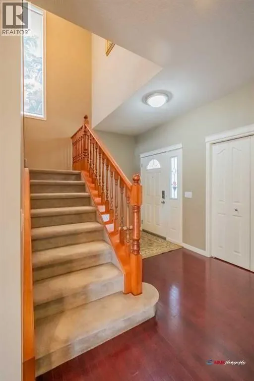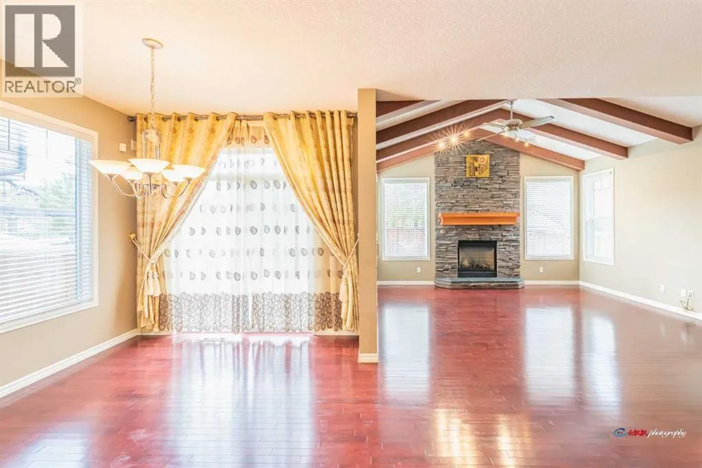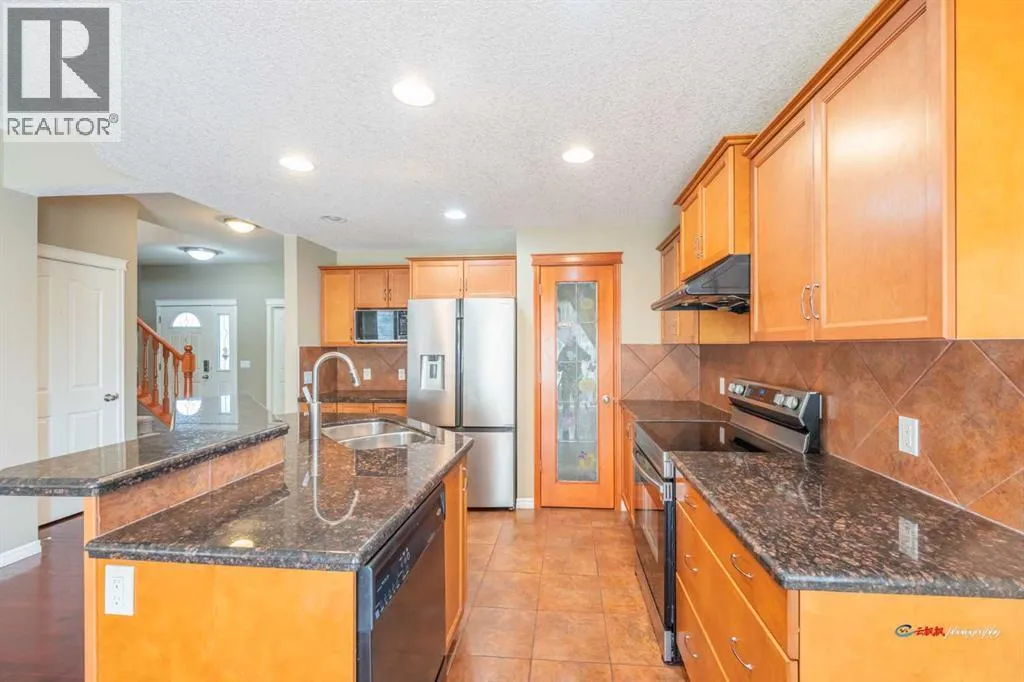 Welcome to this beautifully maintained, original-owner home offering over 3,000 sq ft of developed living space in the highly sought-after, family-friendly community of Kincora. Ideally located on a quiet street just steps from scenic green space, this spacious 4-bedroom residence combines comfort, functionality, and thoughtful upgrades throughout.The main floor features an inviting open-concept layout with a soaring vaulted ceiling in the living room, highlighted by a stunning floor-to-ceiling stone-faced fireplace and decorative ceiling beams. The chef-inspired kitchen boasts granite countertops, maple cabinetry, a raised breakfast bar, corner pantry, and newer stainless steel appliancesâincluding a refrigerator and electric stove replaced within the last two years. A bright and expansive breakfast nook opens onto a newly painted oversized deck with a BBQ gas line, perfect for outdoor entertaining.A generously sized main floor office with French doors, large window, and hardwood flooring provides an ideal work-from-home space. A convenient 2-piece powder room and laundry room complete the main level.Upstairs, a sun-filled bonus room with corner windows offers serene ravine views. The spacious primary suite includes a luxurious 5-piece ensuite with a relaxing corner soaker tub. Two additional bedrooms are thoughtfully positioned for privacy and share a 4-piece bathroom.The professionally developed basement is a true showstopperâdesigned for entertaining with a large recreation area, wet bar with wine fridge, and a full home theatre system. A fourth bedroom and another full 4-piece bathroom complete this level.Additional features include hardwood flooring on the main, upgraded underlay on the stairs, built-in sound system, central vacuum, and extra windows for enhanced natural light. Recent updates include new roof shingles, partial new siding, and a new garage door with windows.Enjoy all that Kincora has to offerâravines, parks, playgrounds, and extensive wal king/biking pathsâwhile being close to schools, shopping, and with easy access to the airport and the mountains.Donât miss your chance to own this exceptional homeâcontact your favorite REALTOR® today to schedule a private showing! (id:27476)