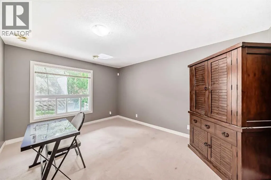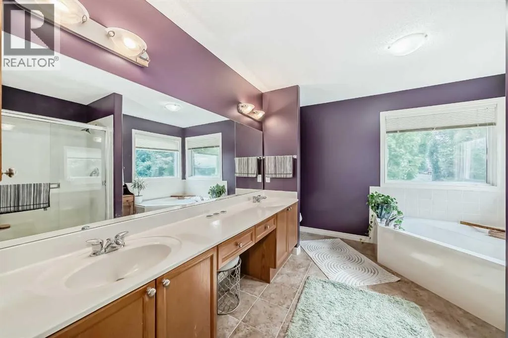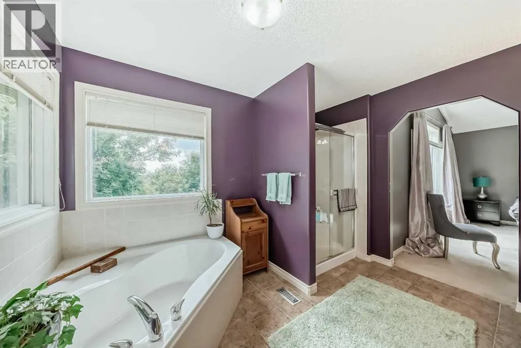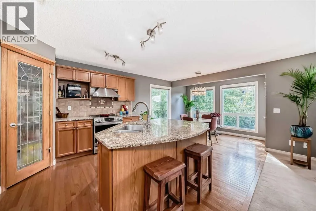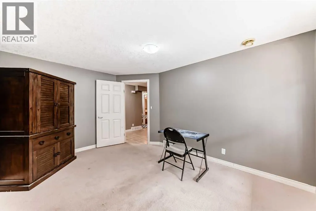 Welcome to this large family home sitting on a walkout lot with views of the Rocky Mountains! Just under 3000 total sq ft with a fully finished walkout basement. The main floor is wide open with upgraded kitchen cabinets and gleaming granite countertops. There is hardwood floors through to the kitchen, dining room & home office/den. The centre island is massive with dual undermount sinks and extra storage. There is plenty of cabinets and drawers plus a large corner pantry! Overlooking the front of the house is an oversized home office or den area~ perfect flex area for whatever you need. The garage is drywalled, insulated and heated. Upstairs you will love the custom wood railings and the huge Bonus room~ amazing entertainment space will hold any sized furniture. The Primary Bedroom has vaulted ceilings, a large walkin closet, a nice mountain view and an incredible 5 pce luxurious ensuite boasting dual sinks in the vanity, granite countertops, a deep corner soaker tub, a cozy stand up shower with corner seat and tiled floors. The two spare bedrooms are a good size (one has a handy walkin closet) and they can share the main 4 pce bathroom. The walkout level is fully finished with tiled flooring, knockdown ceiling with recessed lighting and large windows. There is a corner wet bar with upper & lower cabinets. The living room has a gas fireplace for extra comfort. There is one huge bedroom (the 4th one) and a large den (no closet but does have a stand up armoir & a big window). The basement has a full 4 pce bathroom as well. There is a good sized brick patio at the walkout entrance, a stone sidewalk comes from the front for easy access to the back. The private west facing backyard is a good size. The home has central AC, builtin vacuflo and can include the two spare fridges and the stand up freezer too. This is a great family for a large extended family. Easy walk to the Crestmont Community centre. Quick drive to get to the 16th Ave, Stoney Tr and downtown. (id:27476)