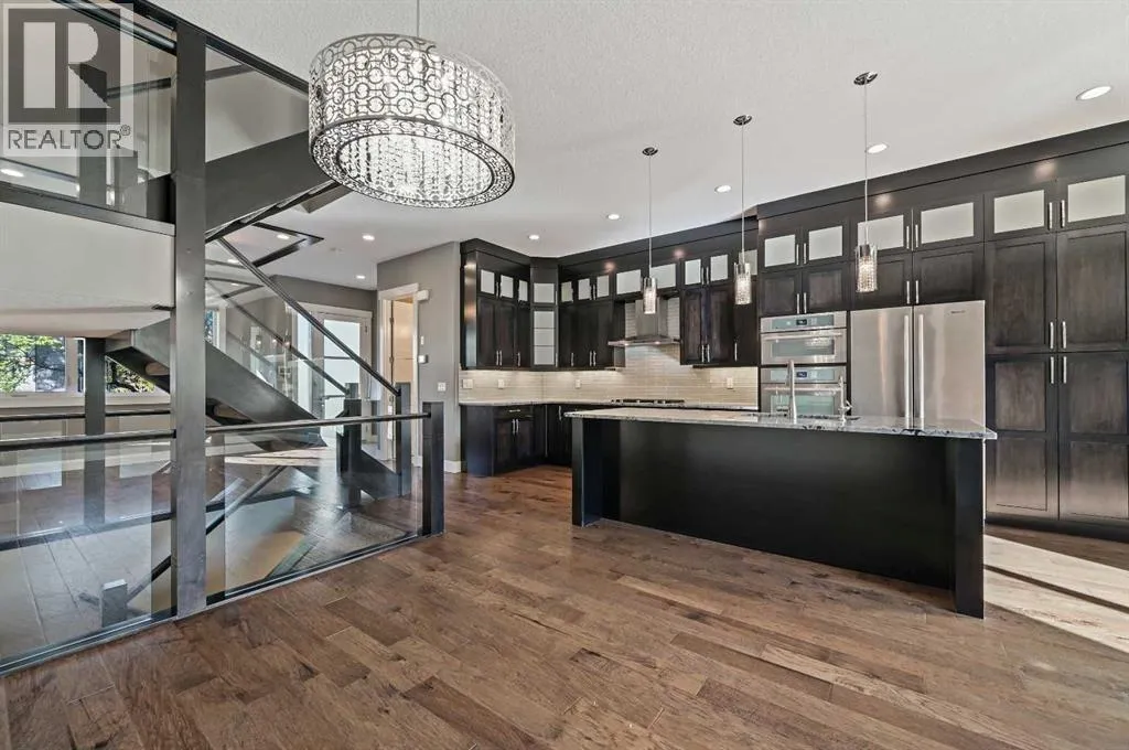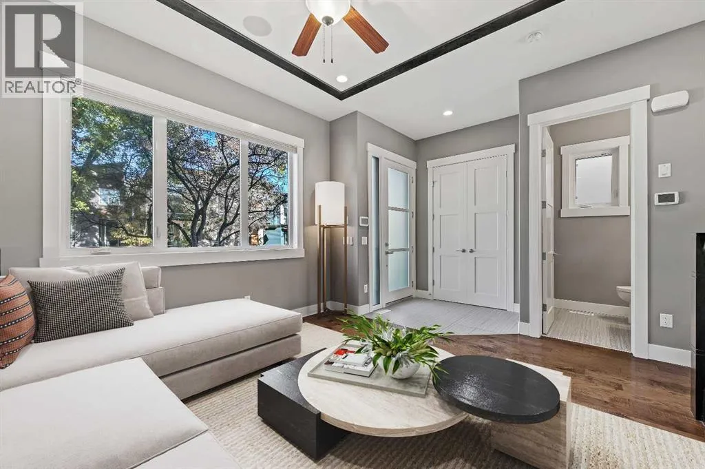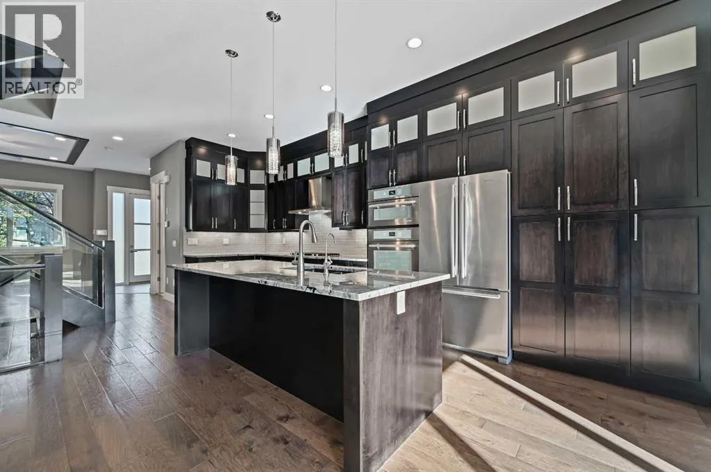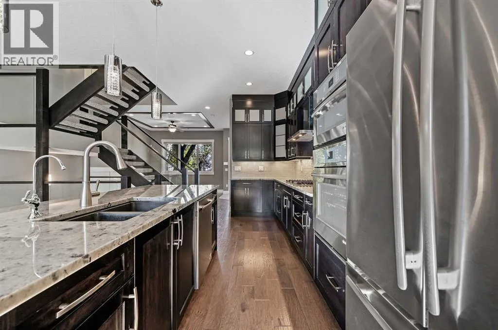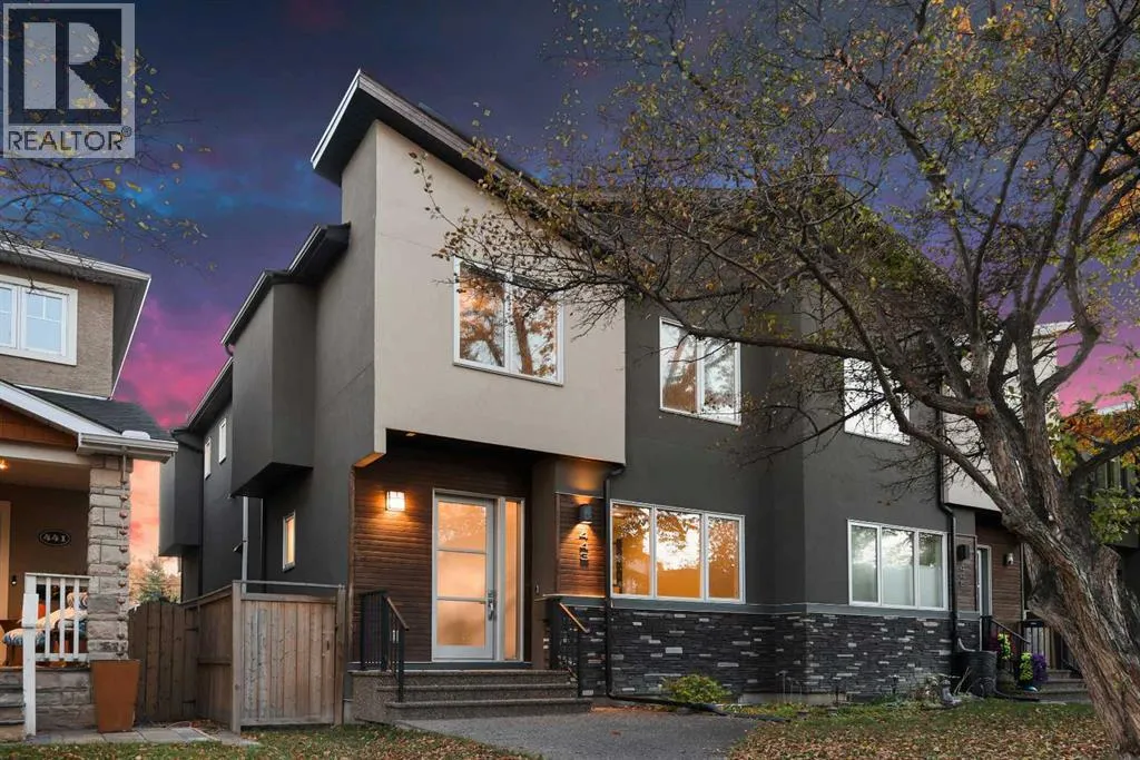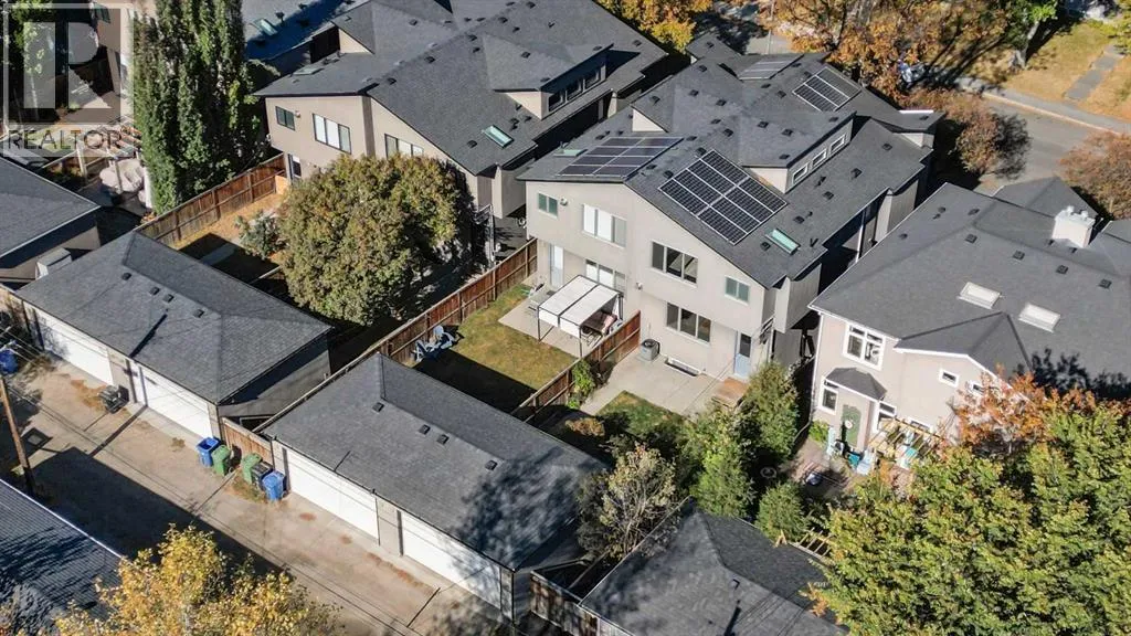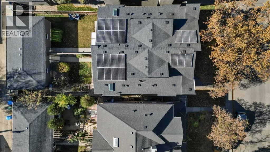 Upscale semi-detached home in Mount Pleasant offers a blend of sophistication and functionality with nearly 3000 Sq.Ft. of thoughtfully designed living space on a quiet, tree-lined street in Calgaryâs inner city.High ceilings on all three levelsâincluding the fully developed basementâ and large windows provide natural light for the open floor plans.. The main floor features textured hardwood, detailed millwork, and an architecturally striking open staircase. The gourmet kitchen, finished with granite countertops and rich dark cabinetry includes a full package of stainless Jenn-Air appliances, and dedicated water purification, centering the main level with style and practicality. Upstairs, the primary retreat includes a large customized walk-in closet and a spa-inspired 5-piece ensuite with a large jetted tub, walk in shower and dual vanity. Two additional bedrooms, central 4-piece bath, and a well-appointed laundry room complete the upper level.The lower level offers a spacious rec room, fourth bedroom, beautifully finished 3-piece bath with walk-in shower, and a sleek wet barâideal for guests and entertaining, along with in floor heat throughout. The professionally installed solar panel system (SkyFire Energy) helps to reduce energy costs while adding long-term value. Gutter protectors (Gutter Doctor) and high-quality finishings throughout speak to the care and attention invested in the home.Outdoors, the south-facing backyard offers a private retreat with two productive garden plots, a shaded patio area along the garage, and a charming garden strip that runs along the walkway and fence.Set on a quiet avenue framed by a mature tree canopy, this location balances serenity with walkability. Ãcole de la Rose Sauvage and St. Josephâs School are just steps away. Walk to Linaâs Market, Safeway, Confederation Park, and local favourites like 4th Spot, Our House, and Turca. Transit access is quick and convenient with nearby BRT and local routes.Minutes to downtown an d just 15 minutes to the airportâthis home delivers upscale inner-city living without compromise. (id:27476)