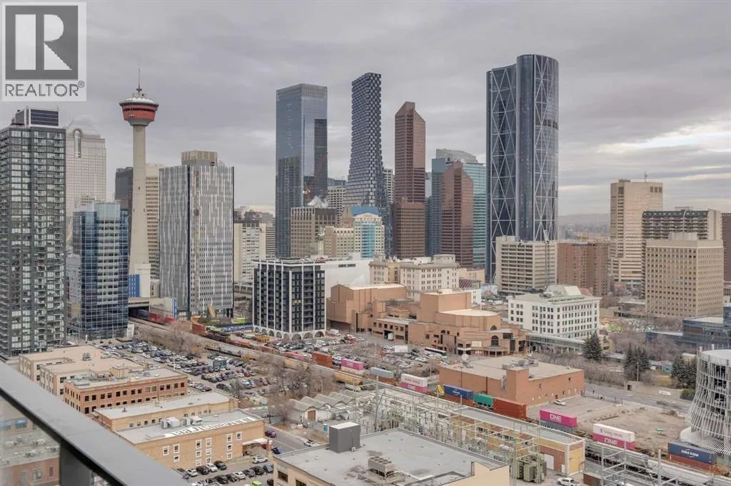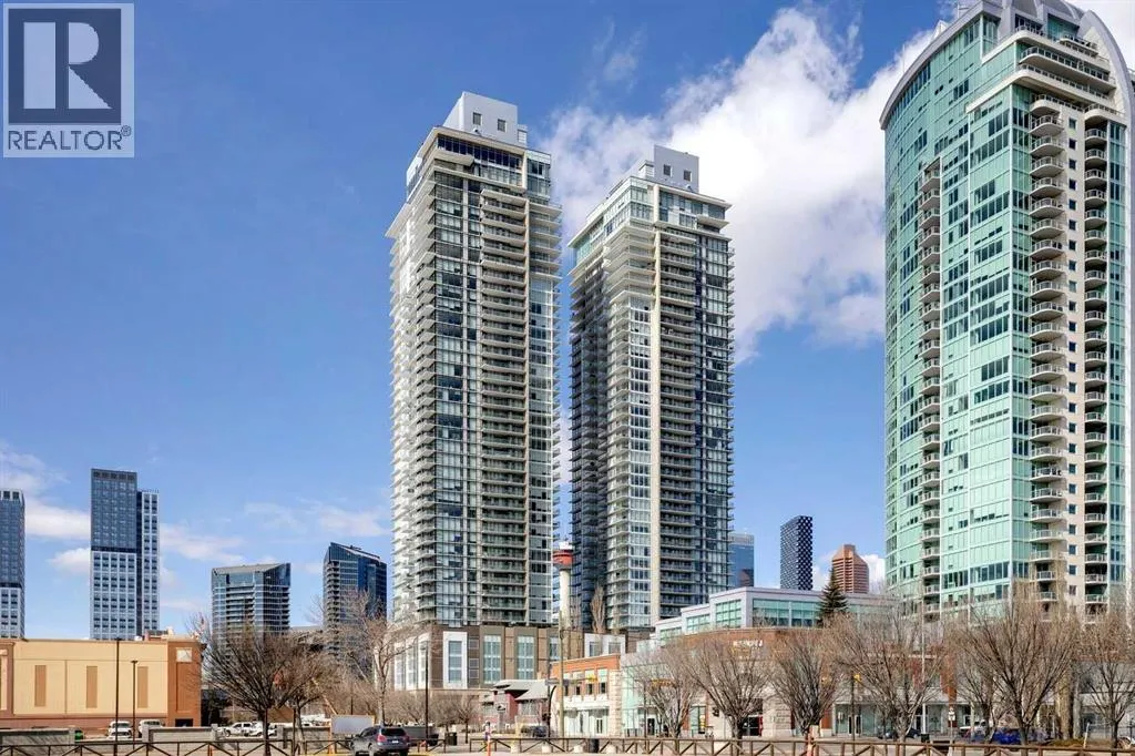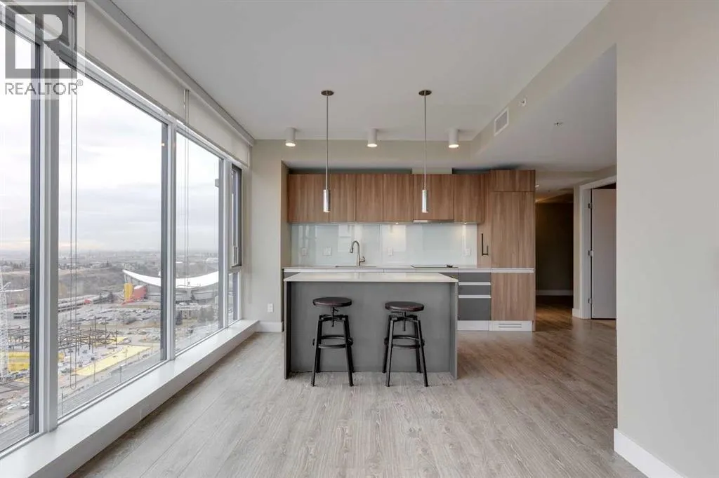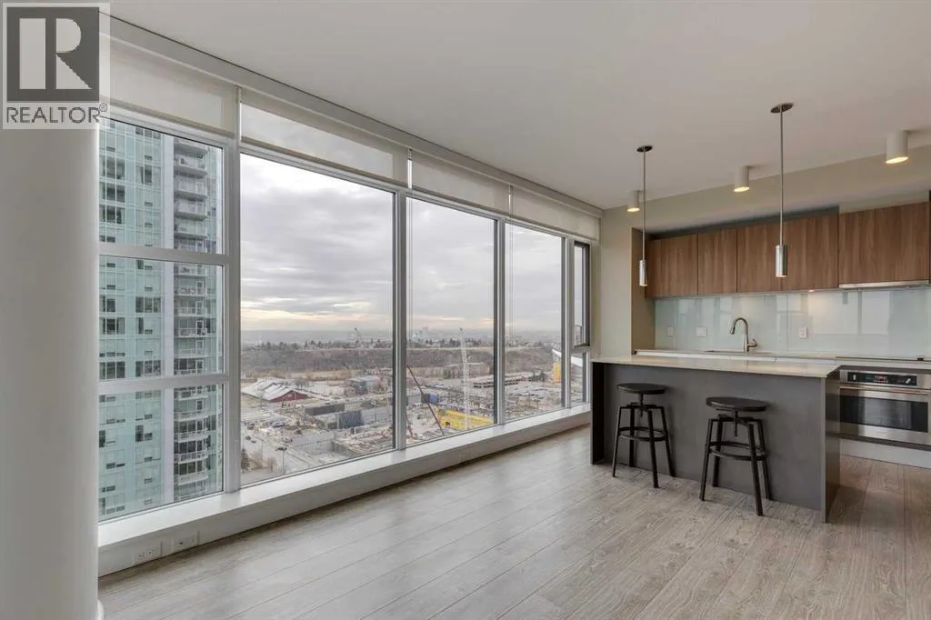 Welcome to The Guardian â Where Contemporary Design Meets Urban Sophistication. Perched on the 22nd floor and occupying the coveted northeast corner, this 2-bedroom, 2-bath residence offers panoramic views of downtown Calgary and the vibrant city skyline. Step inside to discover a sleek, European-inspired kitchen featuring integrated appliances, smooth-panel cabinetry, under-cabinet lighting, and a stylish central island that seamlessly connects to the open-concept living area. Expansive floor-to-ceiling windows flood the space with natural light, creating an airy, modern atmosphere ideal for both relaxing and entertaining. Both bedrooms are generously sized, including a primary suite with a 4-piece ensuite featuring a tub-shower combo. The second bedroom is served by a contemporary 3-piece bathroom with a walk-in glass shower. Additional highlights include in-suite laundry, a spacious balcony perfect for morning coffee or evening sunsets, titled underground parking, and assigned storage. As a resident of The Guardian, youâll enjoy access to exceptional amenities: a fully equipped fitness centre, yoga studio, resident lounge, games and social rooms, workshop, garden terrace, secure bike storage, and 24-hour concierge service for ultimate convenience and peace of mind. Ideally located just steps from the Saddledome, East Village, Central Library, Stampede Park, and Calgaryâs best dining, shopping, and entertainment â this is urban living at its finest. Book your private showing today and experience life at The Guardian. (id:27476)