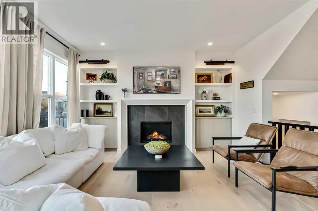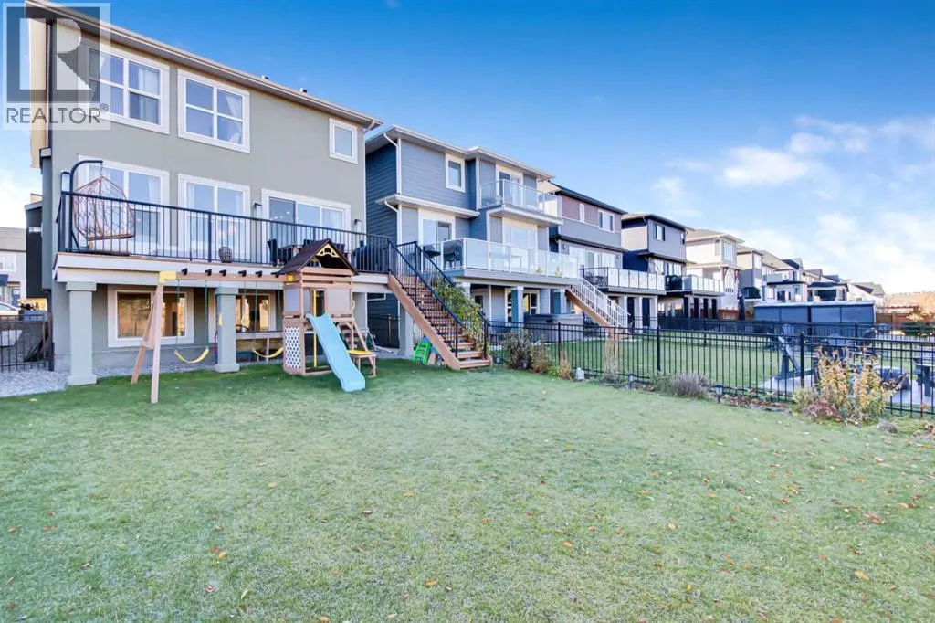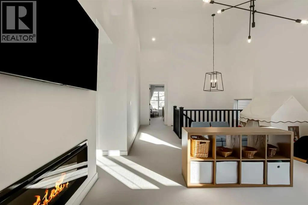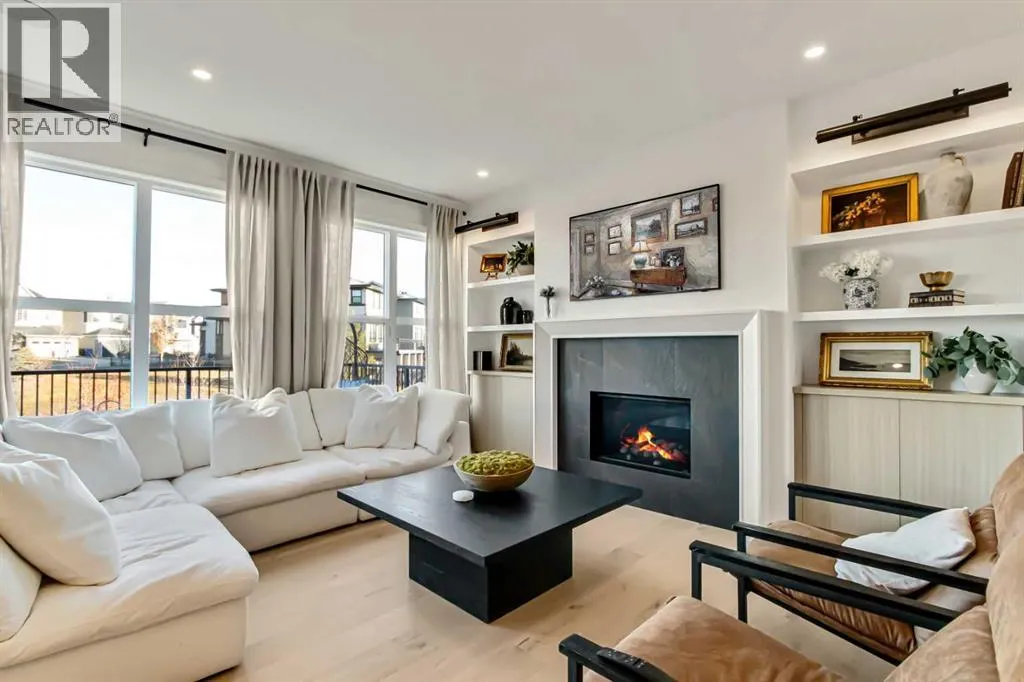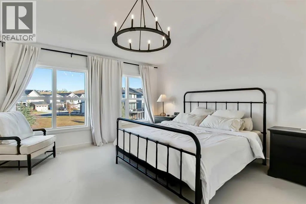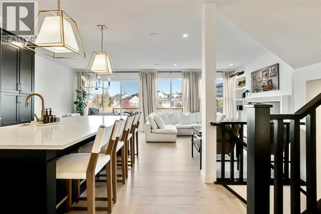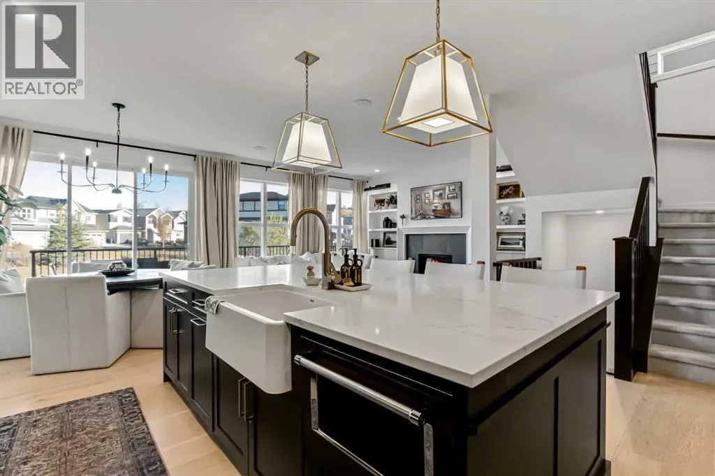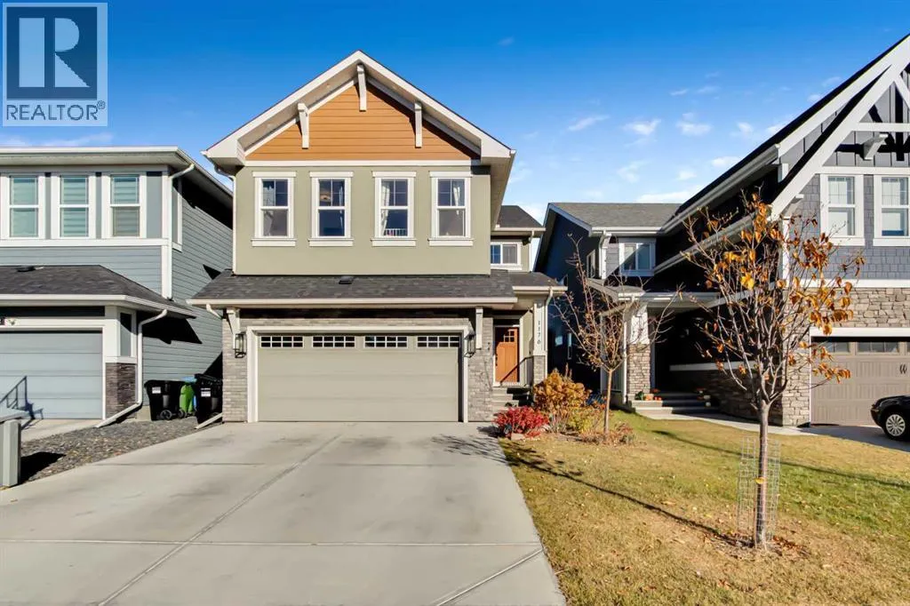 Welcome to this stunning, fully upgraded 4 bedroom, 3.5 bath home in the highly sought after community of Cranstonâs Riverstone. Perfectly positioned backing onto green space and just steps from the river, walking paths and the pond, this 2,402 sq.ft home blends luxury finishes with thoughtful design. The main floor offers an elongated entryway leading to an open concept living area flooded with natural light, a beautiful gas fireplace surrounded by custom built ins, a gourmet kitchen with quartz counters and backsplash, upgraded KitchenAid black stainless steel appliances, gas range with pot filler, custom hood fan, farmhouse sink, dining room, large walk in pantry and designer lighting. A custom mudroom with built in lockers adds everyday convenience. Upstairs features three bedrooms and two full baths, including a secondary bath with double vanities - perfect for sharing. The primary bedroom impresses with vaulted ceilings, a spa like ensuite, complete with a freestanding tub, rain shower with marble and zellige style tile, separate vanities and a large walk in closet connected to a convenient laundry room. A spacious vaulted bonus room completes the upper level. Downstairs, the fully finished basement includes a fourth bedroom, office space, full bath, wet bar with quartz counters/sconces and a cozy living area with an electric fireplace - ideal for entertaining. With over 100k in premium upgrades, including heated floors, custom cabinetry, built in speakers, smart lighting and rough ins for A/C and central vac, this home offers modern comfort and timeless style in a beautiful natural setting. (id:27476)
