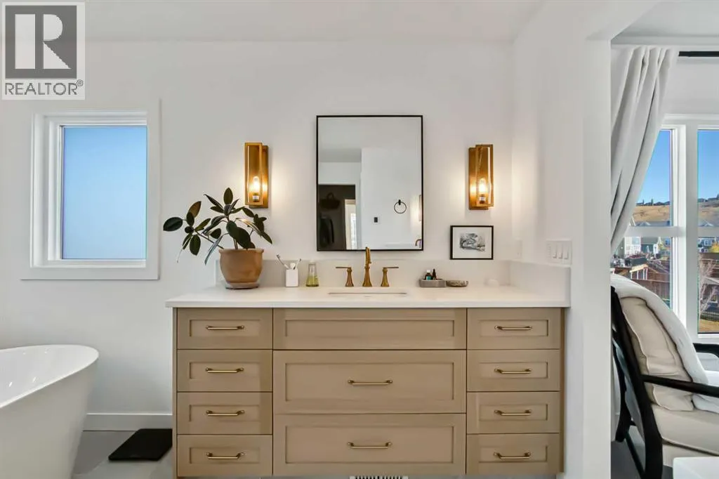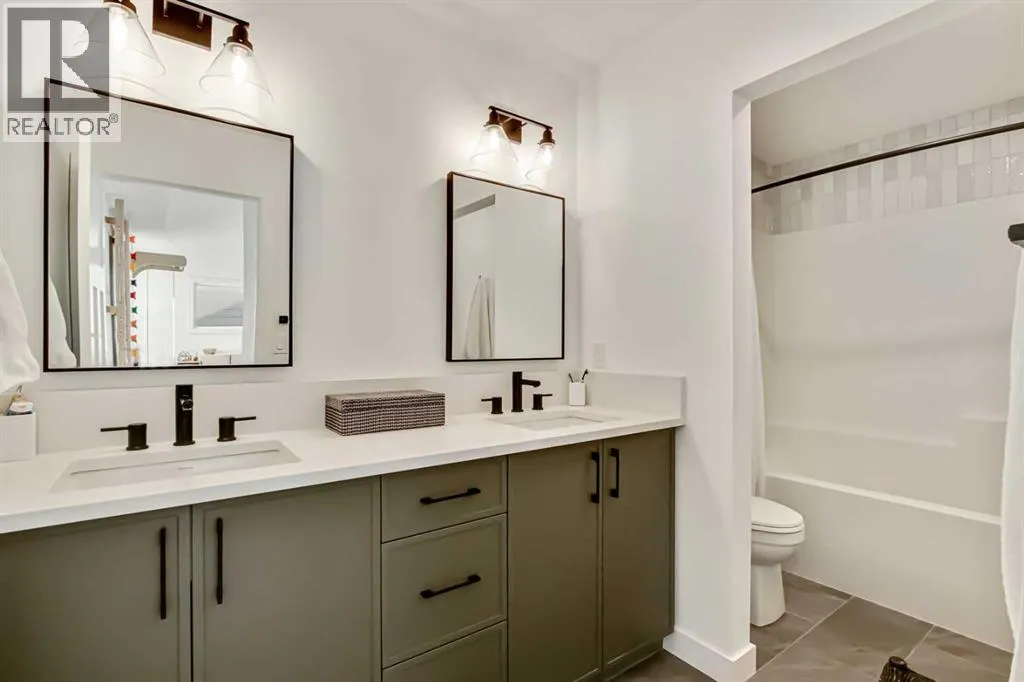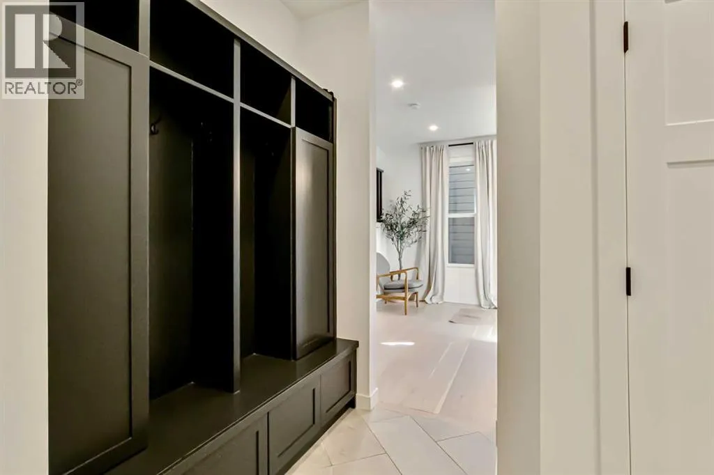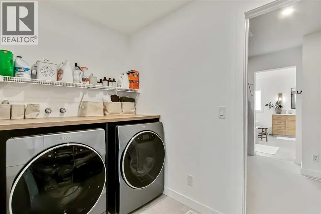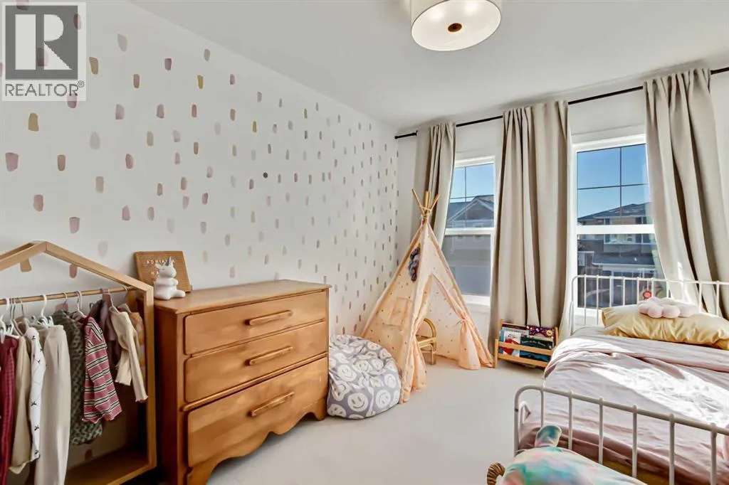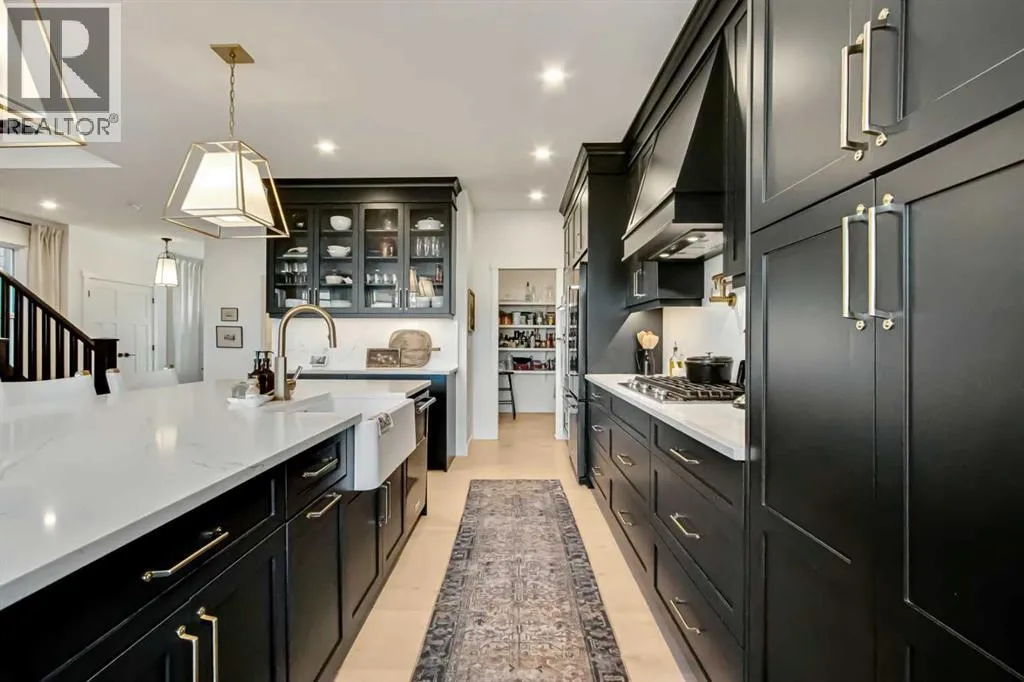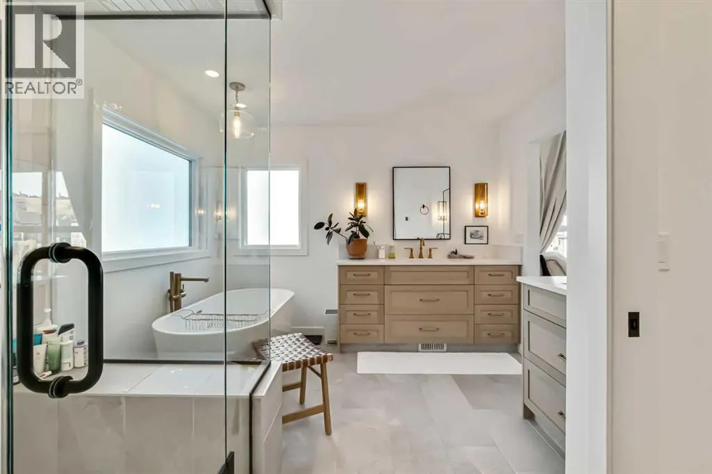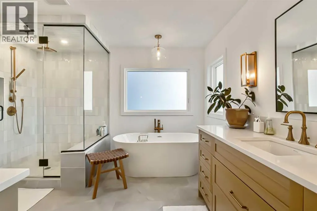 Welcome to this stunning, fully upgraded 4 bedroom, 3.5 bath home in the highly sought after community of Cranstonâs Riverstone. Perfectly positioned backing onto green space and just steps from the river, walking paths and the pond, this 2,402 sq.ft home blends luxury finishes with thoughtful design. The main floor offers an elongated entryway leading to an open concept living area flooded with natural light, a beautiful gas fireplace surrounded by custom built ins, a gourmet kitchen with quartz counters and backsplash, upgraded KitchenAid black stainless steel appliances, gas range with pot filler, custom hood fan, farmhouse sink, dining room, large walk in pantry and designer lighting. A custom mudroom with built in lockers adds everyday convenience. Upstairs features three bedrooms and two full baths, including a secondary bath with double vanities - perfect for sharing. The primary bedroom impresses with vaulted ceilings, a spa like ensuite, complete with a freestanding tub, rain shower with marble and zellige style tile, separate vanities and a large walk in closet connected to a convenient laundry room. A spacious vaulted bonus room completes the upper level. Downstairs, the fully finished basement includes a fourth bedroom, office space, full bath, wet bar with quartz counters/sconces and a cozy living area with an electric fireplace - ideal for entertaining. With over 100k in premium upgrades, including heated floors, custom cabinetry, built in speakers, smart lighting and rough ins for A/C and central vac, this home offers modern comfort and timeless style in a beautiful natural setting. (id:27476)