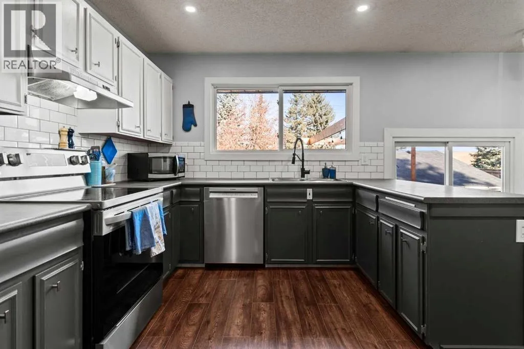*OPEN HOUSE TODAY Nov 9 12-2:30pm* This property is a MUST SEE! Tucked away on a large traditional lot, this beautiful bungalow offers timeless character with numerous updates throughout. Step inside to discover a bright main floor with a traditional layout featuring three spacious bedrooms, including a primary suite with its own 2-piece ensuite. A cozy brick-facing wood-burning fireplace is a standout feature, enjoyed from both the living and dining rooms. The expansive kitchen impresses with stainless steel appliances, ample counter space, a massive window overlooking the backyard, a chalkboard wall, and a full pantry wall that doubles as a stylish coffee bar or entertaining station. Step through sliding patio doors to your private backyard oasis â a sunny retreat complete with a deck and pergola lit by Edison bulbs, a BBQ gas hookup, raised garden beds, an irrigation system, a rain barrel, and a storage shed. The oversized garage (21â4â x 21â7â) is a dream come true for hobbyists, mechanics, or makers â fully equipped with electric heat and air conditioning, built-in worktables, bin storage, a ceiling fan, an EV plug, and its own 100-amp panel. The ultimate workspace! The fully finished lower level offers endless possibilities â a spacious rec room and games area with a wet bar, a second gas fireplace, a 4-piece bath, a den/office or fourth bedroom, a laundry room, a dry sauna, and plenty of storage. Recent upgrades include newer electrical, furnace, hot water tank, roof, lighting, windows, laminate flooring, A/C, paint and baseboards downstairs, Cat 5 wiring in every room, wood panel accents and linen storage in the hallway, and a refreshed deck and fence. This home is truly move-in ready â yet still brimming with potential for your personal touch. Add in a welcoming community with programs and events through the Cedarbrae Community Association, and youâve found the perfect home that combines character, comfort, and convenience in one irresistible package. Youâl l love being minutes from everything â multiple schools, churches, parks, Southcentre Mall, Rockyview Hospital, and the greenspaces and pathways connecting South Glenmore Park, Fish Creek Park, and the Braeside off-leash dog park. With quick access to Stoney Trail, Glenmore, Macleod, and 22X, the entire city is at your doorstep. Stylish, functional, and filled with warmth â this is the perfect place to call home. (id:27476)