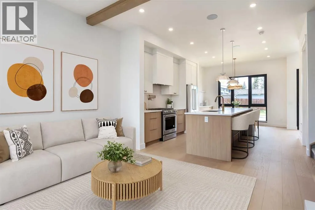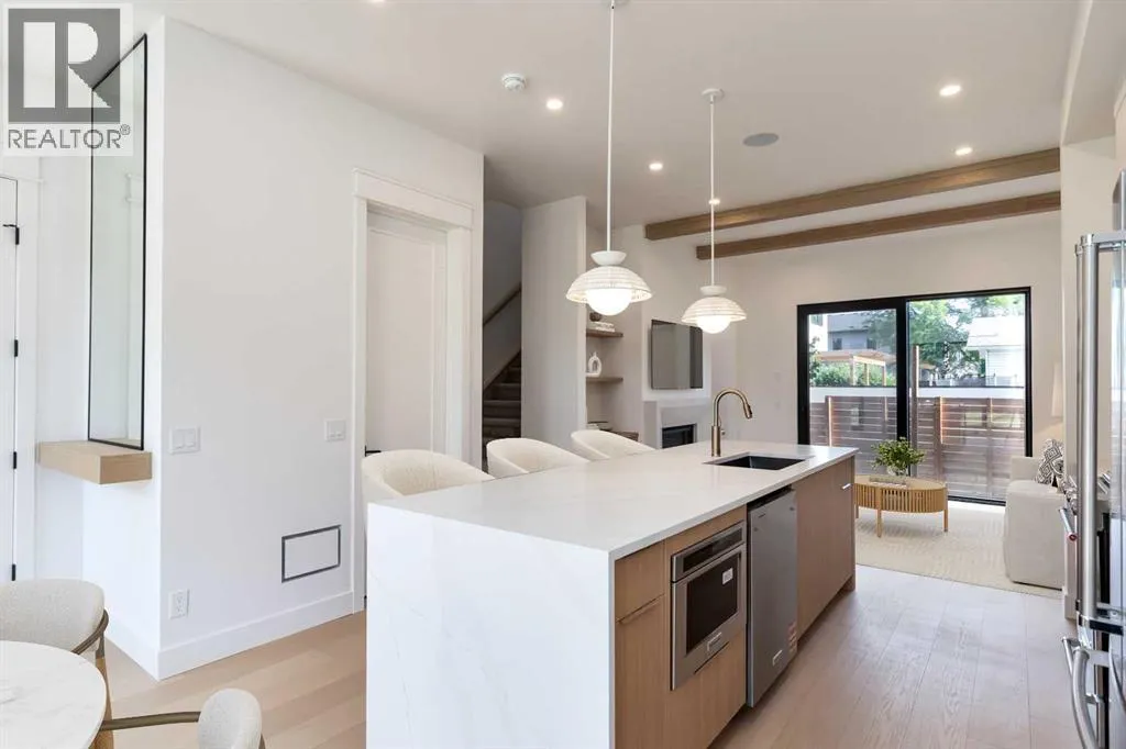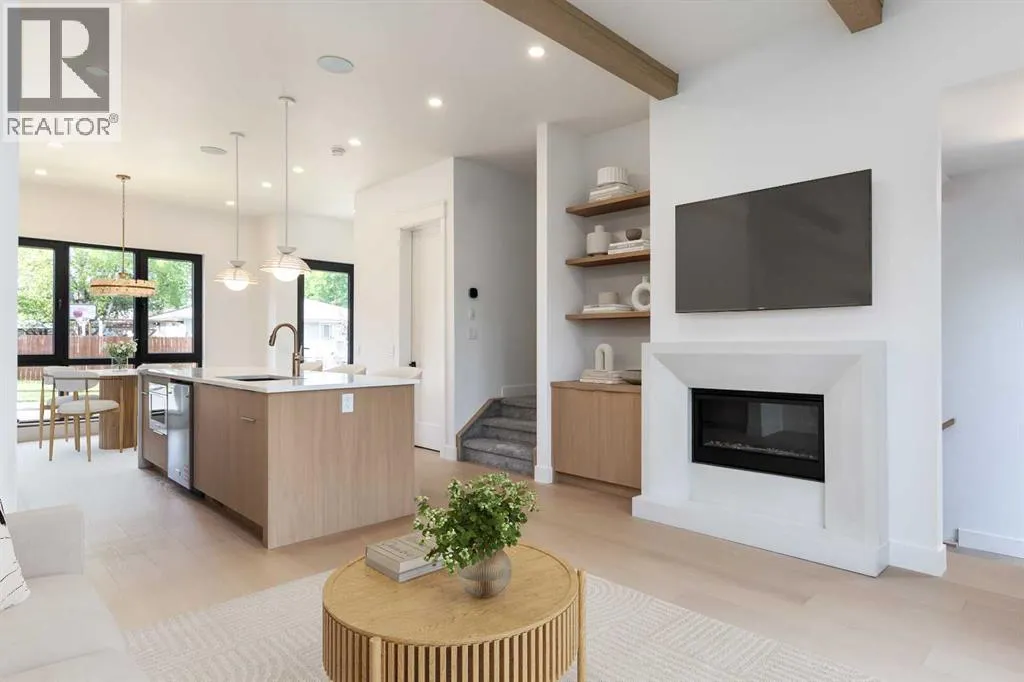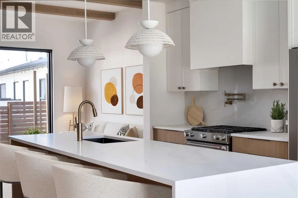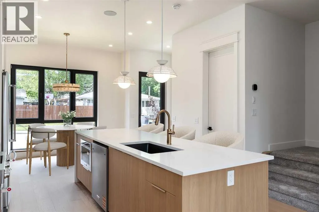 Introducing âThe Jonesâ by A Home Making Company, a boutique builder known for design-driven, meticulously crafted homes in Calgaryâs inner-city communities. Every detail reflects a focus on quality, comfort, and timeless design a combination rarely found in todayâs market. The chef-inspired kitchen features premium KitchenAid stainless steel appliances including a gas range, hood fan, dishwasher, and space-saving drawer microwave. Quartz countertops, a bookmatched backsplash, pot filler, and built-in garbage and recycling drawers combine luxury and function. The main floor offers 10-foot ceilings, exposed beams, and a gas fireplace with AHMCâs signature custom concrete surround. Built-in shelving and a buffet with matching quartz add both storage and style. The front entrance includes a mirror and custom closet organizer, while a vaulted, chic powder room adds architectural detail. Upstairs, the primary suite features vaulted 13-foot ceilings, exposed beams, and oversized windows that fill the space with natural light. A custom walk-in closet with full-length mirror and ample custom storage. Step inside your breathtaking ensuite, heated floors, double vanity, and walk-in shower with floating bench. The second bedroom includes a custom closet organizer and access to a full bathroom, ideal for family or guests. A skylight brightens the landing, complementing the high ceilings throughout. The lower level is designed for entertaining, with a media room, full wet bar, built-in TV wall, under-cabinet lighting, custom shelving, and beverage fridge. A third bedroom and full bathroom offer privacy and comfort, highlighted by sunshine windows and exceptional finish quality. Materials include 7.5-inch oak engineered hardwood, soft-close custom cabinetry, 8-foot doors, and European tilt-and-turn windows with phantom screens. Mechanical features include air conditioning, rough-in in-floor heating, 50-gallon hot water tank, HRV system, sump pump, and programmable Eco B Smart thermostats. The exterior offers a south-facing, low-maintenance yard with BBQ gas line, 7-foot privacy fence and gate and a single detached garage with epoxy floor. The brick and stucco façade with under-mount lighting reflects AHMCâs precision craftsmanship and attention to detail. Modern upgrades include in-ceiling speakers, Telus Fibre Optik, CAT6 wiring, and an epoxy-finished mechanical room with water sensor. Located near top public and Catholic schools, parks, shopping, and major routesâ17th Avenue, Richmond Road, Sarcee Trail, Bow Trail, and Crowchild Trailâthis home offers refined inner-city living without compromise. A Home Making Company doesnât just build houses, they build homes. Experience the difference at The Jones. (id:27476)