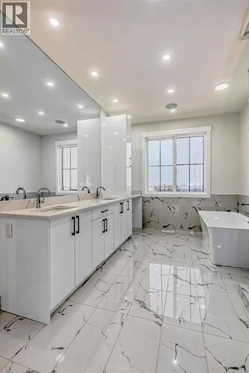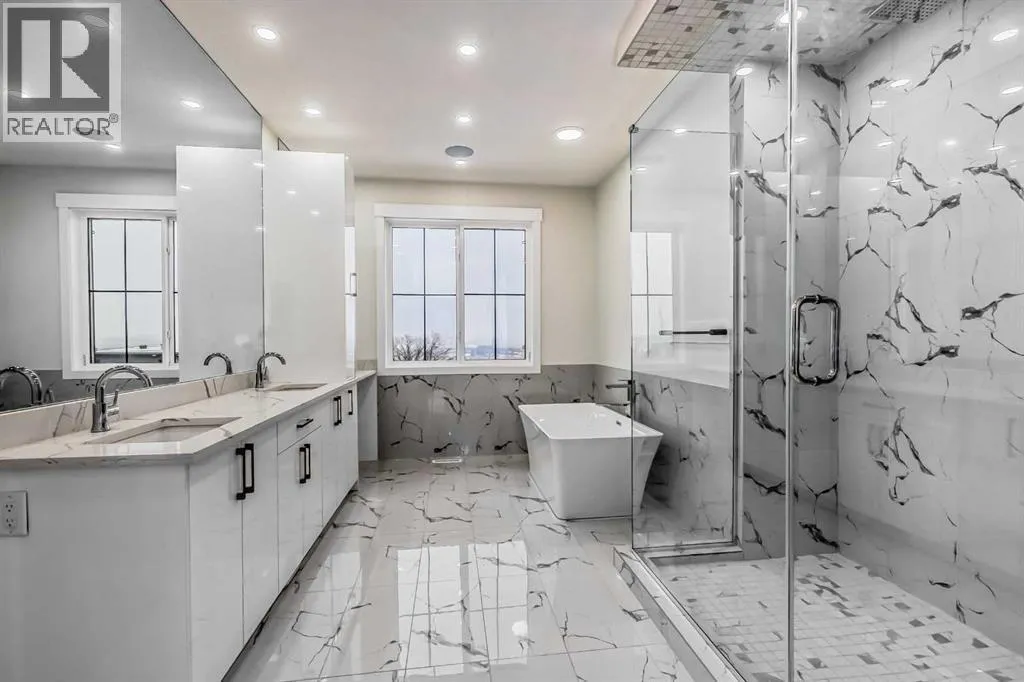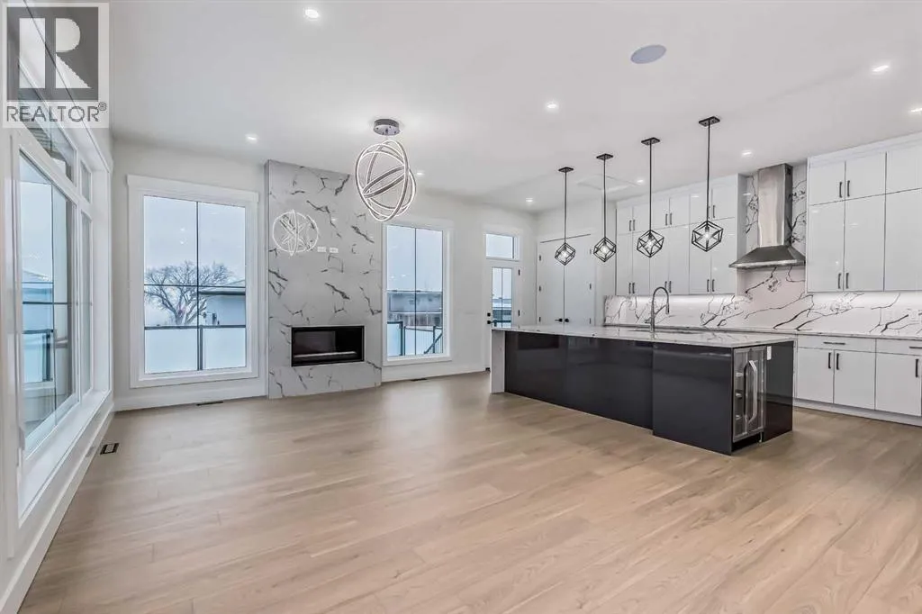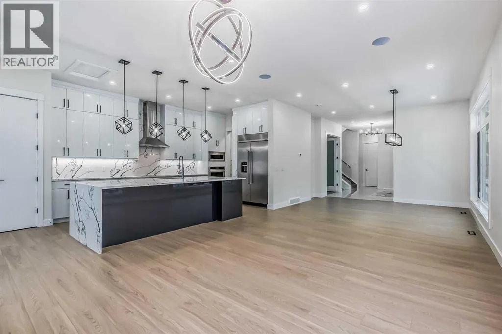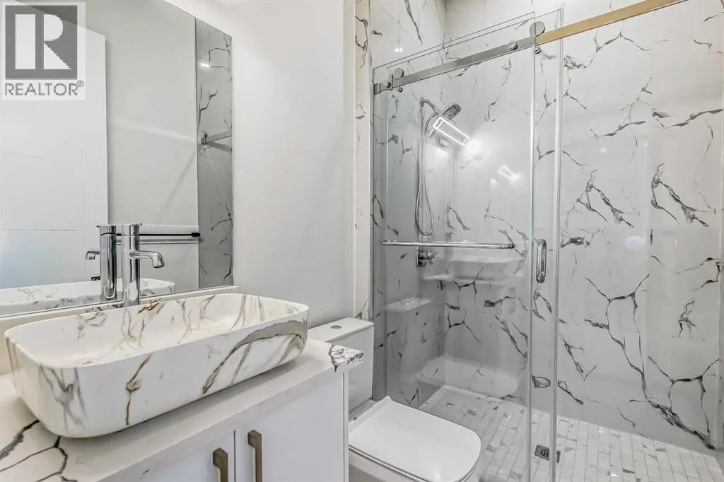 Welcome to Winston Heights, conveniently located just steps away from the golf course. This contemporary infill corner home offers nearly 3,600 square feet of living space. The property features an expansive attached garage, complemented by a separate detached garage, providing a total of four car parking spaces. The residence includes five bedrooms and 3.5 bathrooms. Abundant natural light permeates the entire home, thanks to its large windows. The main floor boasts 10-foot ceilings, an open-concept living area with premium finishes and appliances. The kitchen, featuring a marble backsplash and quartz countertops, seamlessly connects to the main living area, separated by a large island. Additionally, a gourmet kitchen and an office are situated on the main level. A glass railing guides you to the upper level. Upstairs, you will discover a spacious primary bedroom with a 5-piece En-suite and a walk-in closet. There are also two additional bedrooms, a full bathroom with dual vanity sinks, a laundry area, and a bonus room. The property includes a legal basement with a separate entrance. The basement features two well-sized bedrooms, a full bathroom, and a separate laundry facility. (id:27476)