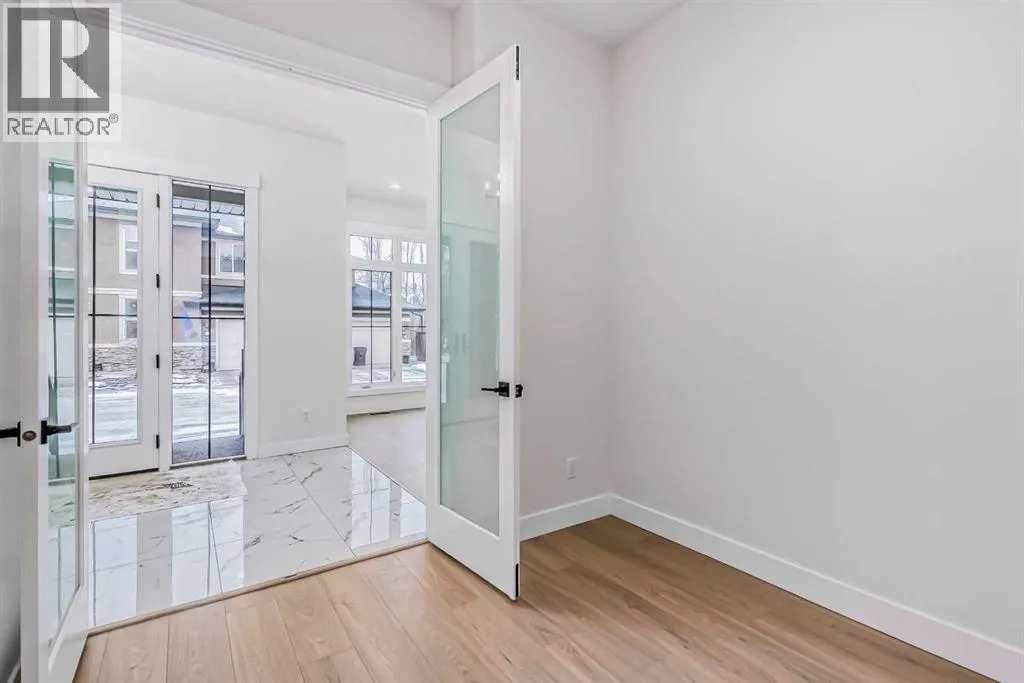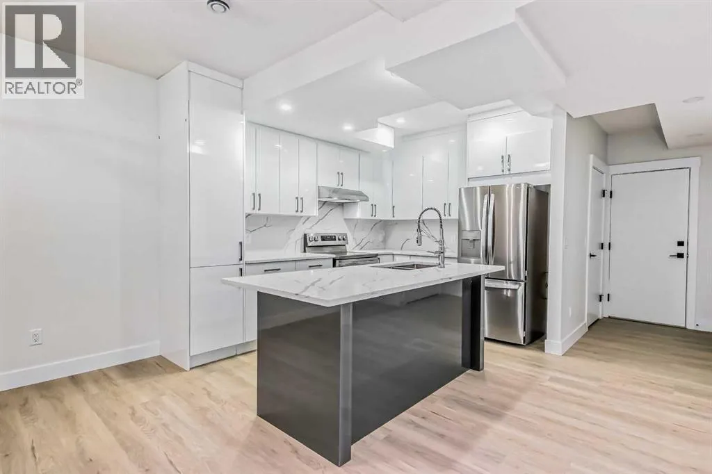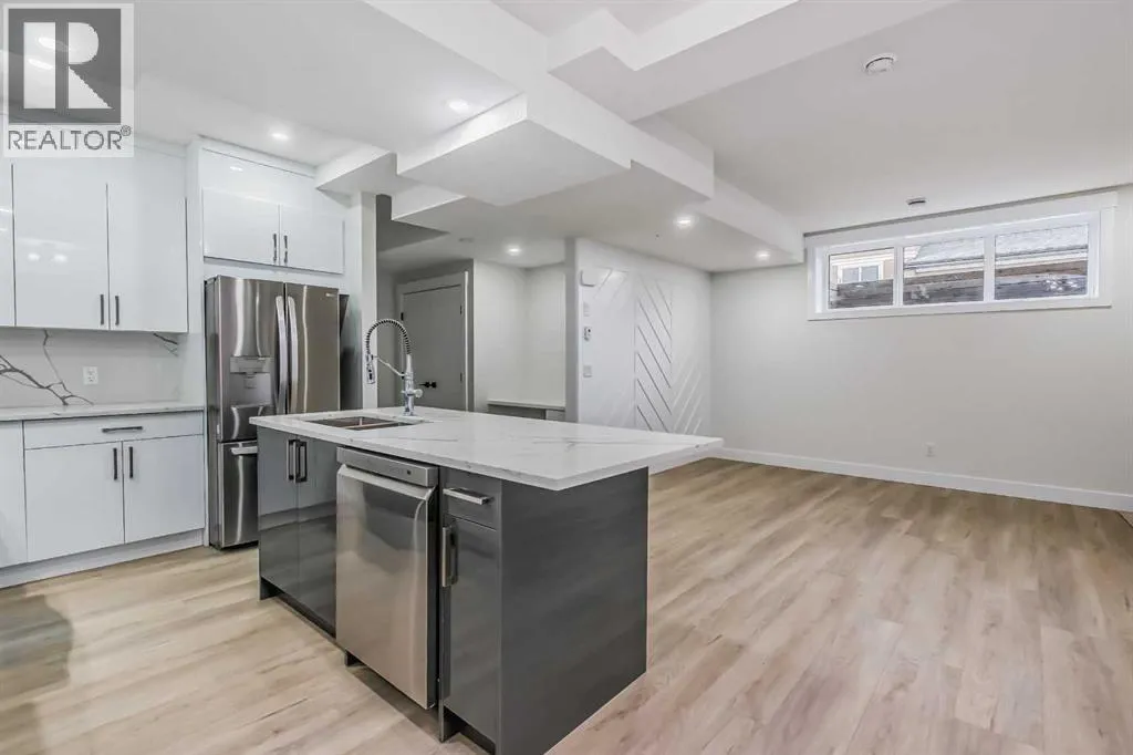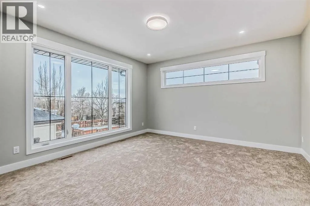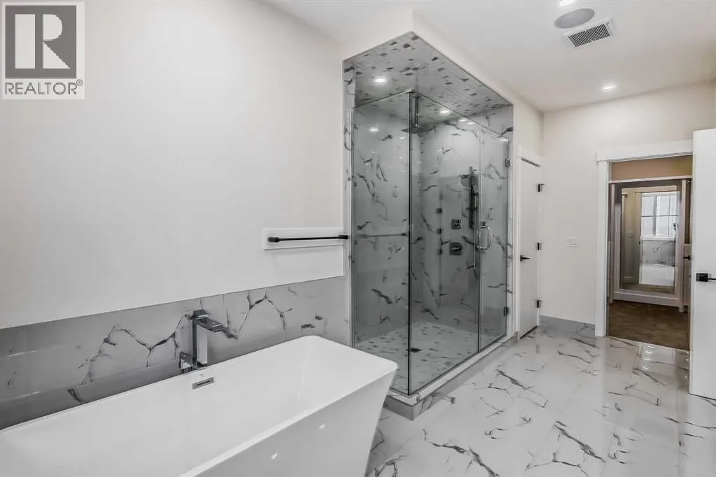 Welcome to Winston Heights, conveniently located just steps away from the golf course. This contemporary infill corner home offers nearly 3,600 square feet of living space. The property features an expansive attached garage, complemented by a separate detached garage, providing a total of four car parking spaces. The residence includes five bedrooms and 3.5 bathrooms. Abundant natural light permeates the entire home, thanks to its large windows. The main floor boasts 10-foot ceilings, an open-concept living area with premium finishes and appliances. The kitchen, featuring a marble backsplash and quartz countertops, seamlessly connects to the main living area, separated by a large island. Additionally, a gourmet kitchen and an office are situated on the main level. A glass railing guides you to the upper level. Upstairs, you will discover a spacious primary bedroom with a 5-piece En-suite and a walk-in closet. There are also two additional bedrooms, a full bathroom with dual vanity sinks, a laundry area, and a bonus room. The property includes a legal basement with a separate entrance. The basement features two well-sized bedrooms, a full bathroom, and a separate laundry facility. (id:27476)