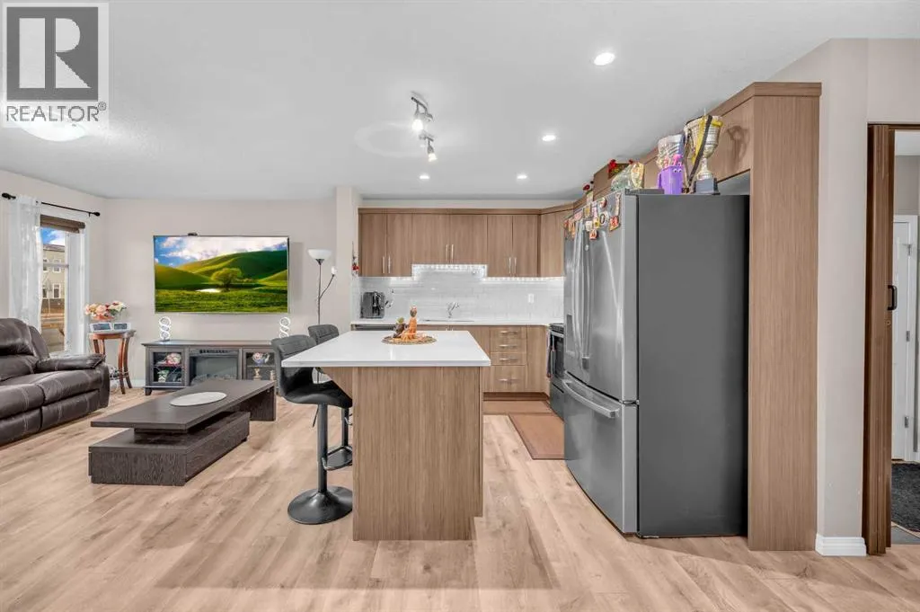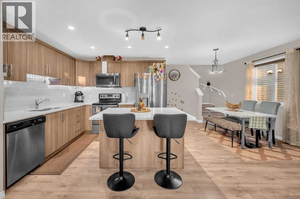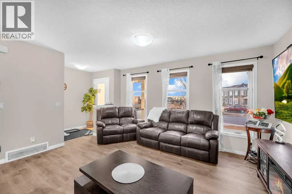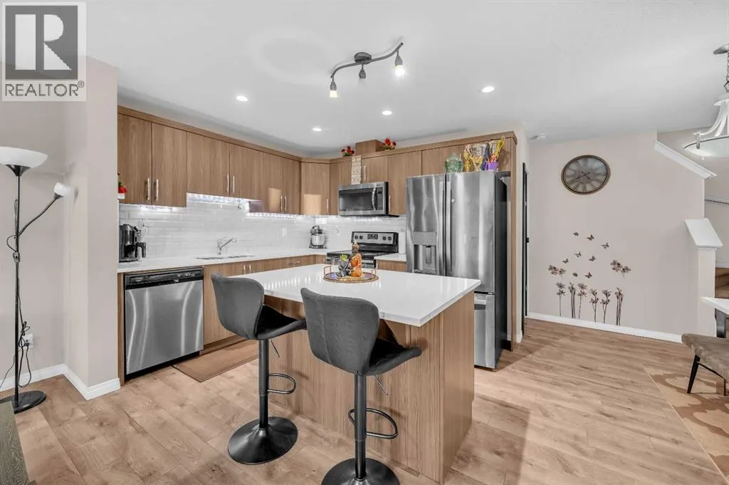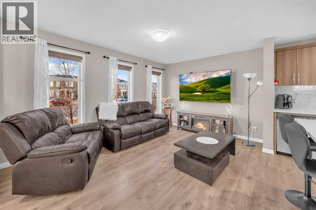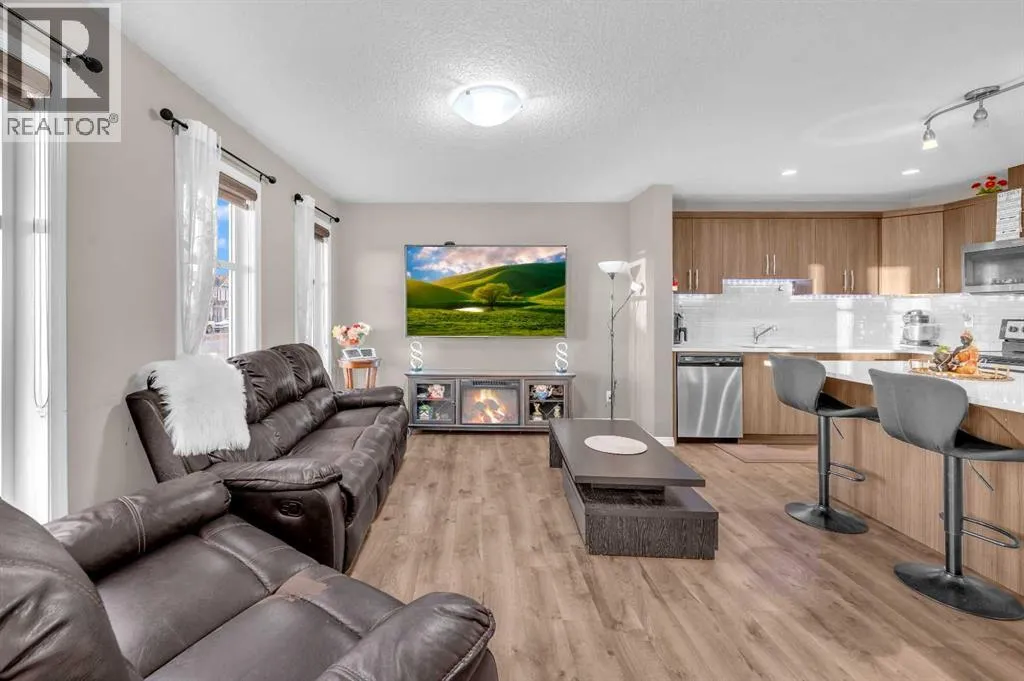 END UNIT with NO CONDO FEES and 1 bedroom illegal Basement Suite. Stylish and sun-filled, this beautifully maintained 3-bedroom end unit offers exceptional value with a double attached garage. The open-concept main floor is drenched in natural light and designed for seamless entertaining. Enjoy clear sightlines between the kitchen, dining, and living areas, complemented by brown cabinetry, quartz countertop, stainless steel appliances, and a central island with breakfast bar seating. Centralized AIR CONDITIONING provides refreshing comfort during Calgaryâs warm summer months.Convenient powder room and direct garage access make daily living effortless. Upstairs, a massive balcony sets the stage for summer BBQs and sunset views. The upper level also features a bonus room, laundry, a 4-piece family bath and three spacious bedrooms, including a private primary retreat with walk-in closet and 4-piece ensuite. The developed basement suite features an expansive living room, full kitchen and spacious bedroom with 4-piece bath. The basement includes its own separate laundry. Ideally located at a very convenient location with easy bus access and steps from green space, a community gazebo, and Cityscape Squareâhome to Starbucks, McDonalds, 7-Eleven, Indian grocery store, gas station, shops, and restaurants. Surrounded by scenic pathways and a 115-acre natural preserve, with quick access to Stoney and Deerfoot Trails, Cross Iron Mills, Costco, the airport, Genesis Centre, and Prairie Winds Park. Call your realtor today to schedule a showing. This home wonât last long. A rare opportunity to own a move-in ready home in a vibrant, walkable communityâwithout the condo fees! (id:27476)