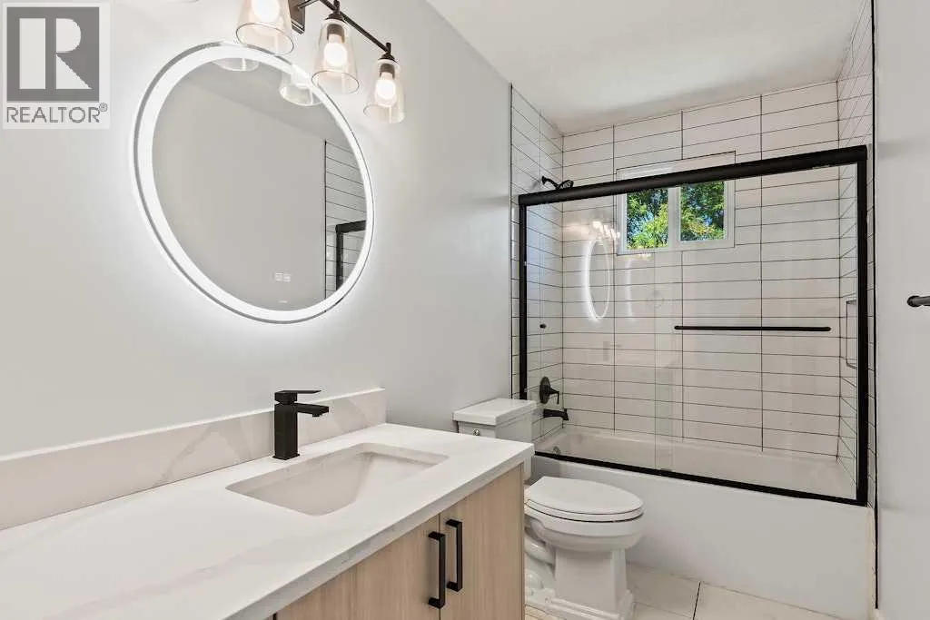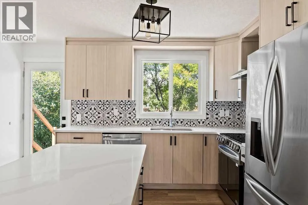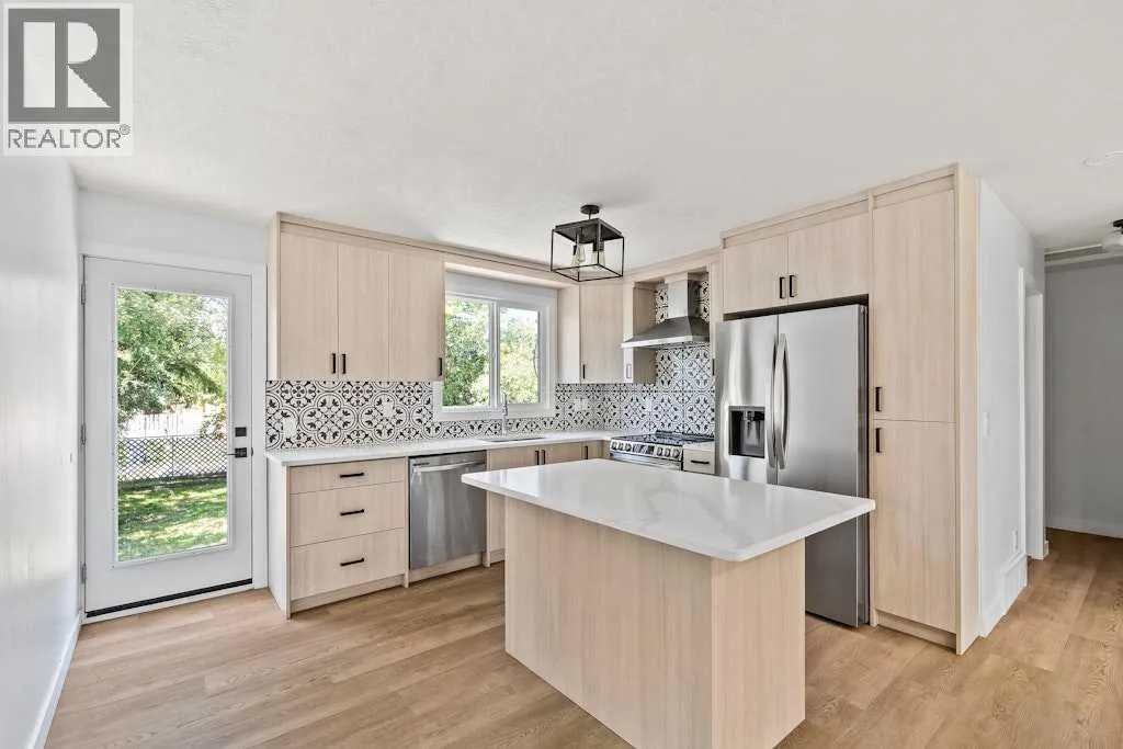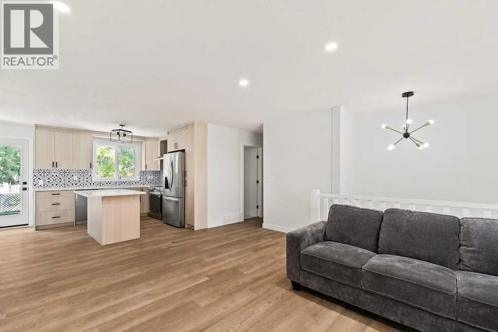 Step into this stunning, move-in-ready bi-level, where every detail has been thoughtfully reimagined for modern living. Extensively renovated from top to bottom, this home boasts new bathrooms, fresh vinyl plank flooring, and a completely redesigned kitchen with sleek new cabinetry, quartz countertops, a central island, stainless steel appliances, a statement range hood, and a Moroccan-style tile backsplash that adds a touch of character & charm. Sunlight pours through the new upstairs windows, enhancing the open-concept living & dining area, complete with a stylish new railing and doors. The main level features two spacious bedrooms, including a serene primary suite with a walk-in closet outfitted with custom organizers and a private 3-piece ensuite. The fully renovated main bath adds an extra touch of luxury. Downstairs, the fully finished basement offers exceptional versatility, with two additional bedrooms, a full 4-piece bath, laundry room, and a wet bar - perfect for extended family, guests, or entertaining. Brand new exterior doors provide both style & security on an extra large lot. Ideally located close to Village Square Leisure Centre, all levels of schools, shopping, and public transit, this home combines sophisticated upgrades with an unbeatable location. (id:27476)