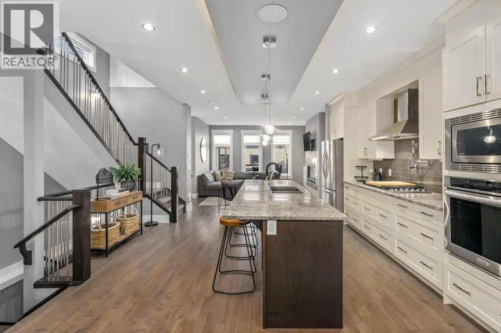 Welcome to your dream home in the heart of Montgomery, one of Calgaryâs most sought after and revitalized inner city communities! This stunning, fully finished custom built infill offers approx 2800sq. ft. of beautifully maintained living space featuring 4 bedrooms, 3.5 bathrooms, and a double detached garage.Step inside to discover an inviting open concept main floor with 9â ceilings, gleaming hardwood floors, and a sun filled living room anchored by a sleek gas fireplace with custom built-in shelving. The chefâs kitchen impresses with premium stainless steel appliances including a VIKING gas cooktop, pot filler, and an oversized granite island, perfect for entertaining. Additional main floor highlights include a spacious mudroom, bright dining area, and built-in speakers throughout.Upstairs, unwind in the luxurious primary suite complete with a spa-inspired 5-piece ensuite featuring a large steam shower, oversize jetted tub, dual vanities, and heated floors. Two additional bedrooms, a stylish 4-piece bath, and a convenient upper-level laundry complete the second floor.The fully developed basement adds incredible versatility with a large recreation room, wet bar, 4th bedroom, full bath and ample storage.Outside, enjoy low-maintenance landscaping and a custom deck with pull-down shades, the perfect spot for summer evenings. The home also features a water softener and reverse osmosis system for your comfort and peace of mind.Ideally located steps from the Bow River, parks, schools, pathways, and just minutes to popular restaurants, coffee shops, COP, Market Mall, and major routes, this property blends modern luxury with unbeatable convenience.Donât miss your chance to call this exceptional Montgomery home your own! (id:27476)