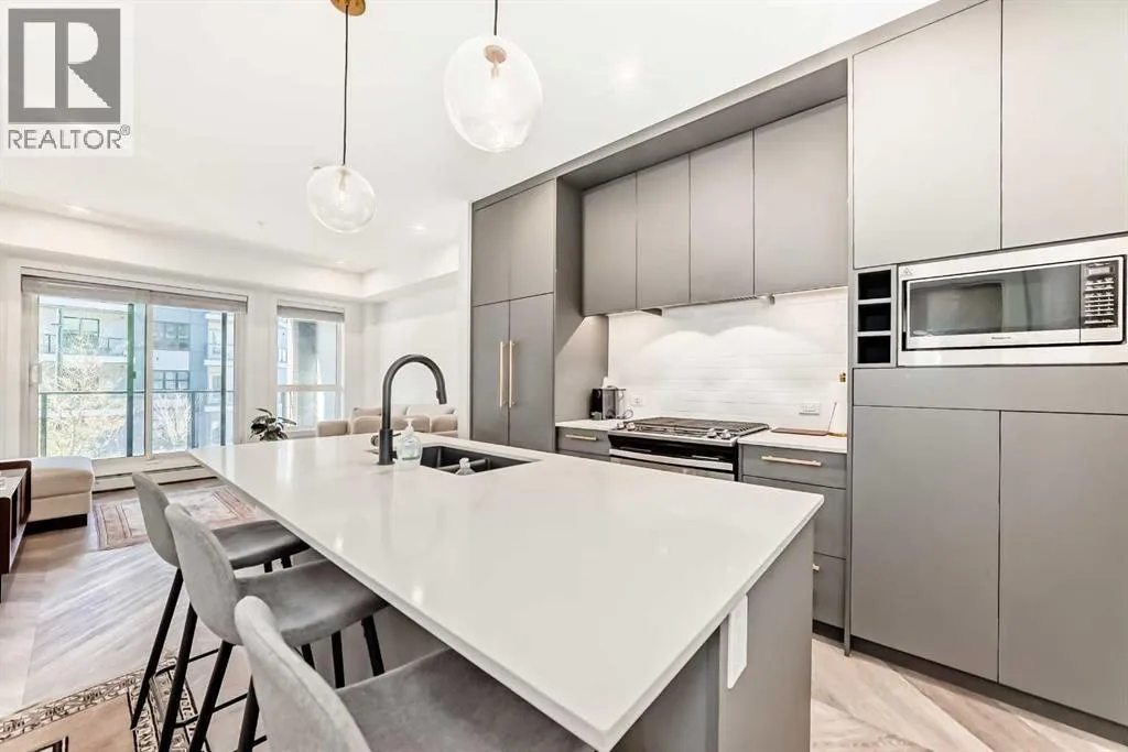 Prime University District Condo â Location and Lifestyle!Welcome to this beautifully designed 2nd floor, 2-bedroom, 1-bathroom condo located just minutes from the University of Calgary, in the heart of the dynamic University District. This home is an exceptional opportunity for first-time buyers, investors, or anyone seeking a high-value, connected urban lifestyle in one of Calgary's premier communities.Step into a bright and spacious open-concept layout featuring large windows in the living room that optimize natural light. The contemporary kitchen is a chef's delight, boasting luxurious quartz countertops, full-height cabinetry, built-in and stainless steel appliancesâperfect for daily living and hosting guests. Both bedrooms are generously sized, offering excellent privacy and comfort with a sleek modern bathroom.Ownership includes your own spacious private balconyâideal for morning coffee or relaxing eveningsâas well as the indispensable convenience of in-suite laundry and a highly valuable titled underground parking stall and assigned storage locker.As an owner, you gain the convenience of being steps from shops, cafes, green spaces, and public transit. With the University of Calgary just a short walk or bike ride away, this investment offers unmatched lifestyle and location appreciation potential.Donât miss your chance to own a stunning, turnkey condo in the sought-after University District. Start building equity today! (id:27476)