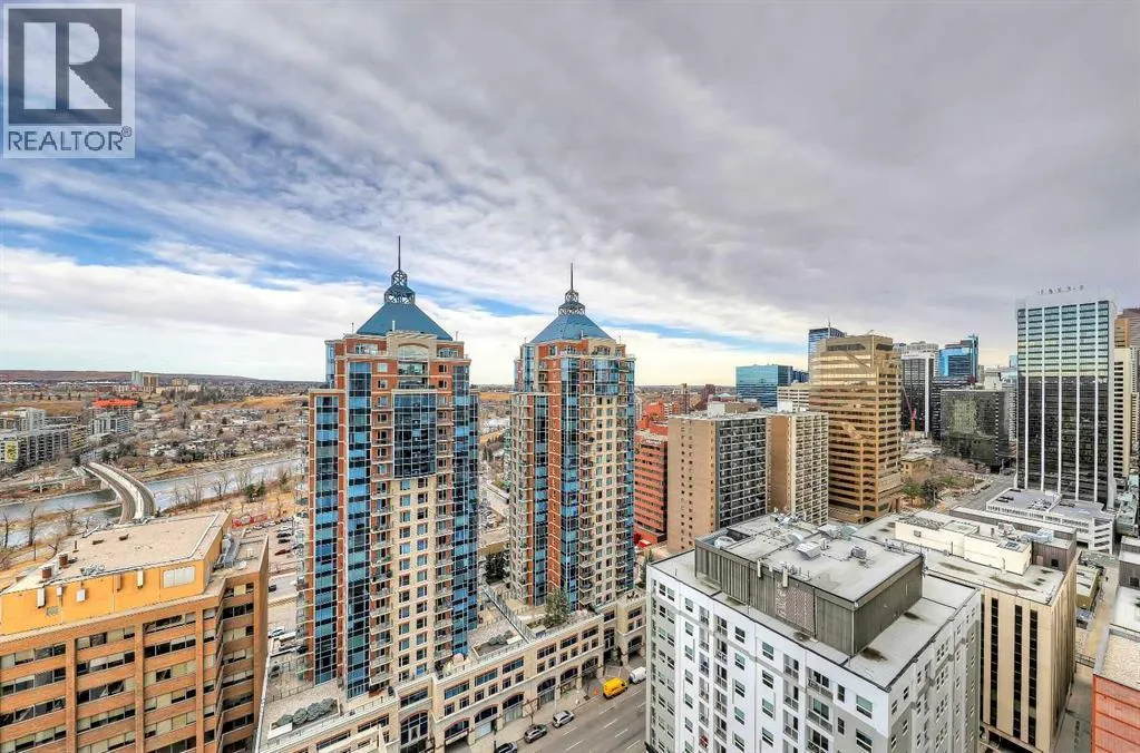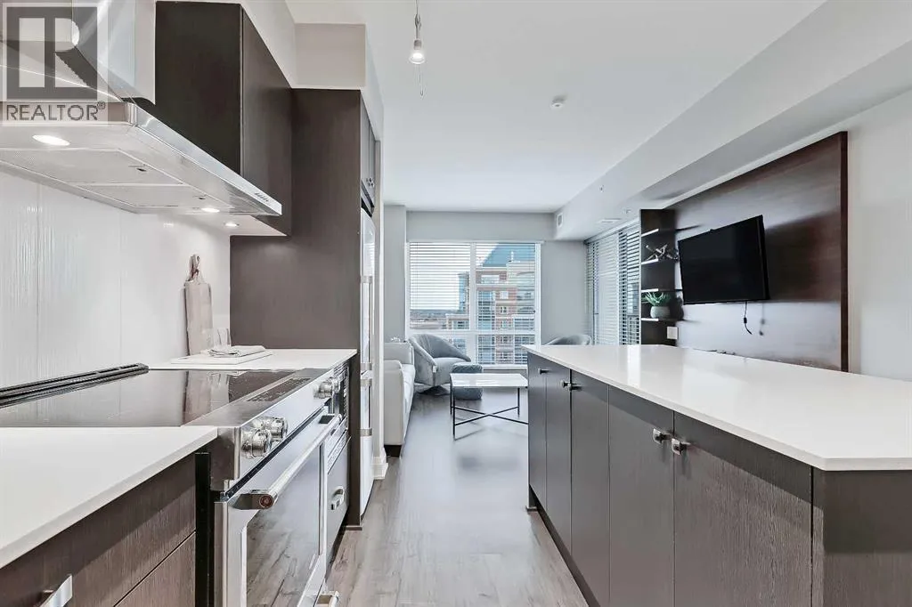 *VISIT MULTIMEDIA LINK FOR FULL DETAILS, INCLUDING IMMERSIVE 3D TOUR & FLOORPLANS!* This bright NORTH-facing 1-bed + den unit with stunning PANORAMIC RIVER VIEWS from the 24th floor in the upscale Vogue building is a must-see! There are only 4 upgraded floors in the Vogue building, which were specially customized for Bedouin Suites, and this is one of them! EXCLUSIVE BEDOUIN FEATURES include upgraded hallways and common areas, as well as INCREDIBLE UNIT UPGRADES like custom kitchen islands with bar seating, upgraded appliances & lighting including dimmers throughout, custom bedroom panelling including built-in side tables with convenience plugs, upgraded bathrooms with tile wainscoting and glass shower doors, built-in walnut entertainment units, a Smart Sensor energy management system for the eco-minded buyer and MORE! This customized âVARSITYâ floorplan also had a kitchen wall removed for improved flow and natural light, and WOW, does it look good! This condo presents modern living at its finest, including an open-concept layout filled with natural light through ample floor-to-ceiling windows, complemented by luxury vinyl plank flooring adorning the main living spaces. The modern kitchen boasts wood-grain cabinets with modern hardware and under-cabinet lighting, a specially designed central island with quartz counters, a tile backsplash, a dual-basin undermount sink, and upgraded stainless steel appliances, including a chimney-style hood fan. The open main living area features a built-in walnut entertainment unit with a wall-mount TV included and access to a large balcony with a gas line for a BBQ and panoramic views of the Bow River. The bedroom features custom wall panelling with built-in side tables, wall sconce lighting and a convenient receptacle with a USB port, plus an included wall-mounted TV. A large walkthrough closet with built-in organizers and a stacked laundry leads to the 4-pc bathroom complete with occupancy-sensored lights, quartz countertops, tile wainscoting, an undermount sink with modern faucet, tile backsplash, modern vanity with storage, tile floors, and a large tub/shower combo with full height tile and an upgraded glass door. Additionally, a sizable den makes the perfect home office or flexible space. VOGUE is a high-end building with a ton of amenities, including UNDERGROUND HEATED PARKING, central A/C, an elegant formal lobby, full-time concierge, gym, billiards, a large party room with a kitchen, a yoga studio, a Sky Lounge on the 36th floor, and multiple rooftop terraces. Surrounded by parks, transit, the LRT, shopping & more, & within walking distance to the downtown core & all Kensington shops & services â this location offers the best urban lifestyle in the Downtown Commercial Core. (id:27476)