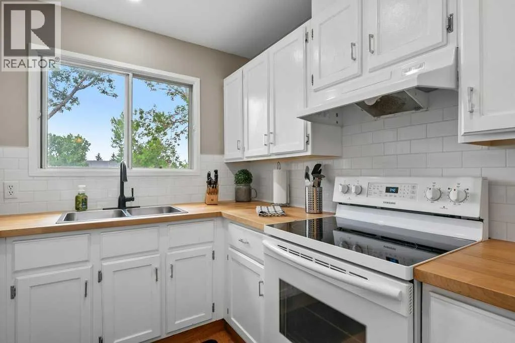 This beautifully updated single family home checks all the boxes. With over 1,600 sq ft of developed living space and multiple updates, this is your chance to get into a fantastic turnkey home in an established NW community. Fresh paint and trim throughout. Updated kitchen highlighted by white shaker style cabinetry, butcher block countertops, classic subway tile backsplash and modern white appliances. The main level is complete with dining nook and a cozy living room showcasing a wood burning fireplace. 3 bedrooms on the upper level all with updated closets. Both the upper and lower-level bathrooms have been updated with furniture style vanities, updated fixtures, custom tile flooring, separate tiled shower, and tiled soaker tub surround. Convenient Murphy Bed in the 3rd bedroom allows you to convert to an office space or use as guest room when needed. Updated lush carpet and underlay on the upper and lower levels. A large sprawling family room occupies the 3rd level and offers many flexible uses and includes the second full bath. Step outside to BBQ in your private south facing backyard which also includes a concrete patio to enjoy the summer months. The recent oversized single garage is insulated and drywalled. The exterior siding and roof shingles have just been completed featuring smart trim around all windows. Bonus feature, the popcorn ceilings have been removed and replaced with new knockdown ceilings. Updated high efficiency furnace and hot water tank. Close proximity to Nose Hill Park, schools, and shopping. Great value in this turnkey home! (id:27476)