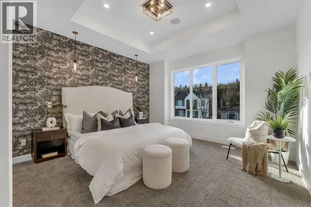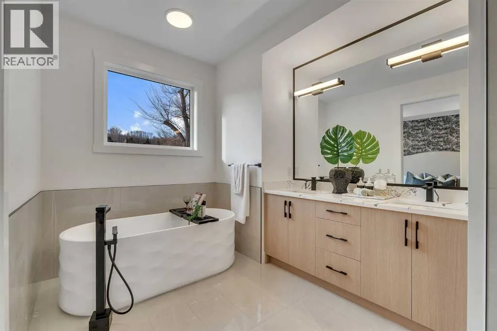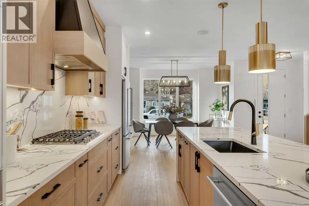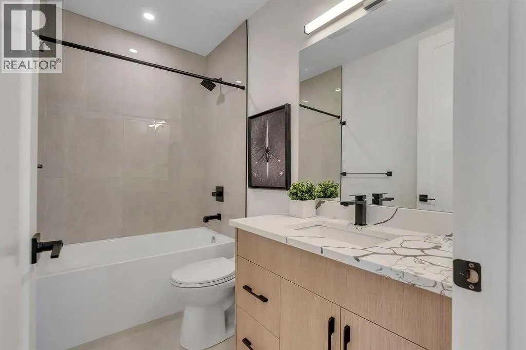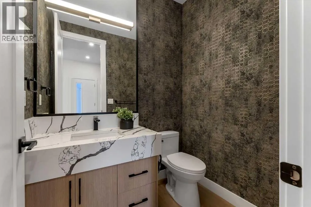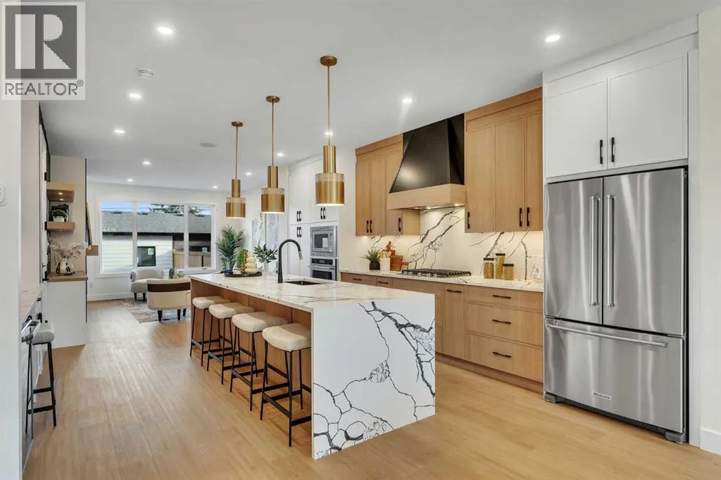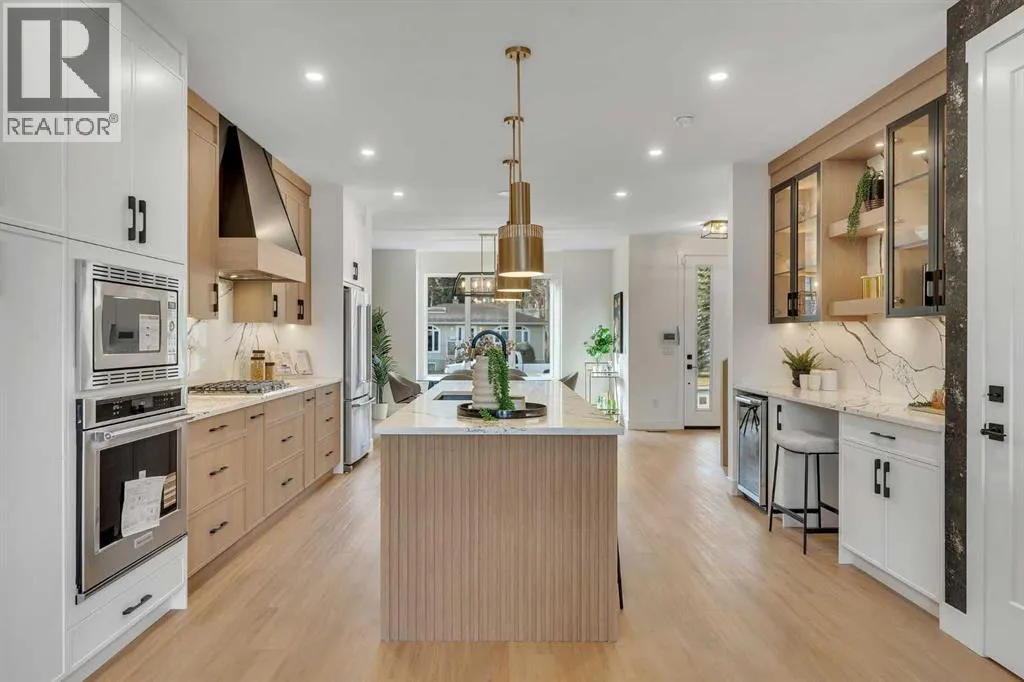 Discover the epitome of modern living in this impeccably located home! Nestled on a quiet street, steps from Bowness Park and next to a school, this 5-bedroom, 3.5-bath residence offers over 2800 sqft of luxury. The home showcases countless upgrades, including a CUSTOM UPGRADED QUARTZ BACKSPLASH throughout. The gourmet kitchen features a stainless steel KitchenAid package with built-in wall oven & microwave, double-door fridge with waterline, dishwasher, custom canopy hood fan, plus a large island with custom slat design and quartz waterfall, pantry, pull-outs, quartz counters, under-cabinet lighting, and custom cabinetry. The main floor also includes a formal dining area, living room with custom built-ins & fireplace, and a designer mudroom with bench & storage. Upstairs, youâll find two spacious bedrooms, a laundry room with sink, a full bath, a bonus room with 10ft tray ceiling, and a luxurious master retreat with 10ft tray ceiling, a vast custom walk-in closet, and a spa-inspired ensuite featuring a freestanding tub, double vanity, and custom-tiled shower. The fully developed LEGAL basement suite offers spacious open-concept living with a bright living room enhanced by a large window, a dining area, and a custom kitchen complete with quartz backsplash, microwave hoodfan, breakfast bar, and ample counter space. It also features two large bedrooms, stacked laundry, and a full bathroom with a tiled surround shower. Exterior highlights include custom concrete steps, walkways, and patio, full landscaping, new fencing, BBQ gasline, and a private backyard area designed for basement tenants to enjoy. Additional features: 9ft ceilings on all levels, 8ft doors, flat painted ceilings (main & upper), knockdown basement ceilings, smart home wiring, upgraded lighting, custom faucets, central vac rough-in, AC rough-in, and CAT 5 wiring. A true blend of craftsmanship and intelligent design, this home is a must-see. Donât miss this opportunityânext door unit 8718 is also availab le! (id:27476)