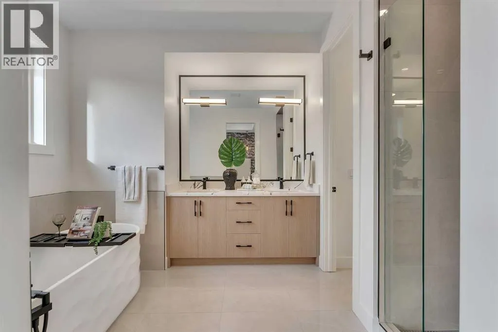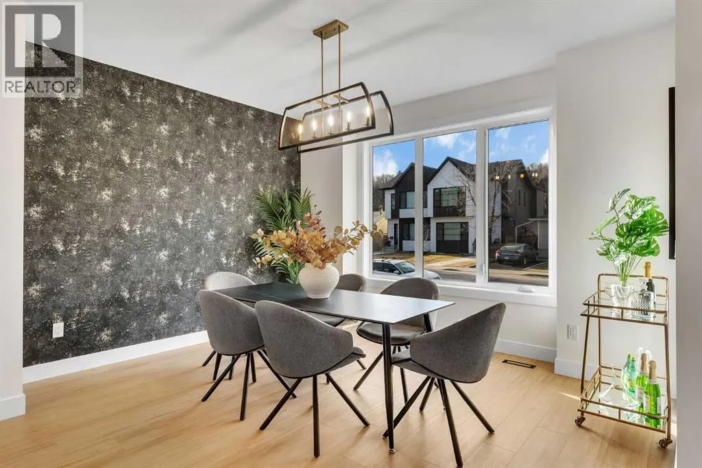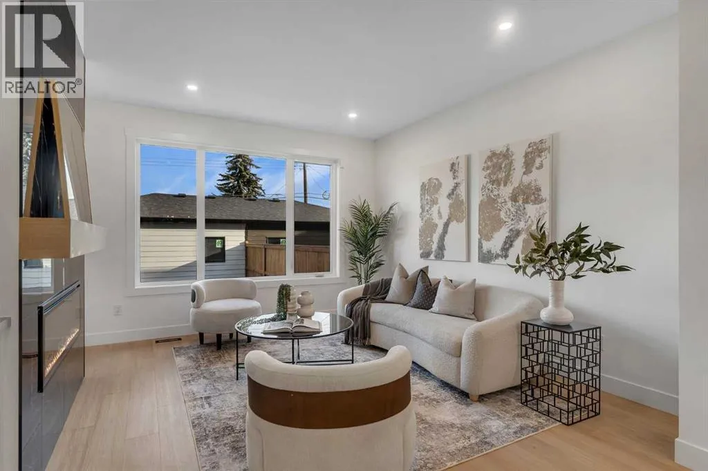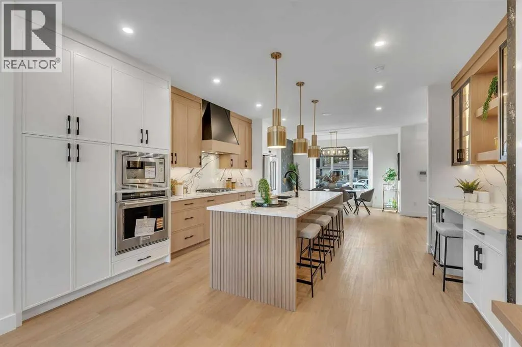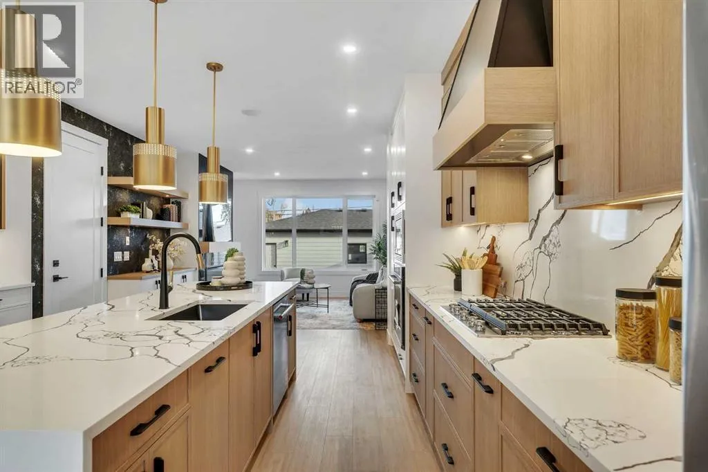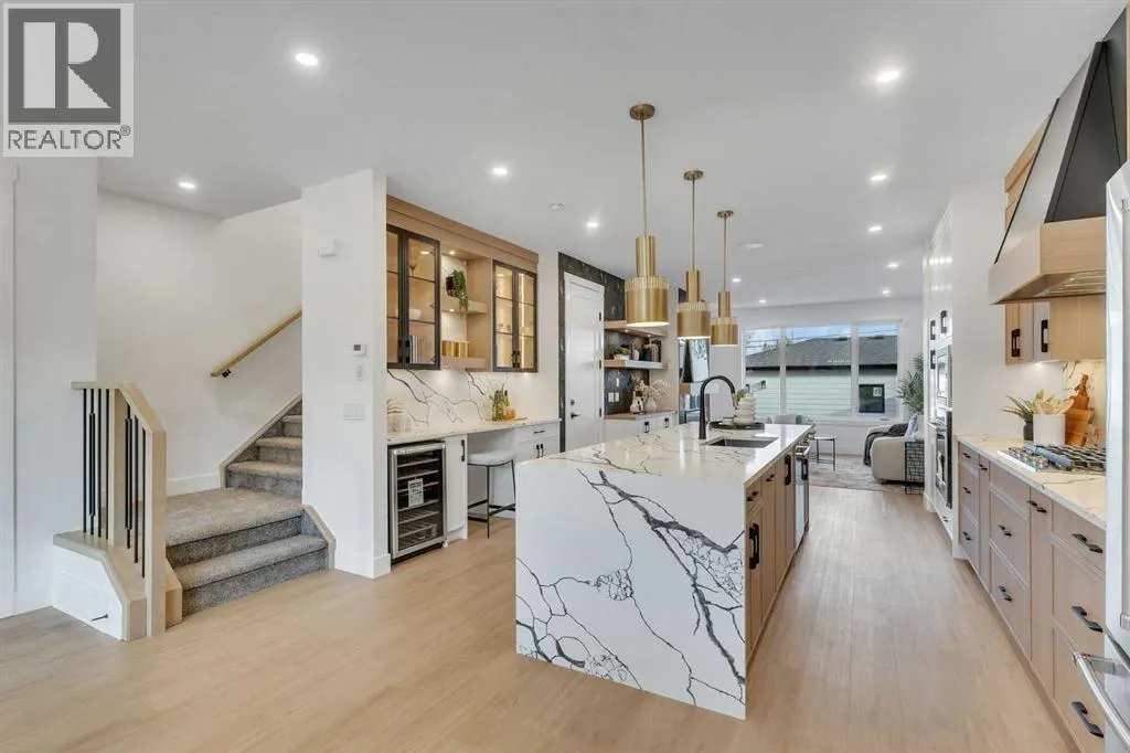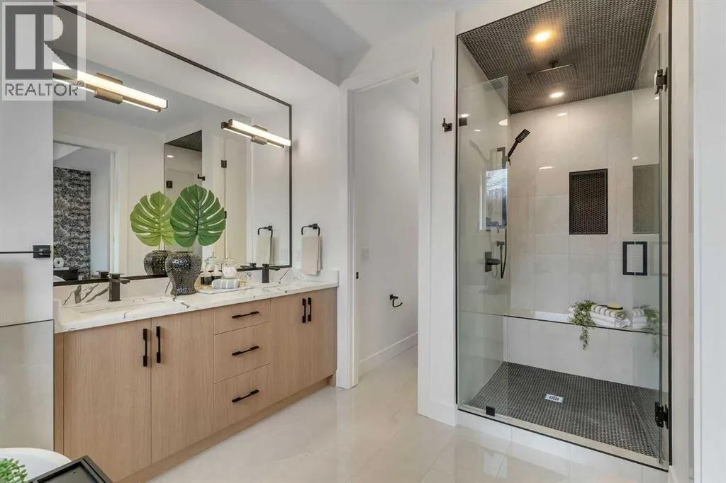 Discover the epitome of modern living in this impeccably located home! Nestled on a quiet street, steps from Bowness Park and next to a school, this 5-bedroom, 3.5-bath residence offers over 2800 sqft of luxury. The home showcases countless upgrades, including a CUSTOM UPGRADED QUARTZ BACKSPLASH throughout. The gourmet kitchen features a stainless steel KitchenAid package with built-in wall oven & microwave, double-door fridge with waterline, dishwasher, custom canopy hood fan, plus a large island with custom slat design and quartz waterfall, pantry, pull-outs, quartz counters, under-cabinet lighting, and custom cabinetry. The main floor also includes a formal dining area, living room with custom built-ins & fireplace, and a designer mudroom with bench & storage. Upstairs, youâll find two spacious bedrooms, a laundry room with sink, a full bath, a bonus room with 10ft tray ceiling, and a luxurious master retreat with 10ft tray ceiling, a vast custom walk-in closet, and a spa-inspired ensuite featuring a freestanding tub, double vanity, and custom-tiled shower. The fully developed LEGAL basement suite offers spacious open-concept living with a bright living room enhanced by a large window, a dining area, and a custom kitchen complete with quartz backsplash, microwave hoodfan, breakfast bar, and ample counter space. It also features two large bedrooms, stacked laundry, and a full bathroom with a tiled surround shower. Exterior highlights include custom concrete steps, walkways, and patio, full landscaping, new fencing, BBQ gasline, and a private backyard area designed for basement tenants to enjoy. Additional features: 9ft ceilings on all levels, 8ft doors, flat painted ceilings (main & upper), knockdown basement ceilings, smart home wiring, upgraded lighting, custom faucets, central vac rough-in, AC rough-in, and CAT 5 wiring. A true blend of craftsmanship and intelligent design, this home is a must-see. Donât miss this opportunityânext door unit 8718 is also availab le! (id:27476)