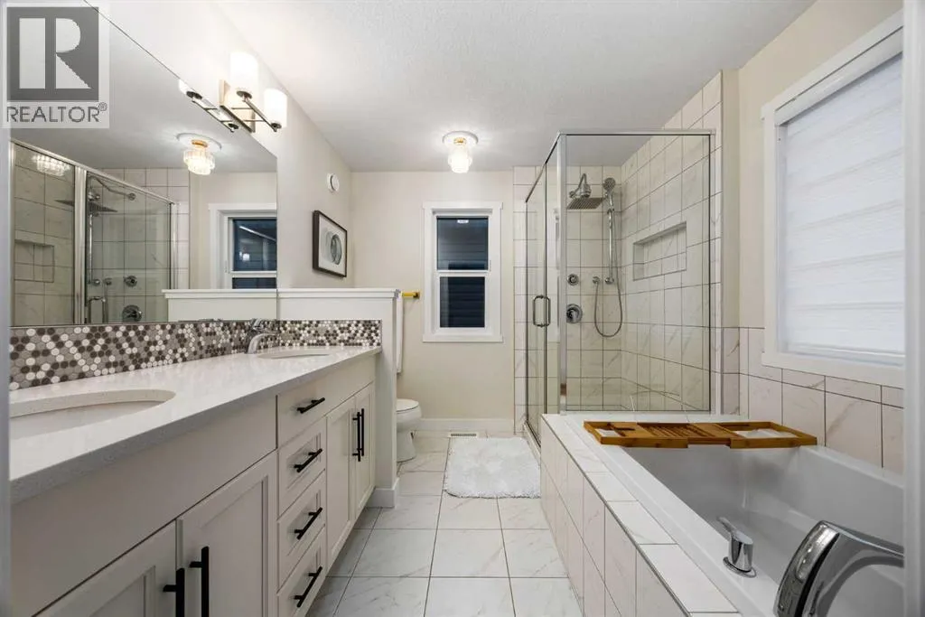 Welcome to 196 Belmont Terrace SW, a stunning front-attached garage home with a legal suite and countless upgrades. Offering over 2,600 sq. ft. of stylish, functional living space, this 5-bedroom, 3.5-bath property combines comfort, versatility, and income potential in one of Belmontâs most desirable locations. The main level features luxury vinyl plank flooring, fresh paint (2024), all-new designer light fixtures (2024), and a bright open-concept layout with a chef-inspired kitchen showcasing quartz countertops, full-height cabinetry, premium stainless steel appliances including a gas cooktop, and a large island with bar seating. The inviting living room with an electric fireplace and the elegant dining area flow seamlessly to the backyard and composite deck, perfect for entertaining. Upstairs offers three generous bedrooms including a spacious primary retreat with a walk-in closet and spa-like ensuite with quartz dual vanities, a soaker tub, and a glass-enclosed shower, plus a bonus room, laundry room, and full bath. The fully developed legal basement suite, complete with its own entrance, modern kitchen, stainless steel appliances, luxury vinyl plank flooring, and quartz finishes, can function as a profitable two-bedroom rental or as a fully licensed dayhome in accordance with current regulationsâboth highly sought-after options given its location backing directly onto a playground. Additional 2024 upgrades include central air conditioning, Gemstone permanent exterior lighting, and fresh modern paint throughout. With a double attached garage, elegant curb appeal, and proximity to parks, schools, shopping, dining, and transit, this beautifully maintained home is ideal for multi-generational living, investment, or simply enjoying the best of Belmont. Book your private showing today! (id:27476)