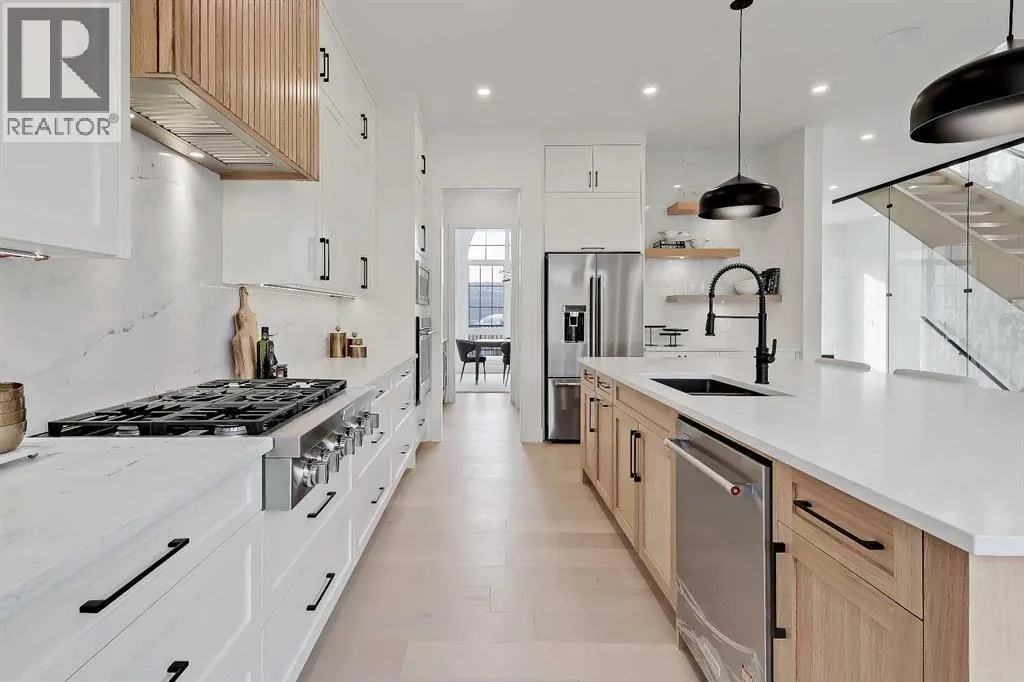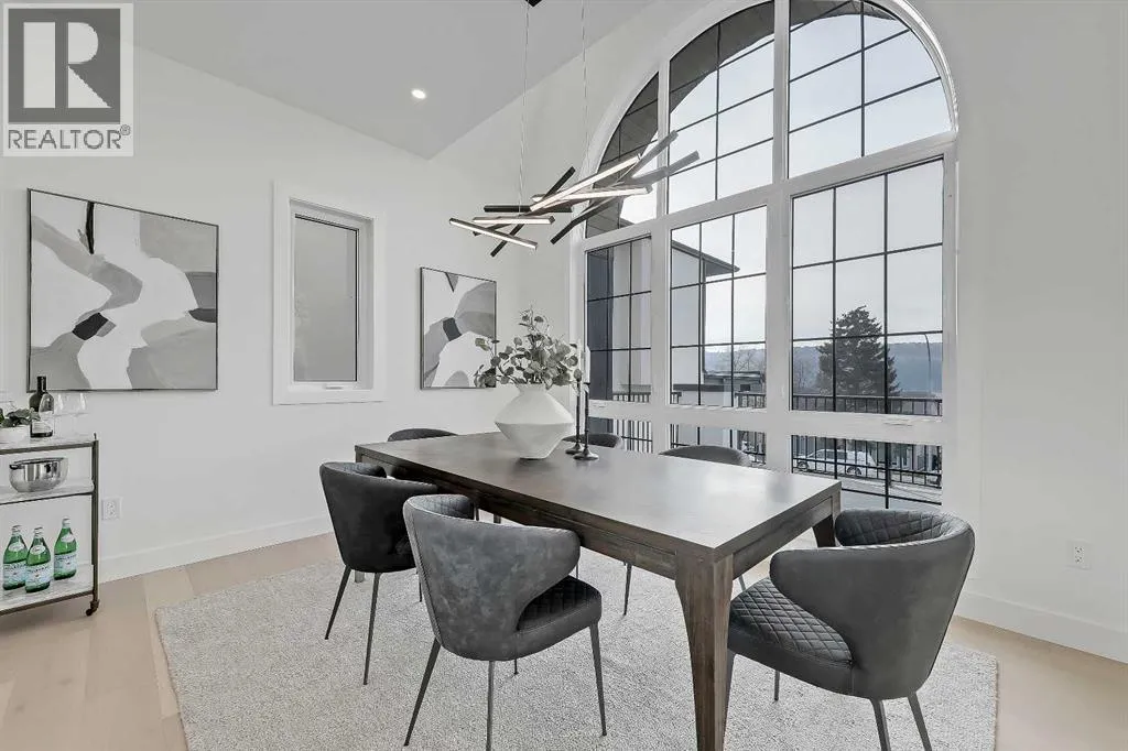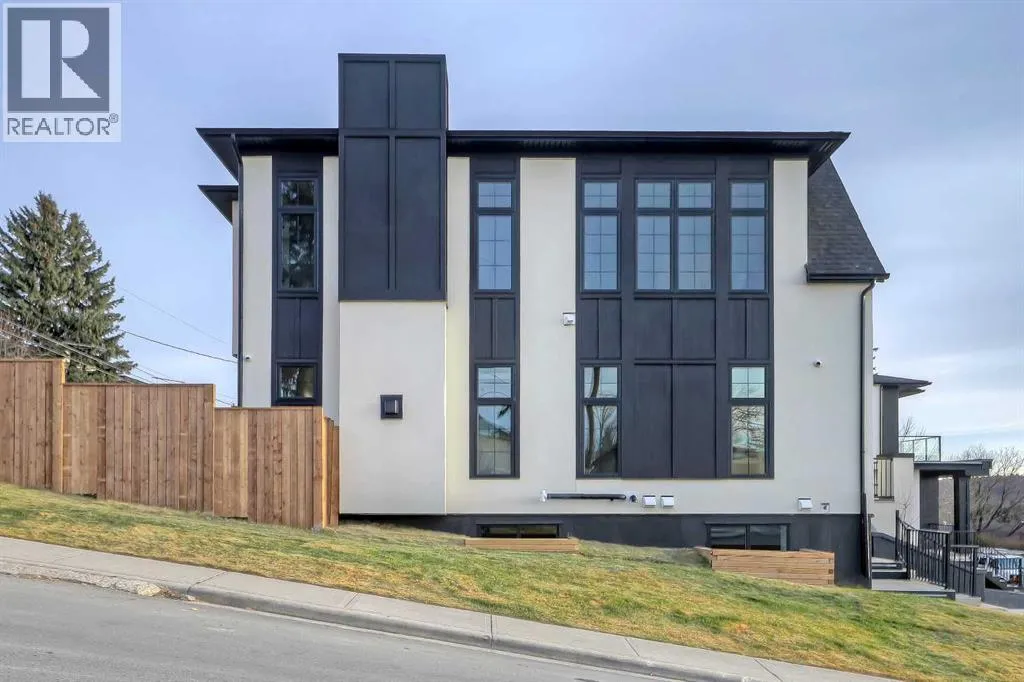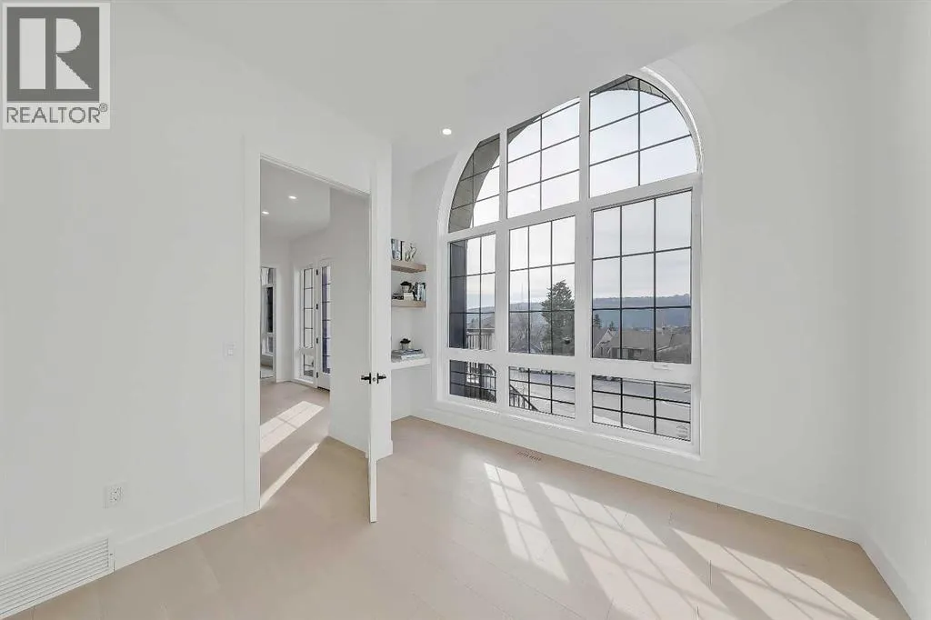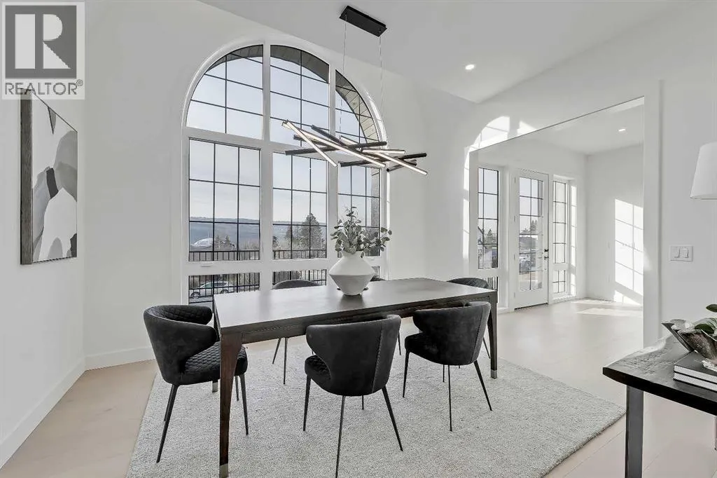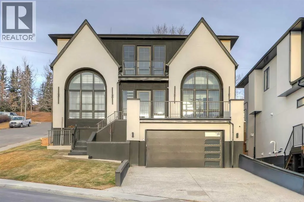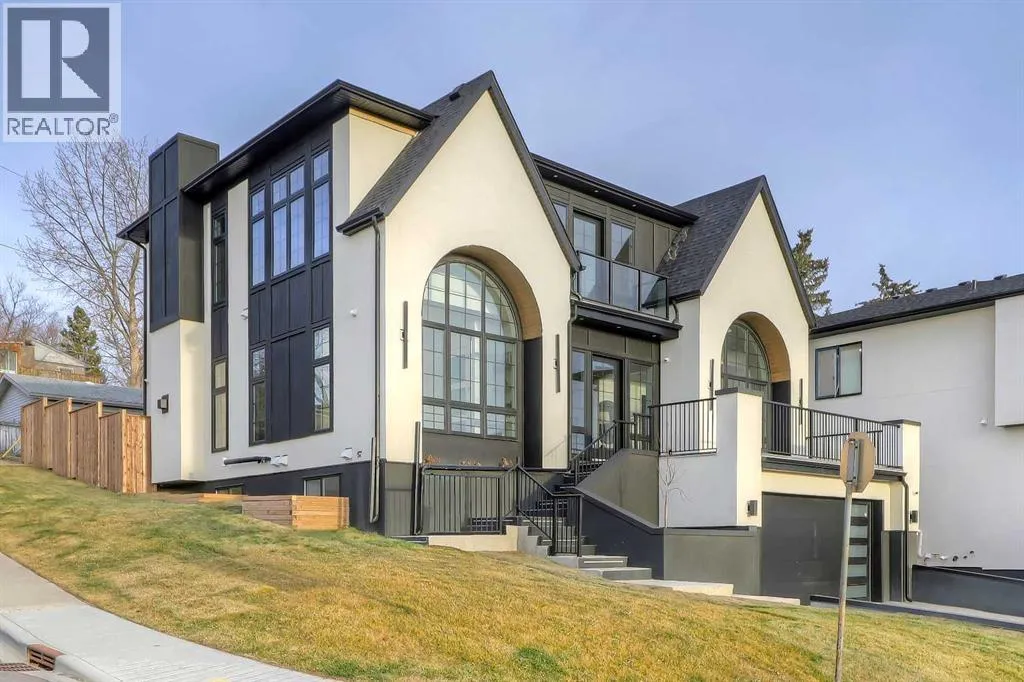 Perched high above the river valley in MONTGOMERY, this newly built estate home by NX HOMES blends bold architectural design with sweeping west-facing views and refined, contemporary comfort. Every detail has been thoughtfully curatedâfrom the striking arched windows that flood the interior with natural light to the custom oak staircase and the cohesive balance of texture, tone, and proportion that defines each space. This is a home that feels both commanding and sereneâa perfect match for its hillside setting just minutes from Market Mall, the University of Calgary, and the cityâs vibrant northwest core. Inside, soaring 10-foot ceilings and a gallery-style foyer set the tone for whatâs to come. The main level is anchored by a CHEFâS KITCHEN designed for gathering and performance, featuring waterfall-edge stone counters, high-end stainless steel appliances, and a large central island with seating for casual conversation. The BUTLERâS PANTRY offers extended prep and storage space, while the open-concept layout connects seamlessly to the dining area and a sunlit great room warmed by a modern gas fireplace. Oversized west windows frame mountain views, and double doors extend the living space outdoors to a generous upper deckâperfect for summer evenings and golden-hour sunsets. A front office, stylish powder room, and discreet storage complete this level with purpose and grace. Upstairs, three BEDROOMS WITH IN-FLOOR HEATED ENSUITES create private retreats for family and guests alike. The PRIMARY SUITE captures the west horizon with expansive windows and vaulted ceilings, a custom walk-in closet with built-ins, and a SPA-INSPIRED ENSUITE featuring a freestanding soaker tub, dual vanities, and an oversized glass-enclosed shower. A front-facing BONUS ROOM provides additional flexibility for a reading nook or play space, while the full-size LAUNDRY ROOM with sink keeps the upper level as functional as it is refined. The FULLY FINISHED WALK-OUT BASEMENT extends the homeâs li ving and entertaining potential. Here, a sleek WET BAR opens to a spacious recreation and movie areaâan ideal backdrop for game nights and gatherings. Thereâs also a fourth bedroom with a nearby full bath, a dedicated MUDROOM WITH BUILT-INS, and a rough-in for IN-FLOOR HEATING to keep every corner warm through Calgaryâs winters. Every element of this property reflects craftsmanship and quality, from the ENERGY-EFFICIENT SYSTEMS and superior insulation to the TRIPLE ATTACHED GARAGE with R/I for gas heater and the low-maintenance landscaped exterior. Outdoor lighting highlights the homeâs modern architecture, while the tiered front approach and private rear yard enhance curb appeal and usability. In a community prized for its views, parks, and proximity to downtown, this home stands apartânot just for its design, but for how it lives. Elegant yet welcoming, contemporary yet timeless, itâs the rare opportunity to own a truly ONE-OF-A-KIND CUSTOM BUILD IN MONTGOMERY. (id:27476)