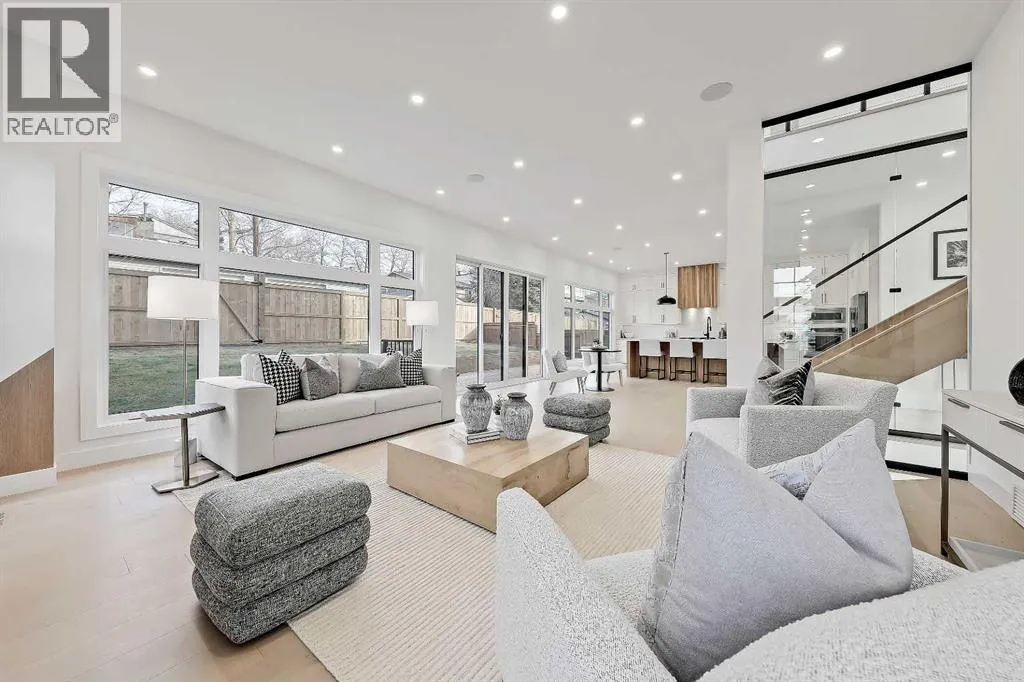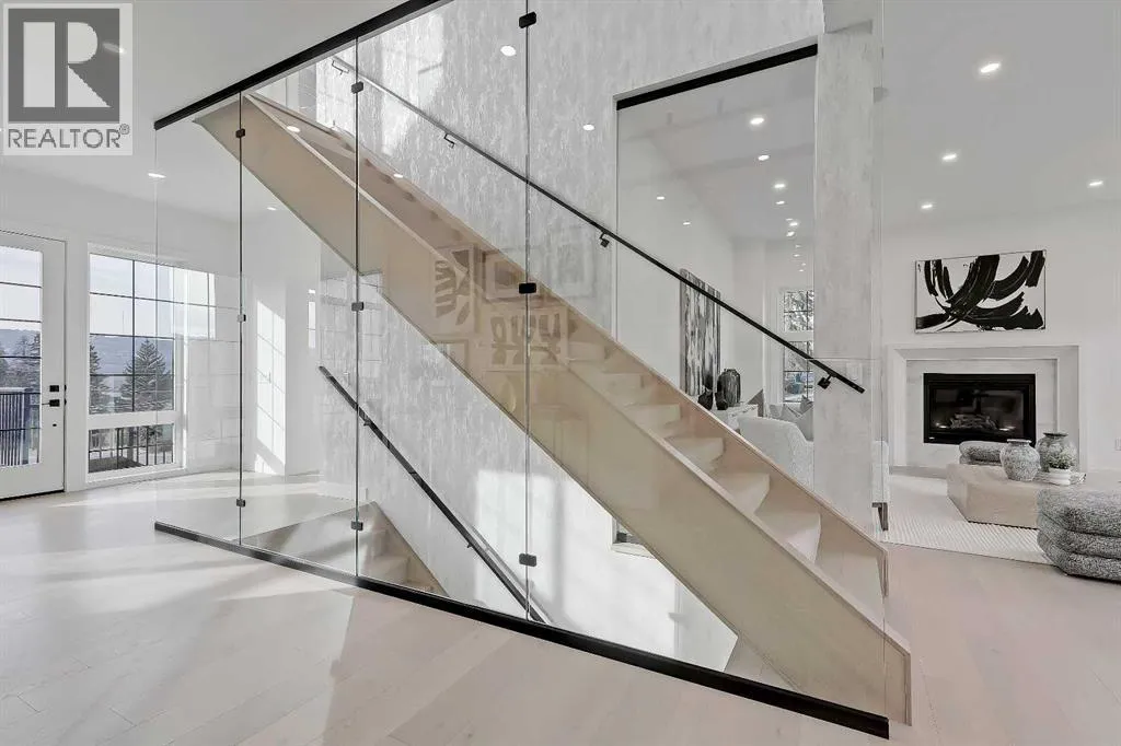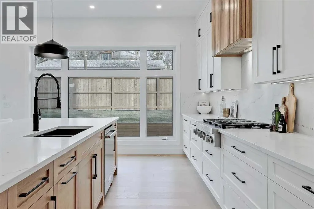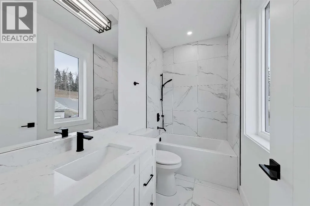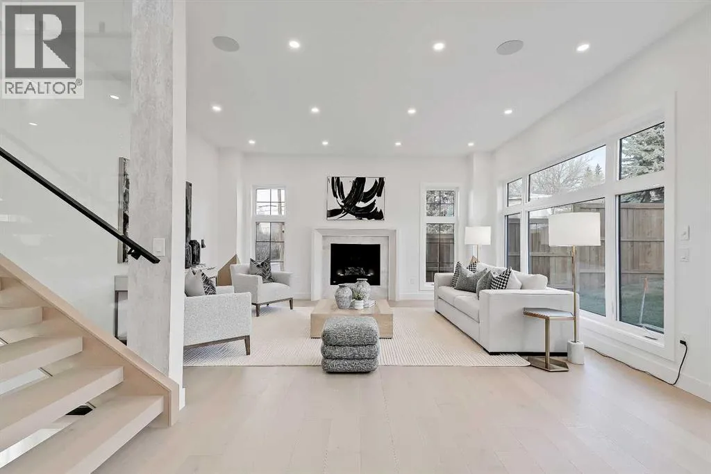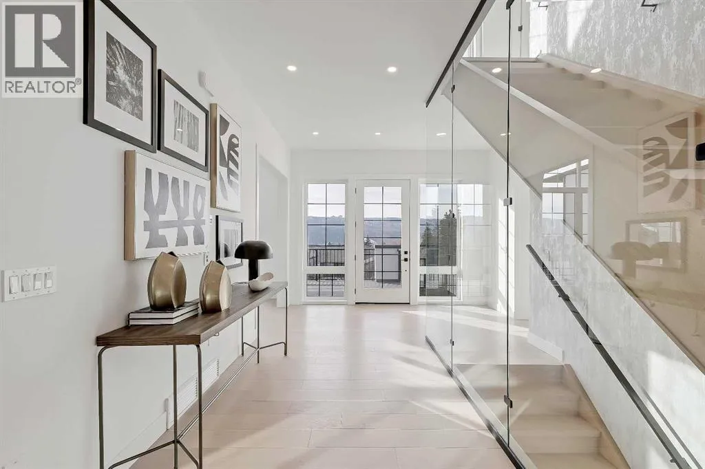 Perched high above the river valley in MONTGOMERY, this newly built estate home by NX HOMES blends bold architectural design with sweeping west-facing views and refined, contemporary comfort. Every detail has been thoughtfully curatedâfrom the striking arched windows that flood the interior with natural light to the custom oak staircase and the cohesive balance of texture, tone, and proportion that defines each space. This is a home that feels both commanding and sereneâa perfect match for its hillside setting just minutes from Market Mall, the University of Calgary, and the cityâs vibrant northwest core. Inside, soaring 10-foot ceilings and a gallery-style foyer set the tone for whatâs to come. The main level is anchored by a CHEFâS KITCHEN designed for gathering and performance, featuring waterfall-edge stone counters, high-end stainless steel appliances, and a large central island with seating for casual conversation. The BUTLERâS PANTRY offers extended prep and storage space, while the open-concept layout connects seamlessly to the dining area and a sunlit great room warmed by a modern gas fireplace. Oversized west windows frame mountain views, and double doors extend the living space outdoors to a generous upper deckâperfect for summer evenings and golden-hour sunsets. A front office, stylish powder room, and discreet storage complete this level with purpose and grace. Upstairs, three BEDROOMS WITH IN-FLOOR HEATED ENSUITES create private retreats for family and guests alike. The PRIMARY SUITE captures the west horizon with expansive windows and vaulted ceilings, a custom walk-in closet with built-ins, and a SPA-INSPIRED ENSUITE featuring a freestanding soaker tub, dual vanities, and an oversized glass-enclosed shower. A front-facing BONUS ROOM provides additional flexibility for a reading nook or play space, while the full-size LAUNDRY ROOM with sink keeps the upper level as functional as it is refined. The FULLY FINISHED WALK-OUT BASEMENT extends the homeâs li ving and entertaining potential. Here, a sleek WET BAR opens to a spacious recreation and movie areaâan ideal backdrop for game nights and gatherings. Thereâs also a fourth bedroom with a nearby full bath, a dedicated MUDROOM WITH BUILT-INS, and a rough-in for IN-FLOOR HEATING to keep every corner warm through Calgaryâs winters. Every element of this property reflects craftsmanship and quality, from the ENERGY-EFFICIENT SYSTEMS and superior insulation to the TRIPLE ATTACHED GARAGE with R/I for gas heater and the low-maintenance landscaped exterior. Outdoor lighting highlights the homeâs modern architecture, while the tiered front approach and private rear yard enhance curb appeal and usability. In a community prized for its views, parks, and proximity to downtown, this home stands apartânot just for its design, but for how it lives. Elegant yet welcoming, contemporary yet timeless, itâs the rare opportunity to own a truly ONE-OF-A-KIND CUSTOM BUILD IN MONTGOMERY. (id:27476)